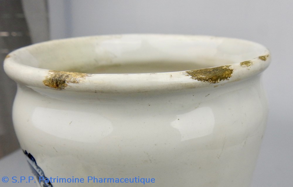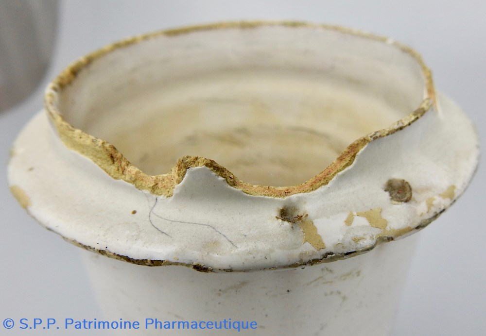 Le rebord supérieur de l'ouverture présente quelques éclats ainsi que le rebord inférieur de la base. Des défauts d'émaillage d'origine sont présents à l'arrière du pot et forment de larges tâches jaunâtres.