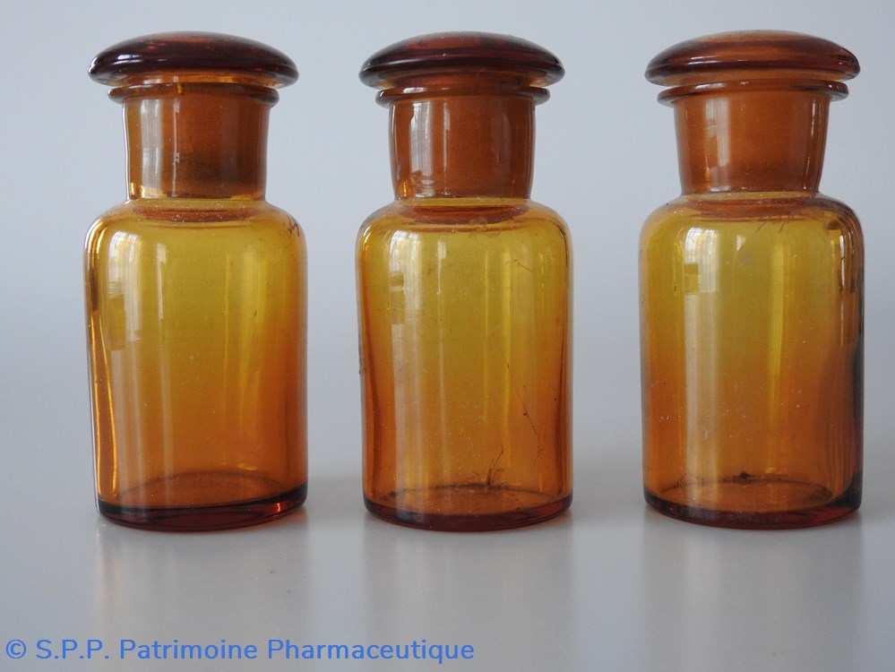 3 Flacons de pharmacie en verre ambré soufflé à goulot large, pouvant contenir des poudres, du liquide et même des comprimés.
