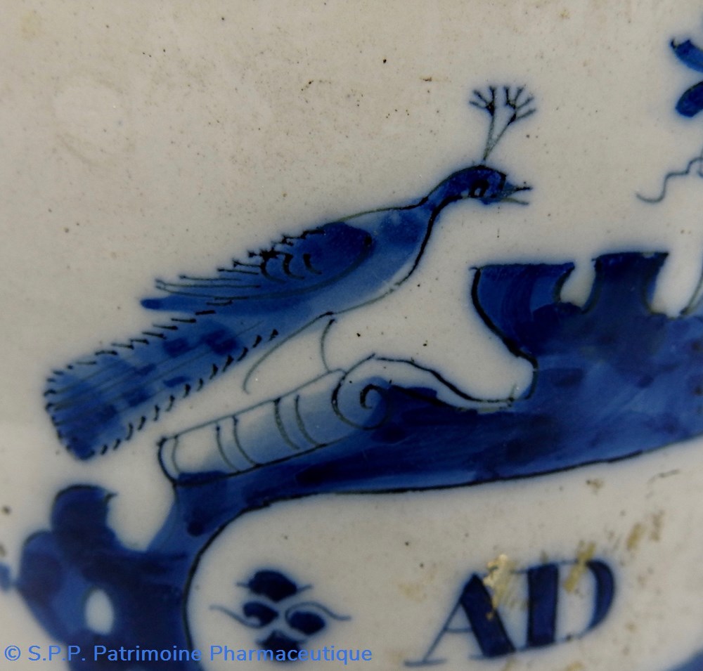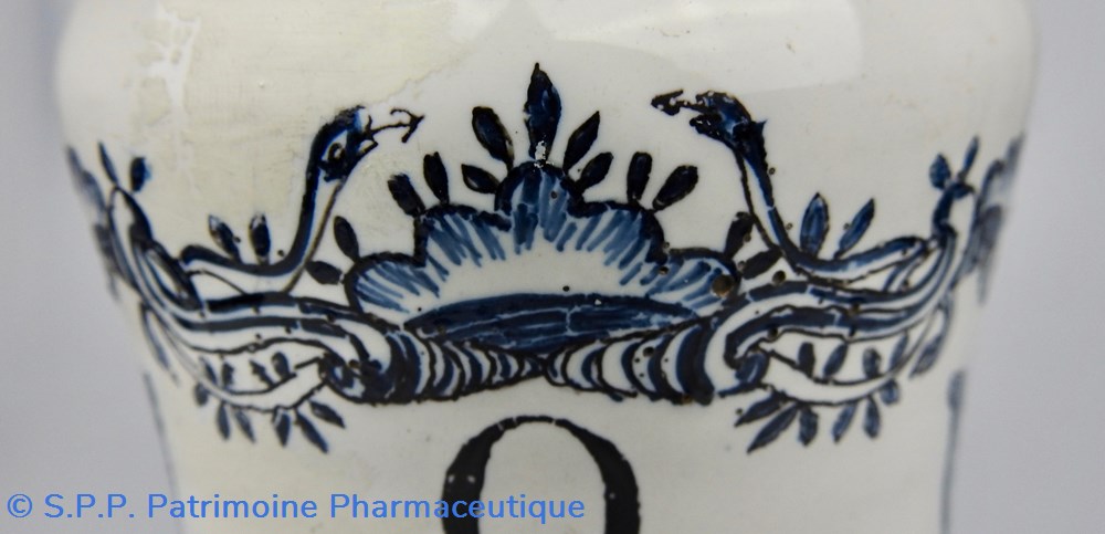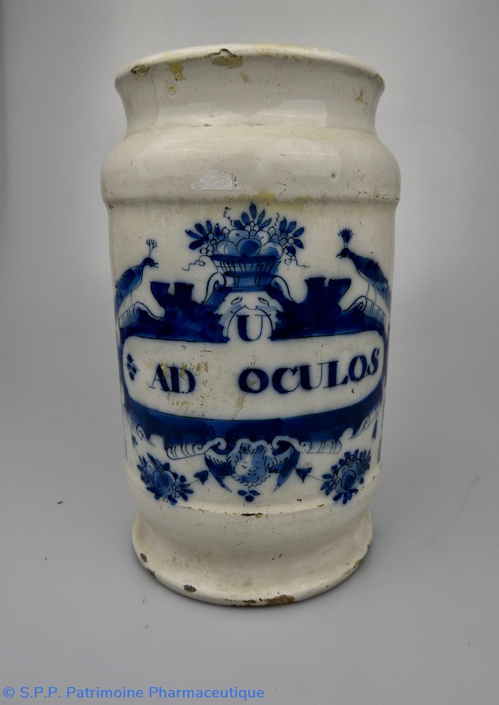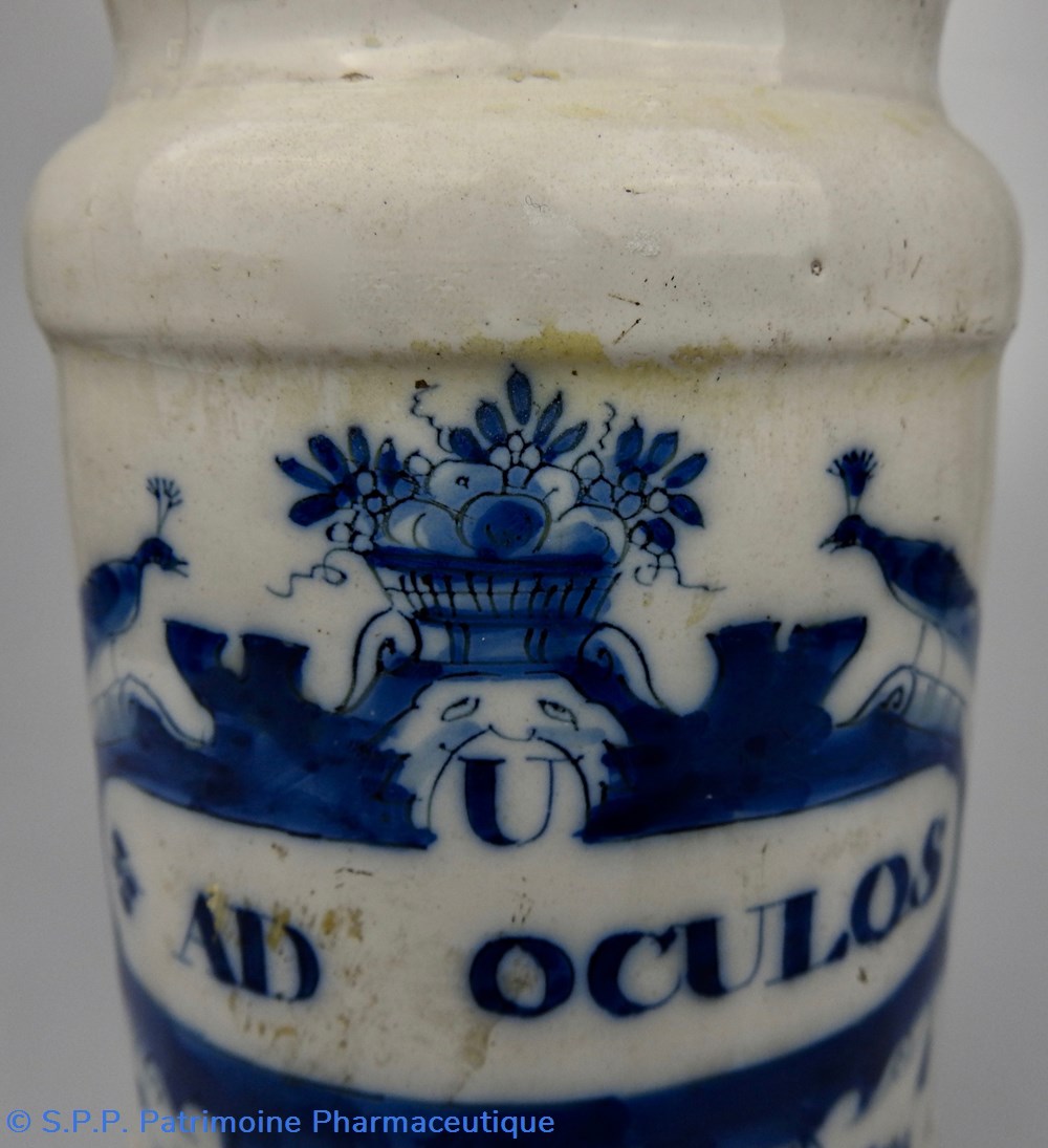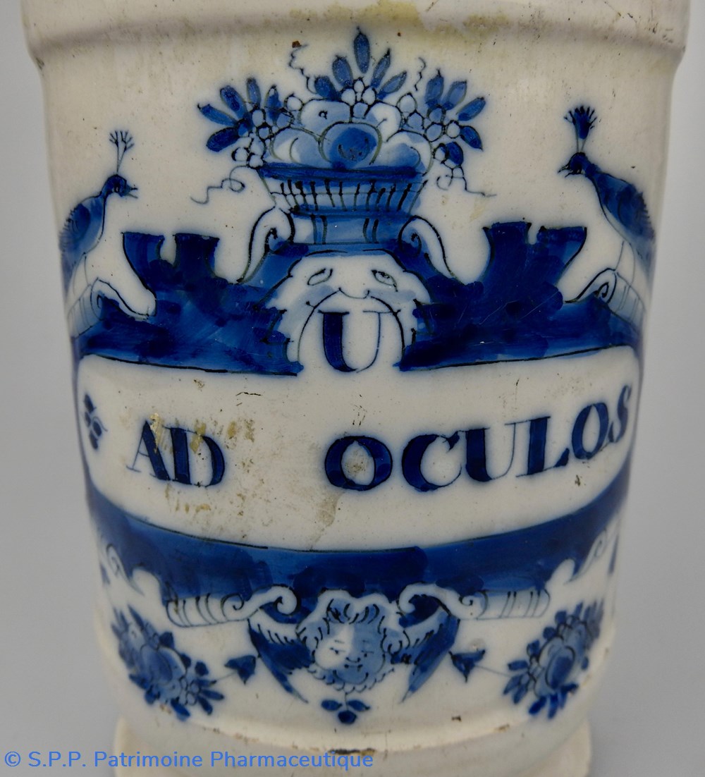DELFT. Pot de pharmacie à décor bleu. L'inscription "U AD OCULOS" (Unguentum nihili ad oculos)est entourée d'un décor bleu surmonté d'une corbeille de fleurs entourée de deux paons. A la partie inférieure une tête de satyre est représentée avec également des décors floraux de chaque côté. XVIIIème siècle