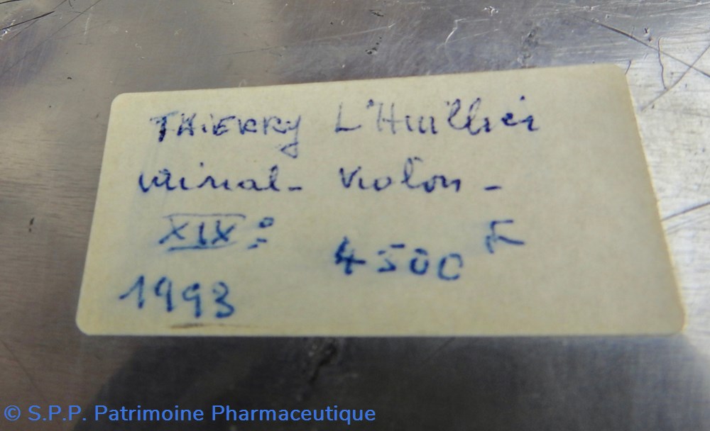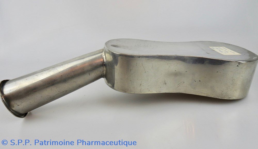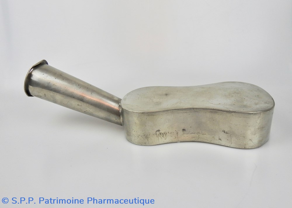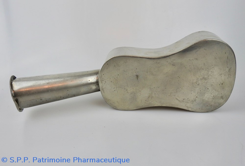 PARIS- Urinal en étain de forme violonnée à long déversoir tubulaire. Poinçon de R. Giovanna actif vers 1870 : rose couronnée/R.G. Fin du XIXème siècle.Trois petits impacts. Une ancienne étiquette collée en dessous, indique un collectionneur précédent, l'année et le montant de l'achat.