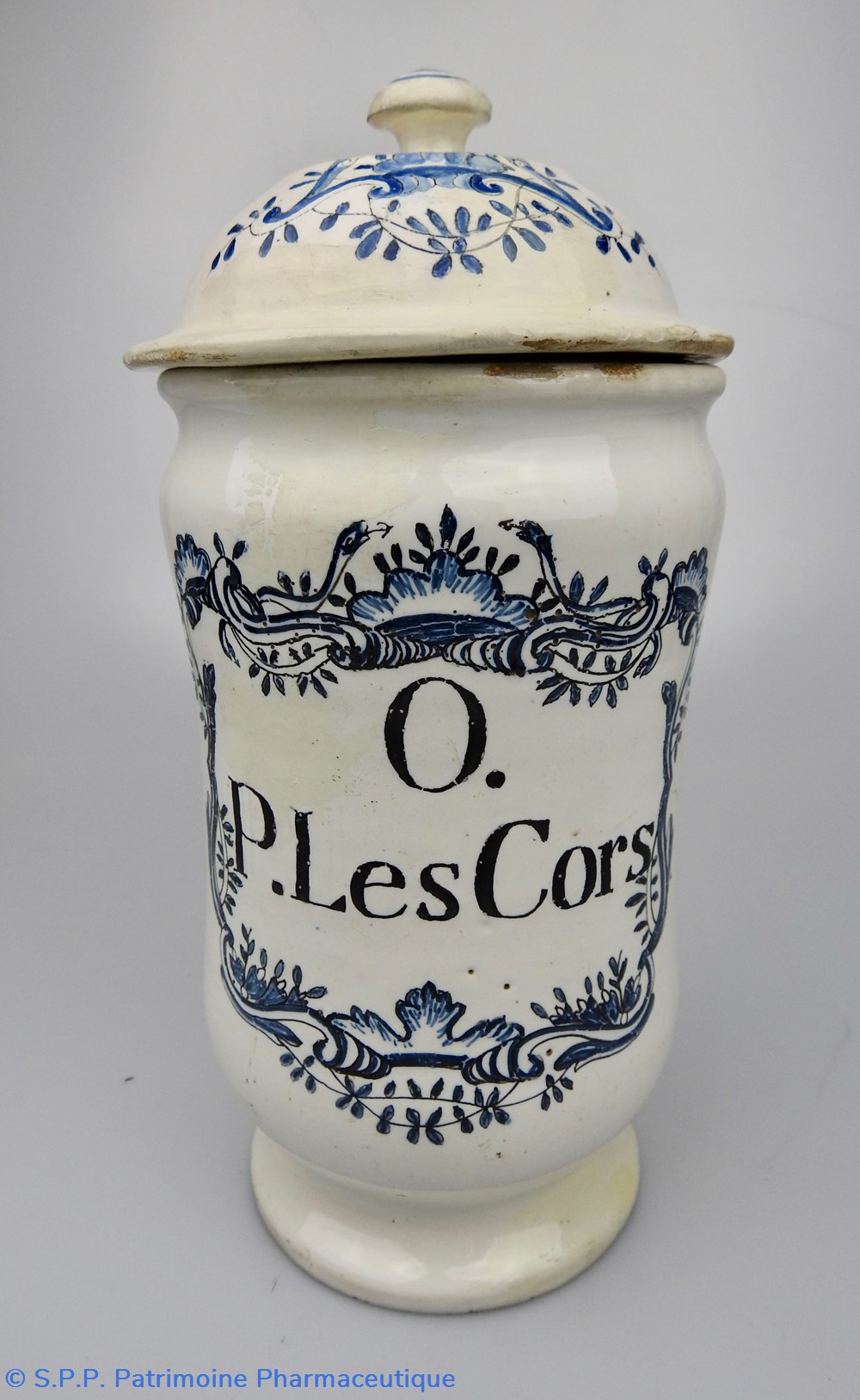 ROUEN Pot Canon couvert de Pharmacie en faïence à décor bleu et inscription manganèse. Le cartouche entourant l'inscription : "O.P.Les Cors" est de style rocaille et est surmonté de deux serpents ayant une langue stylisée en flèche. Le même motif est repris pour orner le couvercle dont le bouton de préhension est garni de deux anneaux bleus concentriques. Léger rétrécissement au centre du pot pour permettre une meilleure préhension comme pour les albarelles. Quelques éclats sur le rebord supérieur là où repose le couvercle. XVIIIème siècle. Expertisé par Philippe Boucaud.