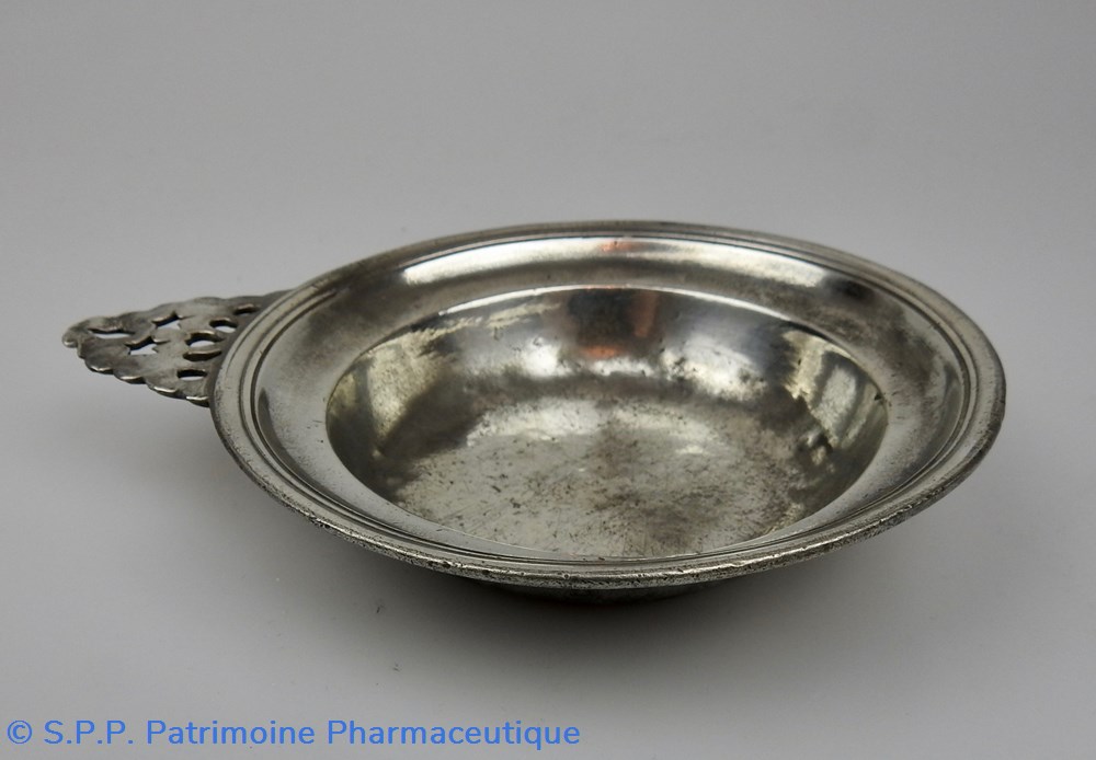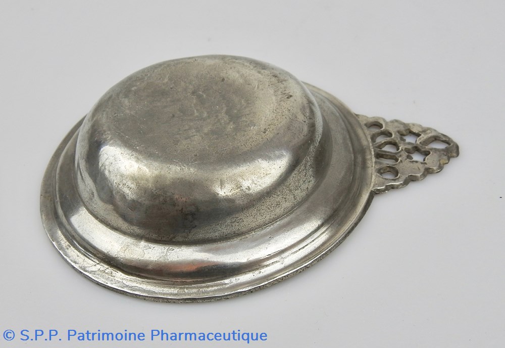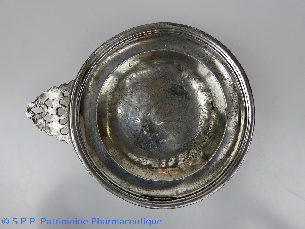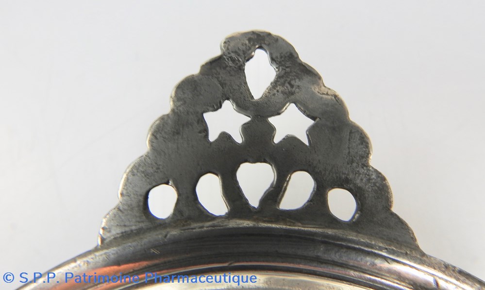 PARIS Palette à saigner en étain de forme circulaire à aile relevée et oreille polylobée ajourée. Cette oreille est percée de deux étoiles, ce qui indique que cette palette était destinée à recueillir le sang en deuxième position du recueil. (On prélevait toujours 3 palettes de sang pour faire un examen extemporané de ce liquide)