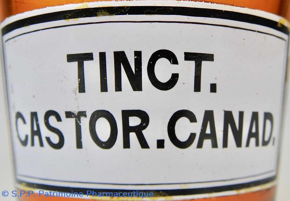 L'étiquette est émaillée et est de forme parallélipedique. L'inscription est encadrée par deux liserés noirs dont celui qui est extérieur est plus large. Inscription en lettres noires majuscules. Hauteur : 19 cm avec le bouchon. Corps principal cylindrique de 12 cm de haut.