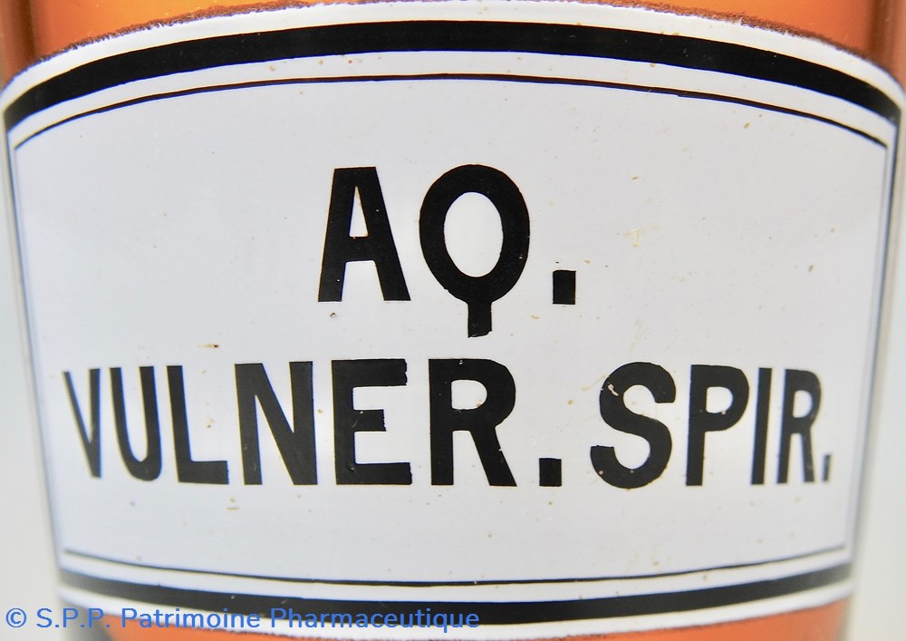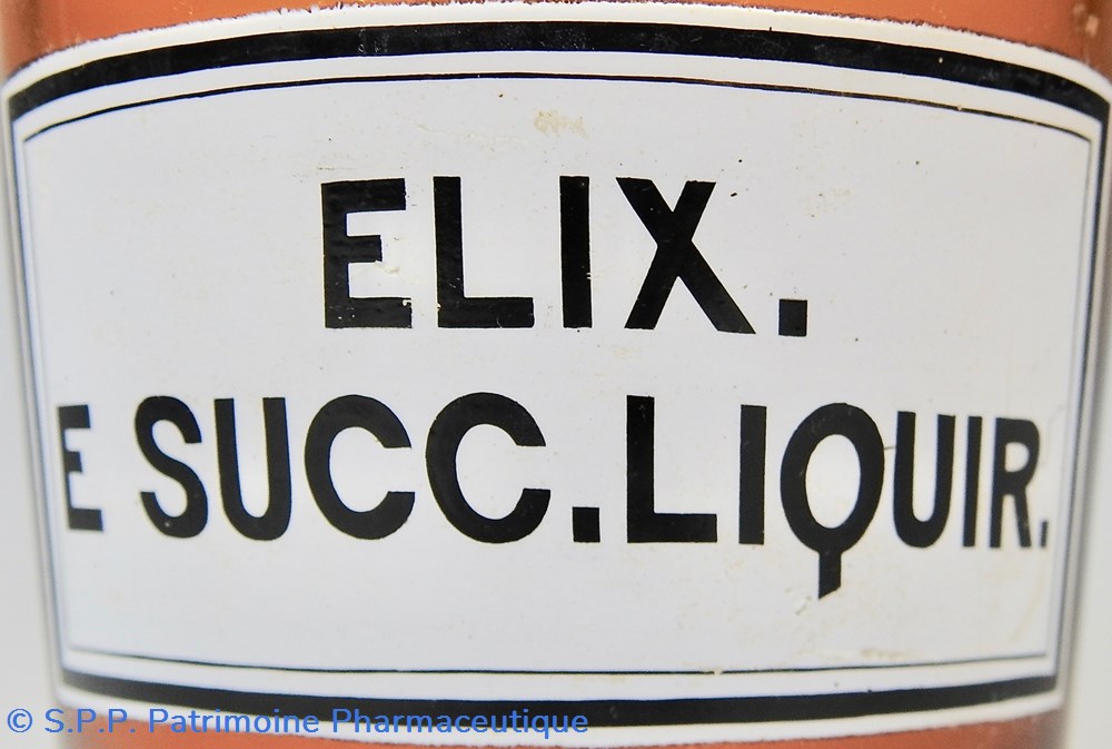 L'étiquette est émaillée et est de forme parallélipedique. L'inscription est encadrée par deux liserés noirs dont celui qui est extérieur est plus large. Inscription en lettres noires majuscules. Le goulot comporte une ébréchure.