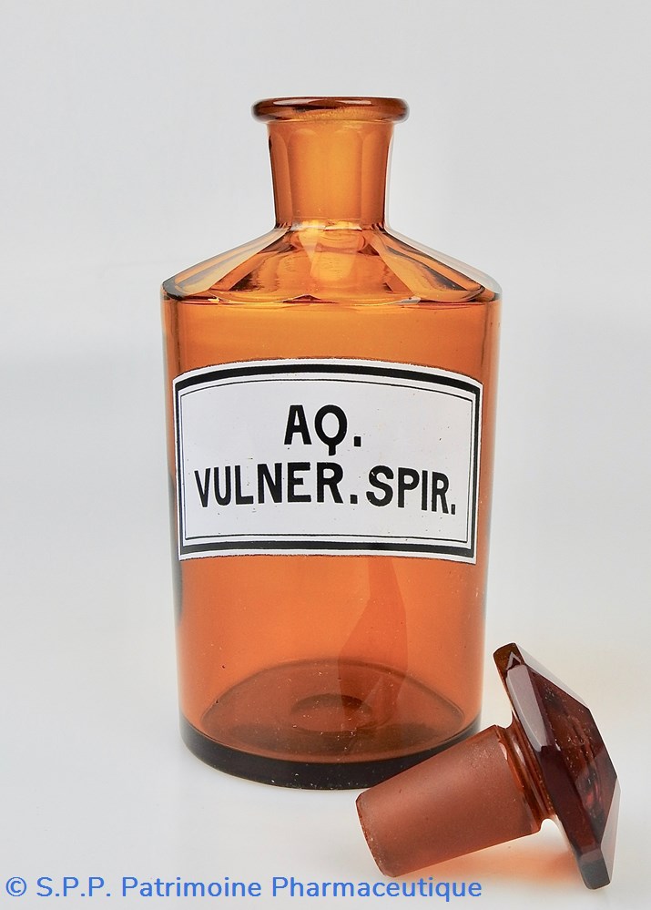Flacon de pharmacie en verre ambré soufflé à goulot étroit pour liquides.