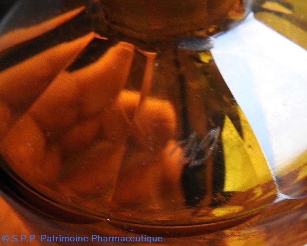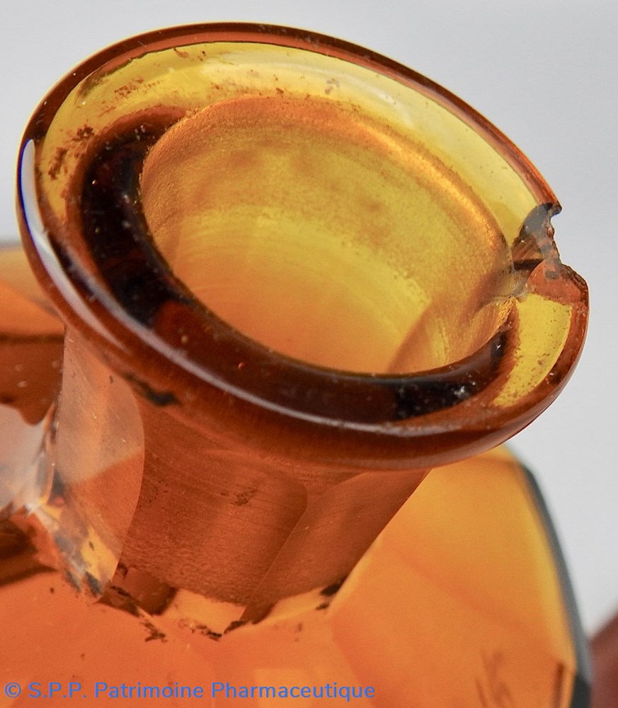 Le corps principal se termine vers le goulot en une collerette décagonale qui se poursuit sur le goulot. Le sommet du bouchon est quant à lui taillé en diamant hexagonal. Fermeture à l'émeri. Un chiffre est gravé sur le bouchon : 8 . Un autre chiffre est inscrit sur le flacon au dessus de l'étiquette sur une branche de la collerette : 30 ?