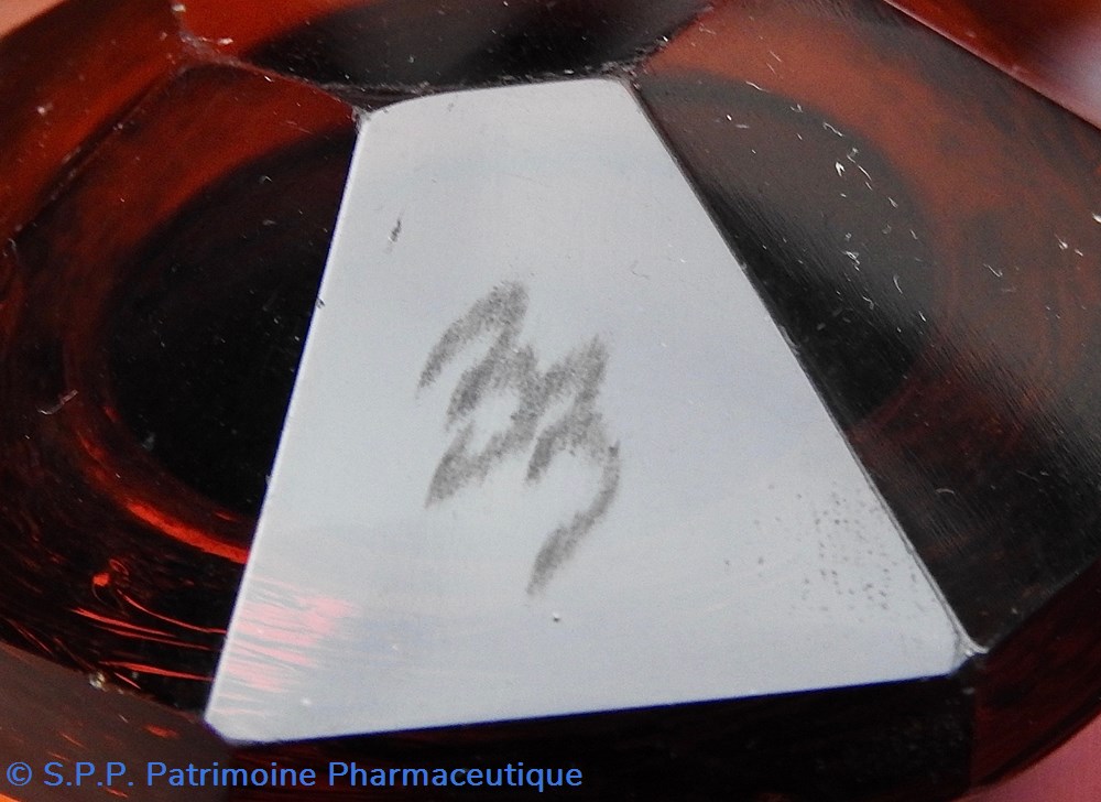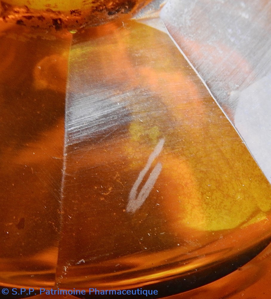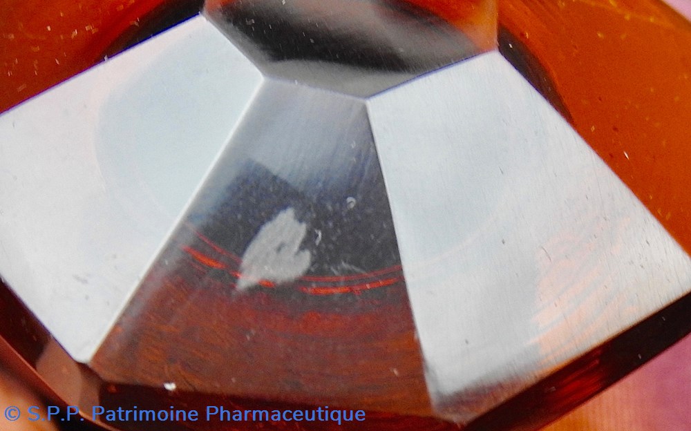 Le corps principal se termine vers le goulot en une collerette décagonale qui se poursuit sur le goulot. Le sommet du bouchon est quant à lui taillé en diamant hexagonal. Fermeture à l'émeri. Un chiffre est gravé sur le bouchon : ?. Un autre chiffre est inscrit sur le flacon au dessus de l'étiquette sur une branche de la collerette : 21