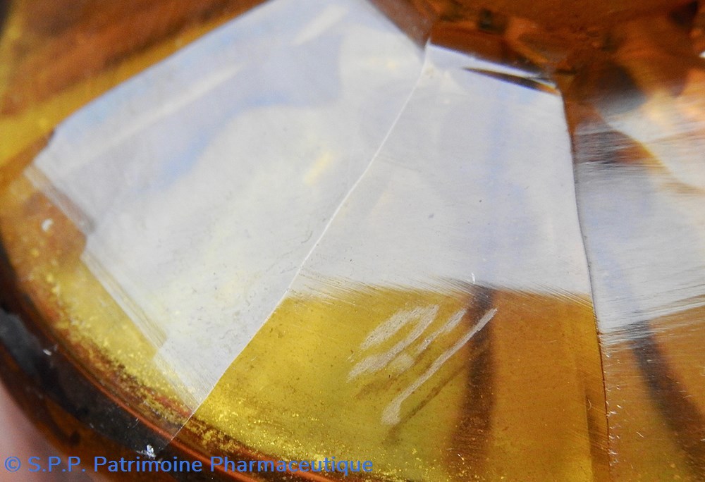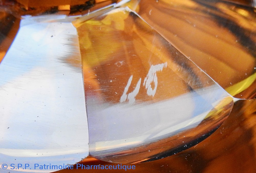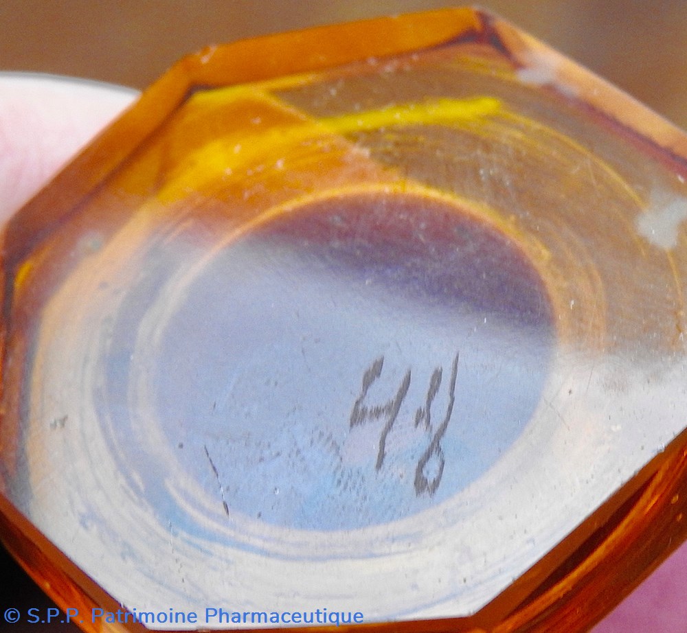 Le corps principal se termine vers le goulot en une collerette décagonale qui se poursuit sur le goulot. Le sommet du bouchon est plat. Fermeture à l'émeri. Un chiffre est gravé sur le bouchon : 48. Un autre chiffre est inscrit sur le flacon sur le dessus de l'étiquette : 6
