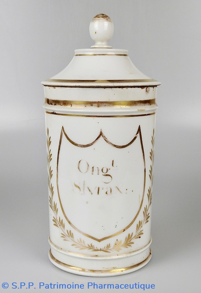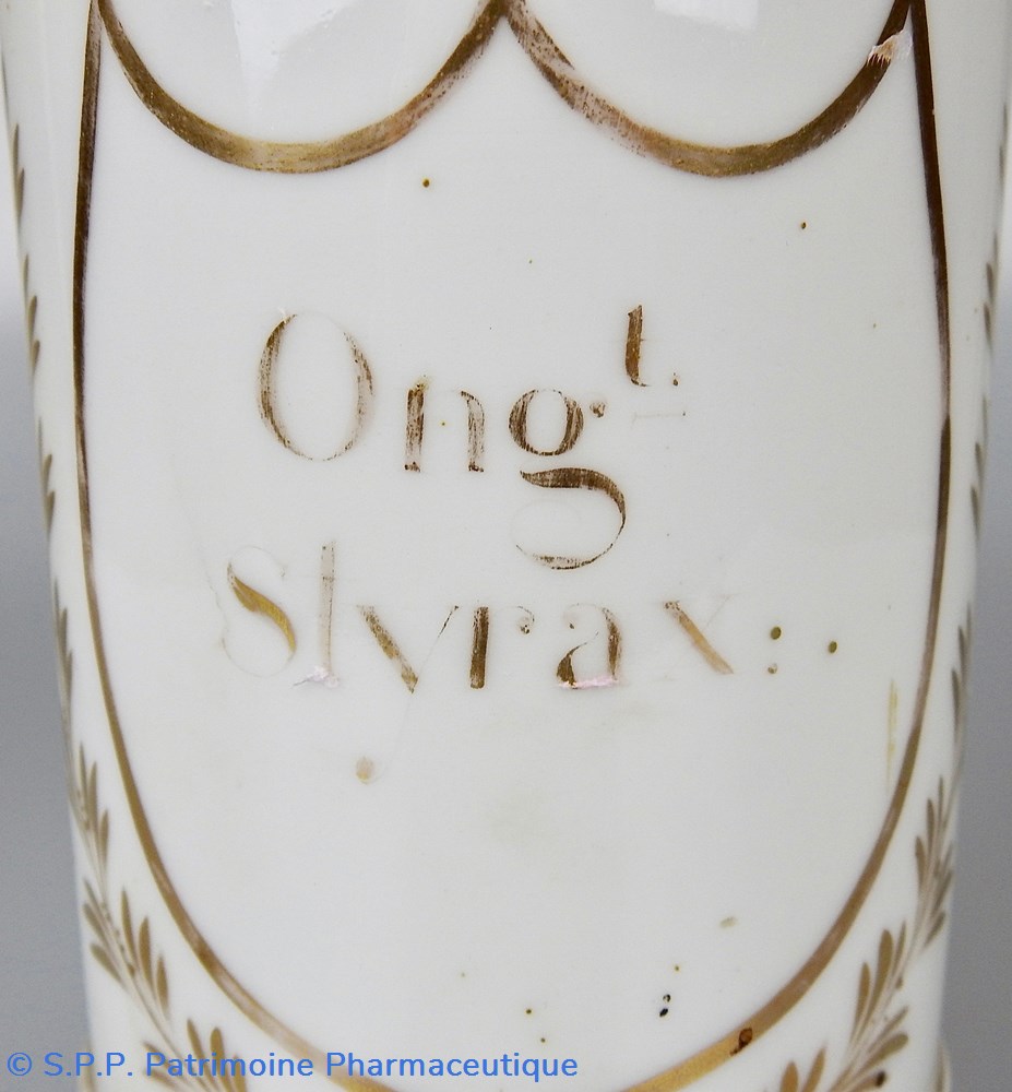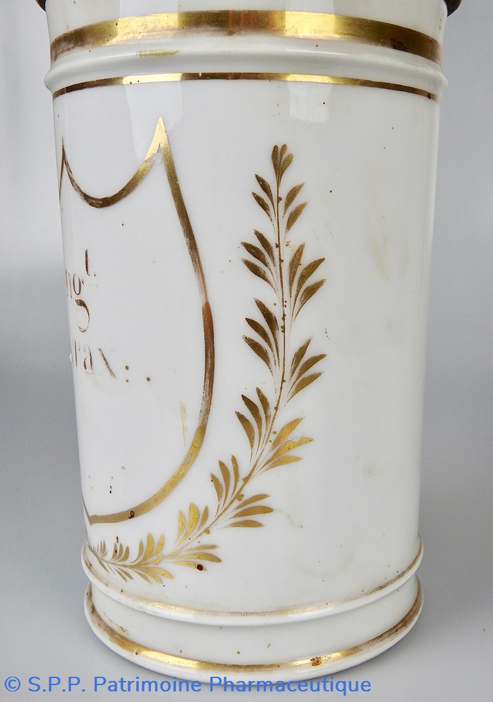 Ce pot en faïence blanche est uniquement orné d'or. Le nom de la substance se trouve à l'intérieur d'un écusson et est légèrement effacé. Il porte la mention :
