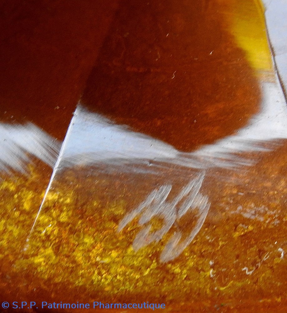 Un seul petit éclat est constaté à la partie supérieure du pot juste au dessus de la partie droite de l'écusson.