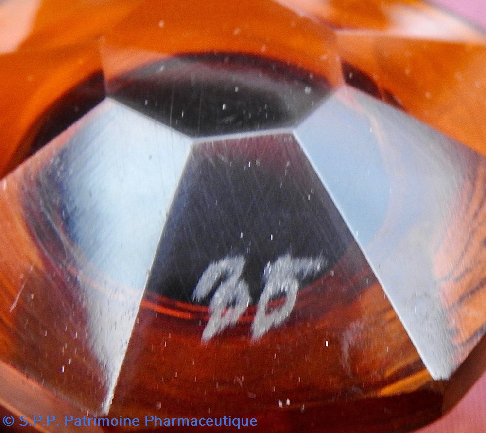 Le corps principal se termine vers le goulot en une collerette décagonale. Le sommet du bouchon est quant à lui taillé en diamant hexagonal. Fermeture à l'émeri. Un chiffre est gravé sur le bouchon : 33 et un autre sur la partie supérieure de la bouteille : 33.
