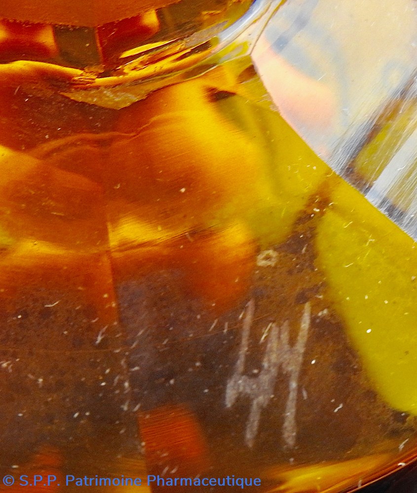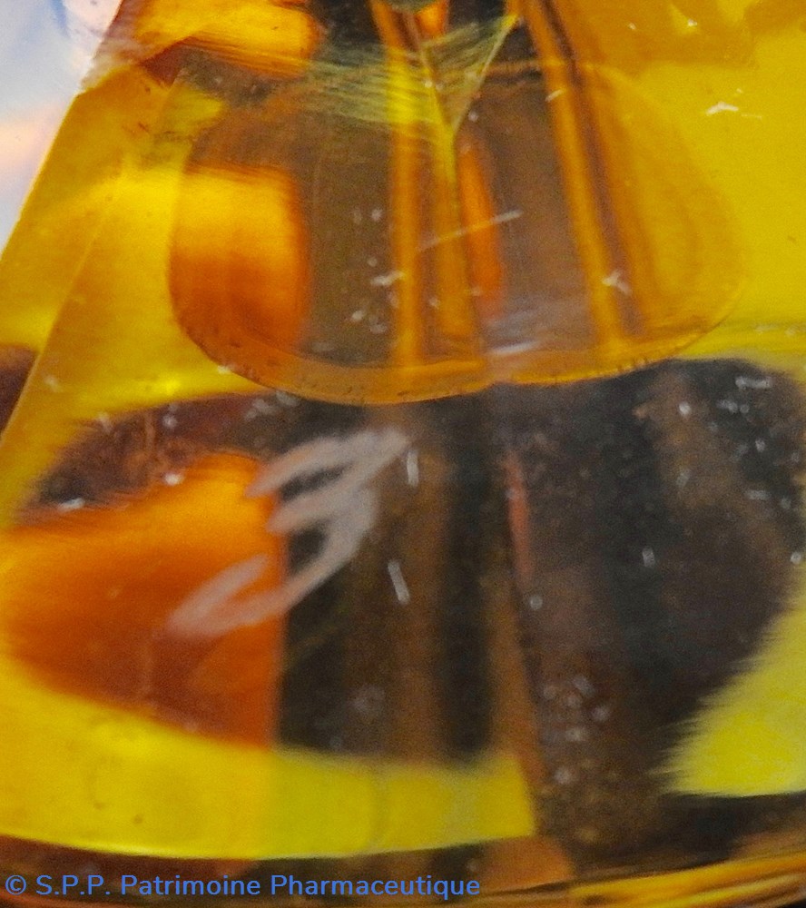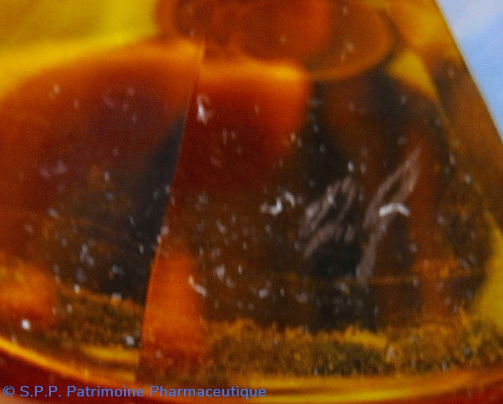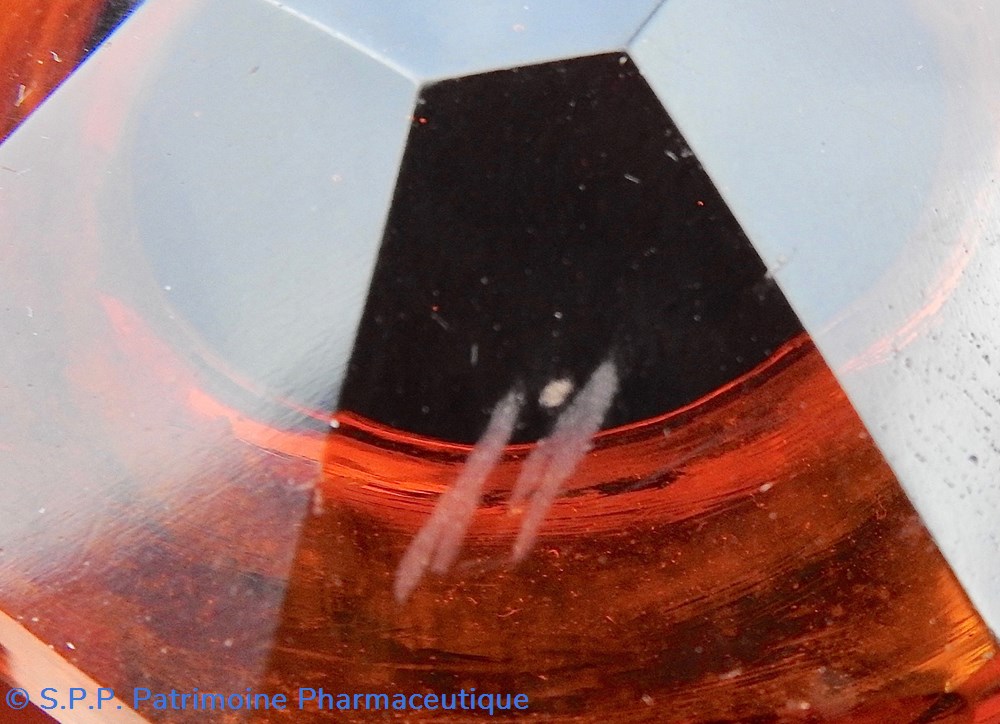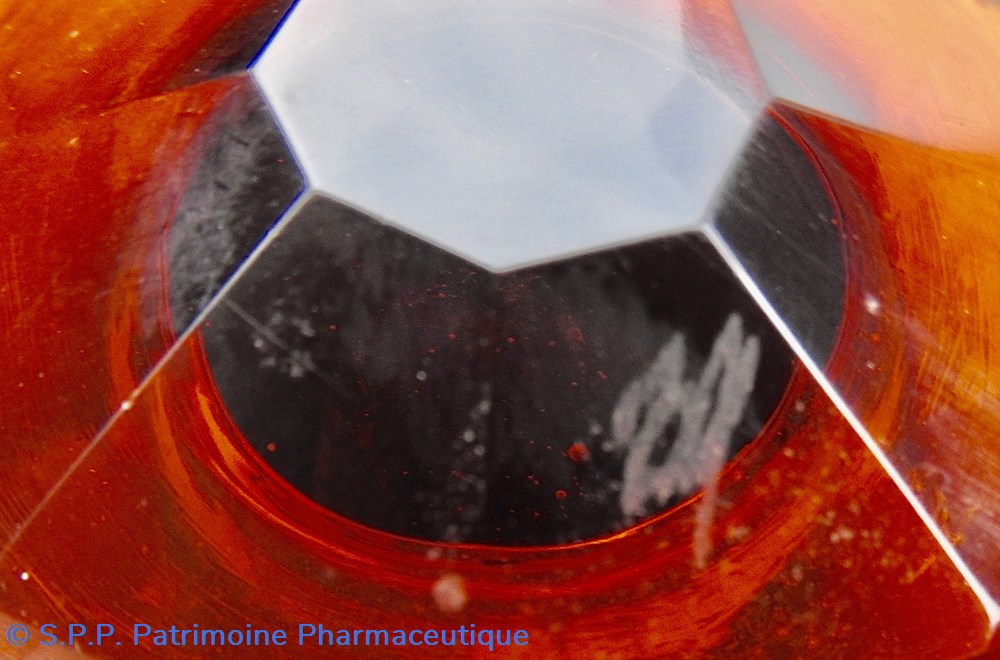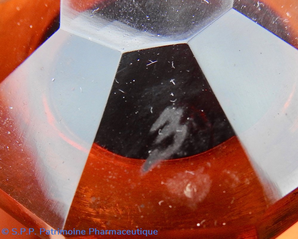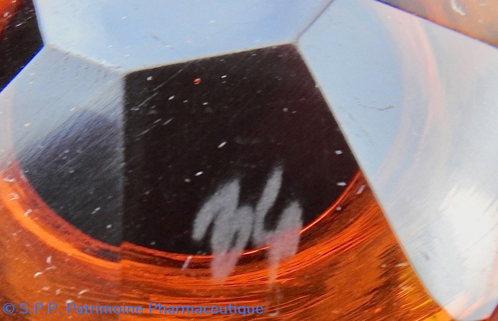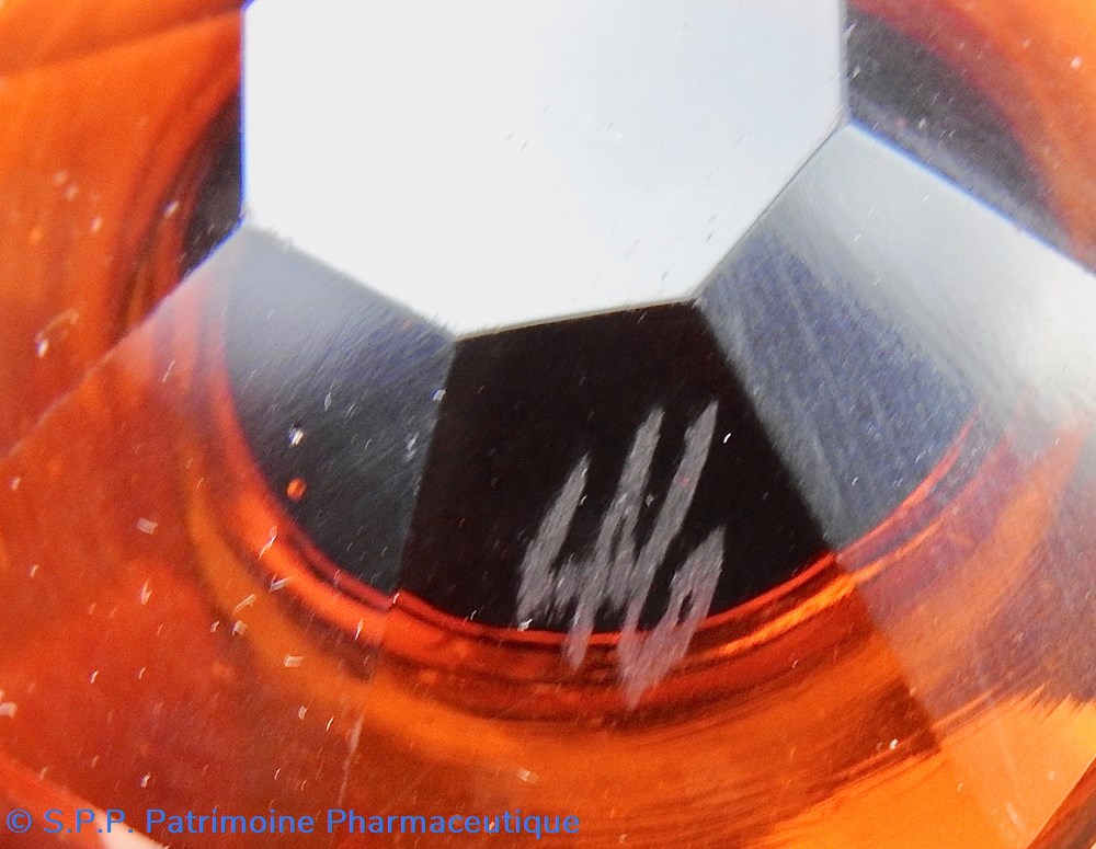 Le corps principal se termine vers le goulot en une collerette décagonale qui se poursuit sur le goulot. Le sommet du bouchon est quant à lui taillé en diamant hexagonal. Fermeture à l'émeri. Un chiffre est gravé sur le bouchon : 3. Un autre chiffre est inscrit sur le flacon au dessus de l'étiquette sur une branche de la collerette : 29