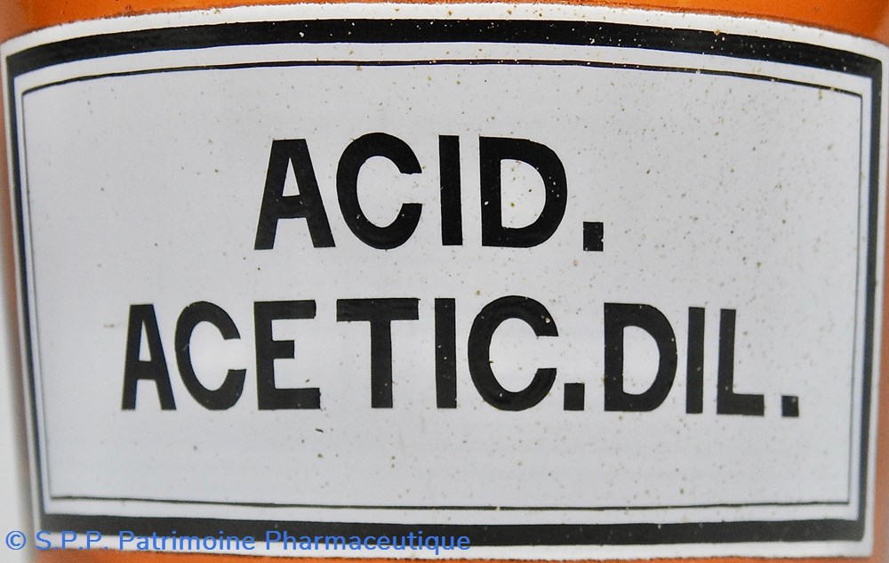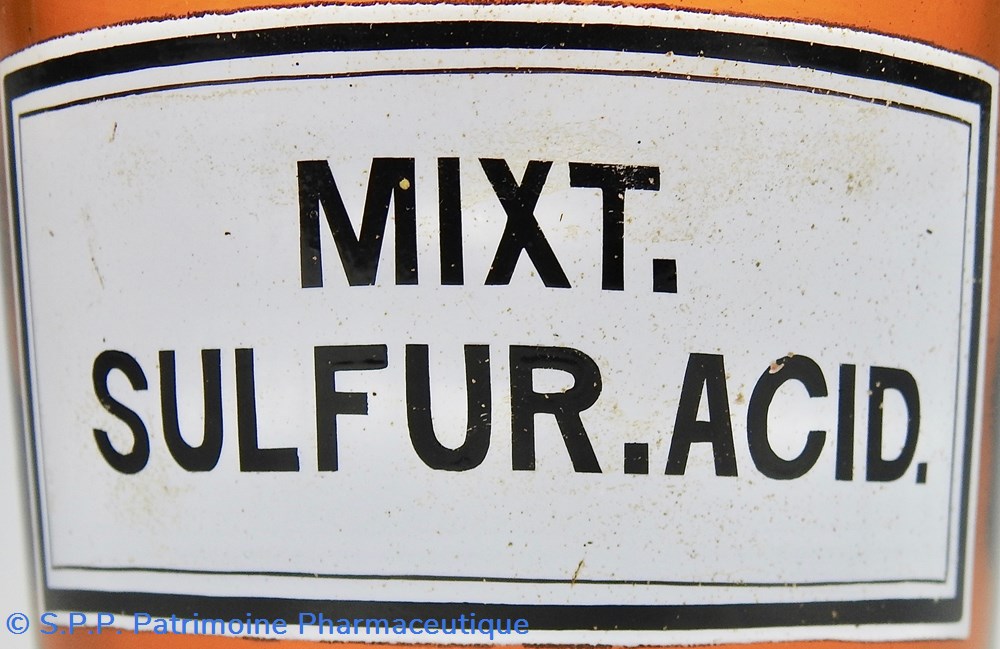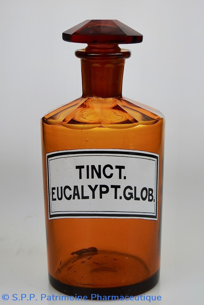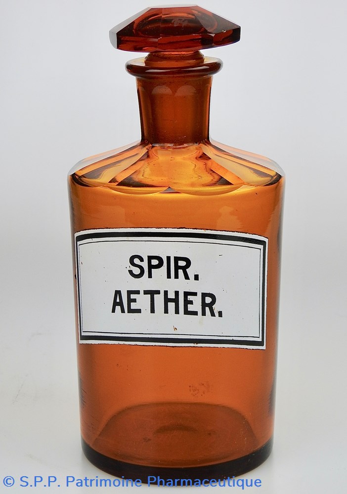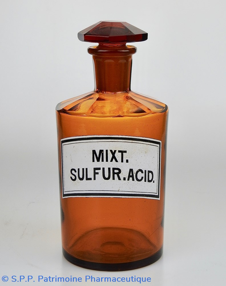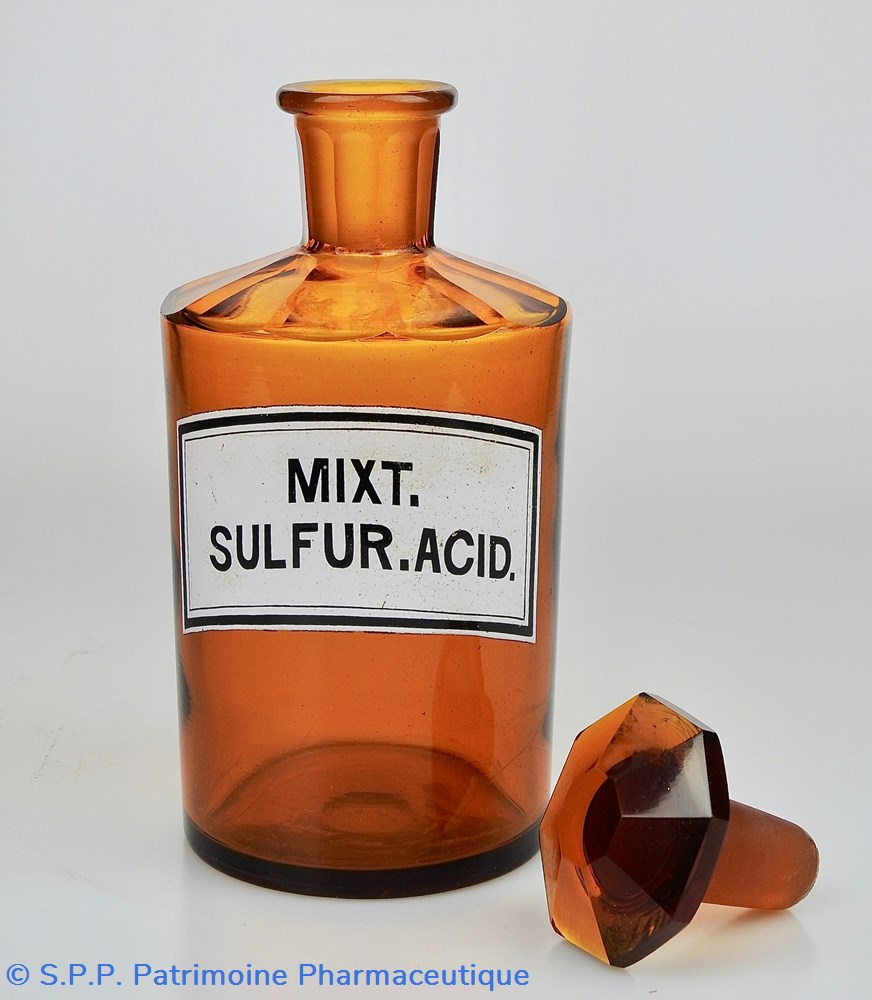 Flacon de pharmacie en verre ambré soufflé à goulot étroit pour liquides.