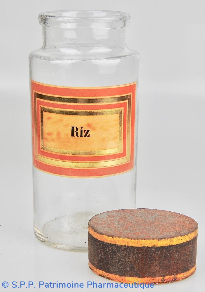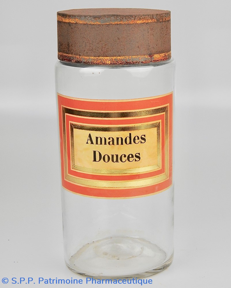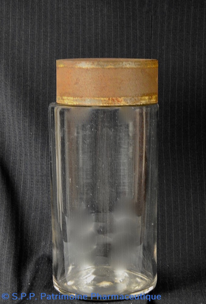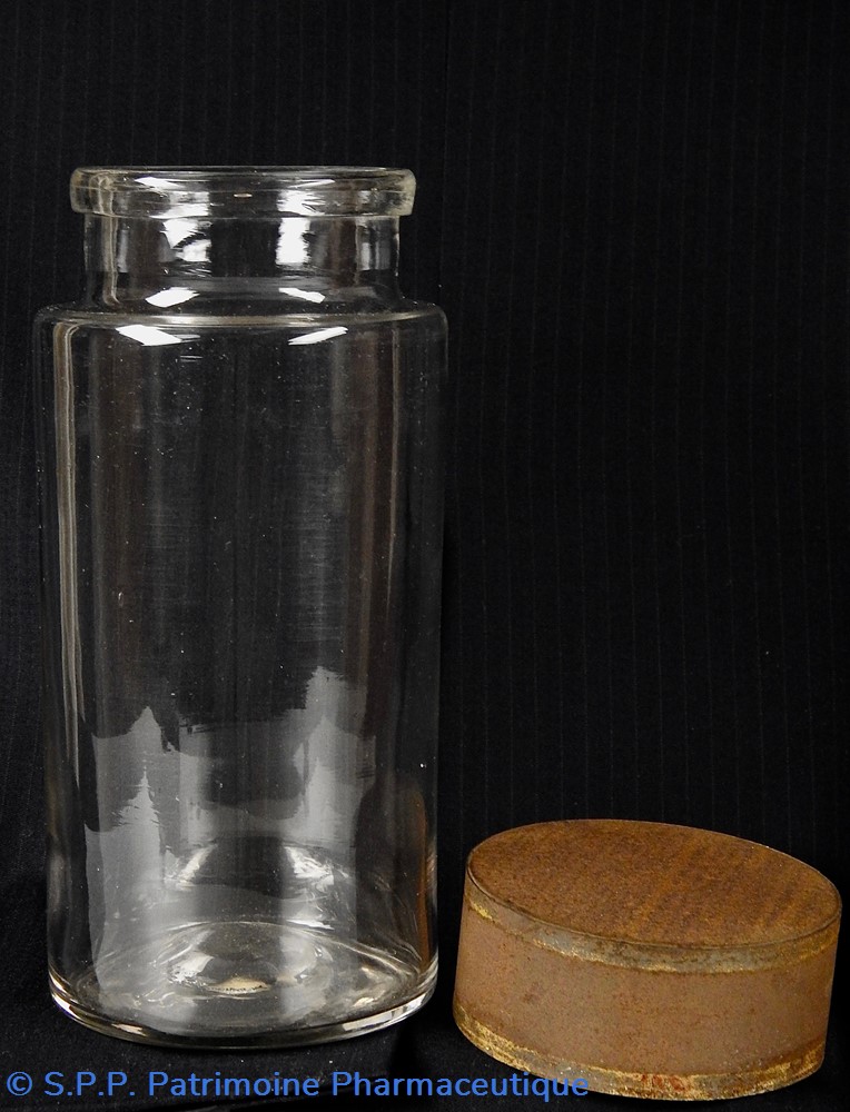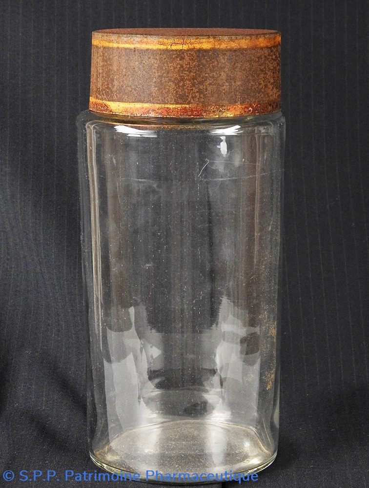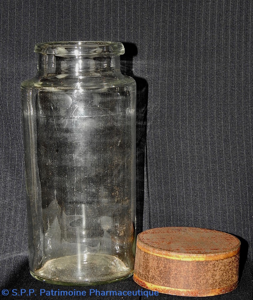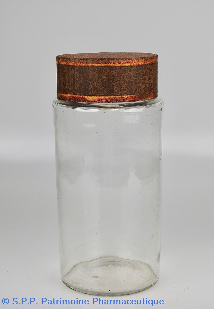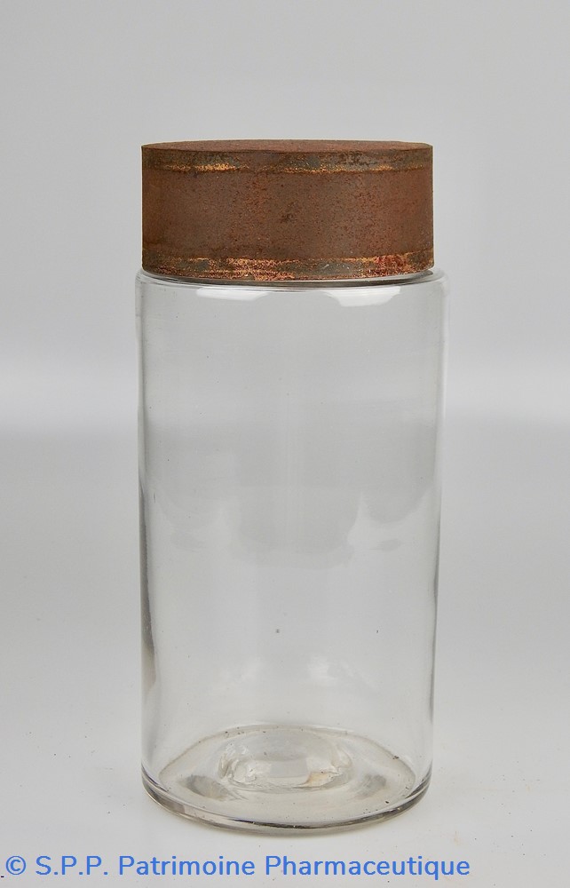 Flacon de pharmacie en verre soufflé à large ouverture supérieure permettant l'introduction facile de plantes ou de substances de gros calibre (pastilles, capsules etc...). Un couvercle en tôle peinte mais fortement rouillé surmonte le flacon sans bouchon intérieur. Ce couvercle était initialement décoré à sa base et dans la partie supérieure de filets dorés. Le flacon est vide de substances.