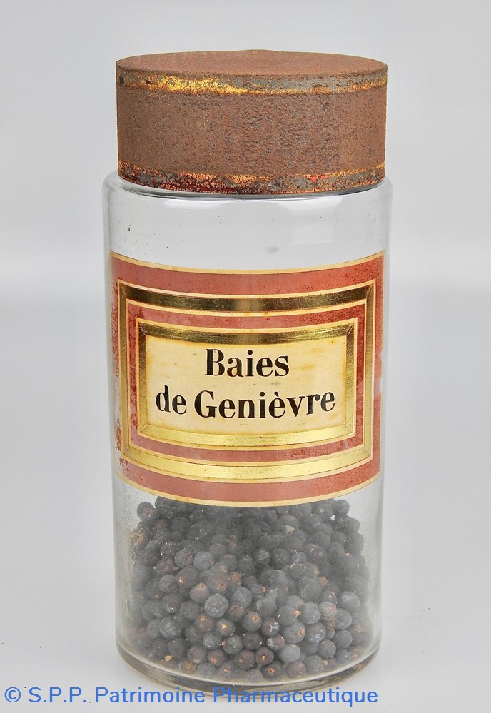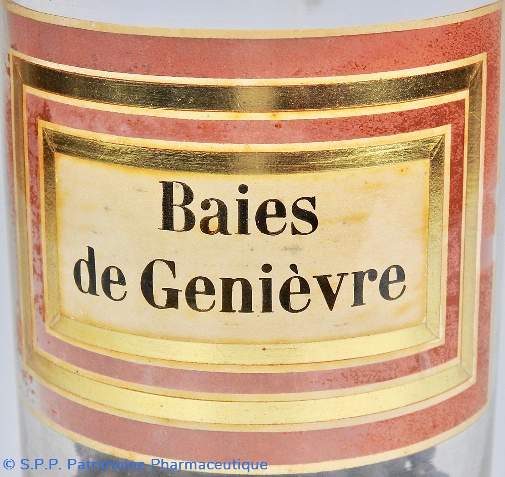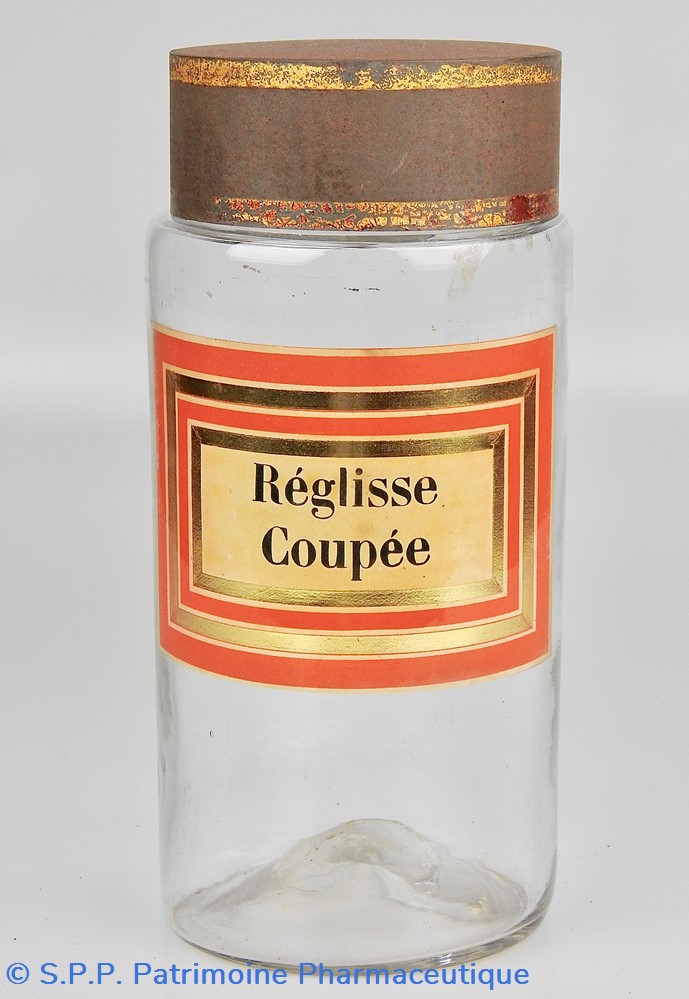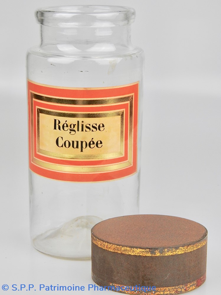Flacon de pharmacie en verre soufflé à large ouverture supérieure permettant l'introduction facile de plantes. Etiquette collée à l'intérieur très joliment ornée d'encadrements alternés or et rouge. Le nom est inscrit en noir au milieu d'un rectangle beige. Quelques taches sur l'étiquette. Un couvercle en tôle peinte mais fortement rouillé surmonte le flacon sans bouchon intérieur. Ce couvercle était initialement décoré à sa base et dans la partie supérieure de filets dorés. Le flacon est vide de plantes.