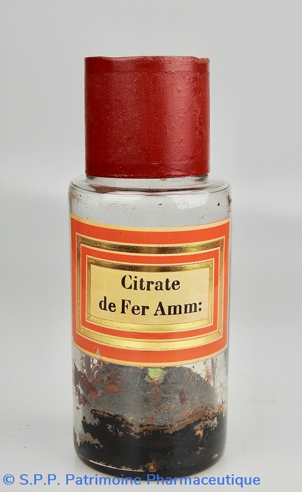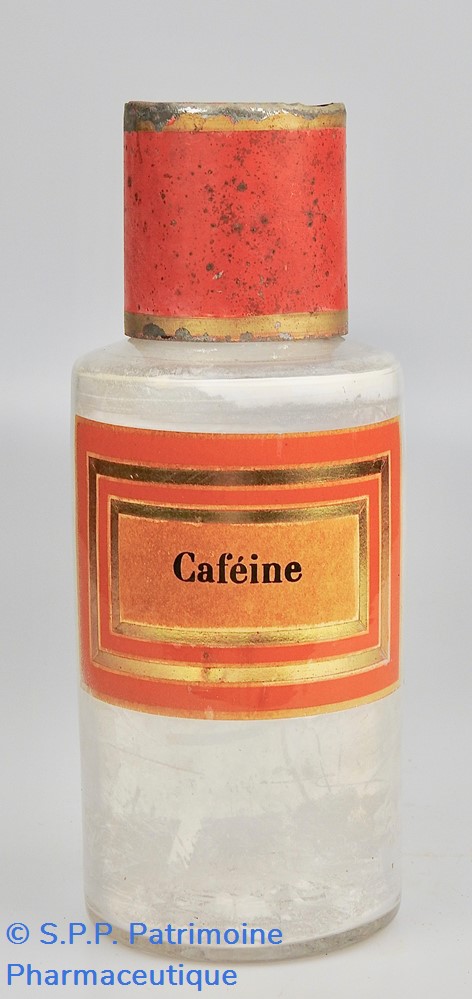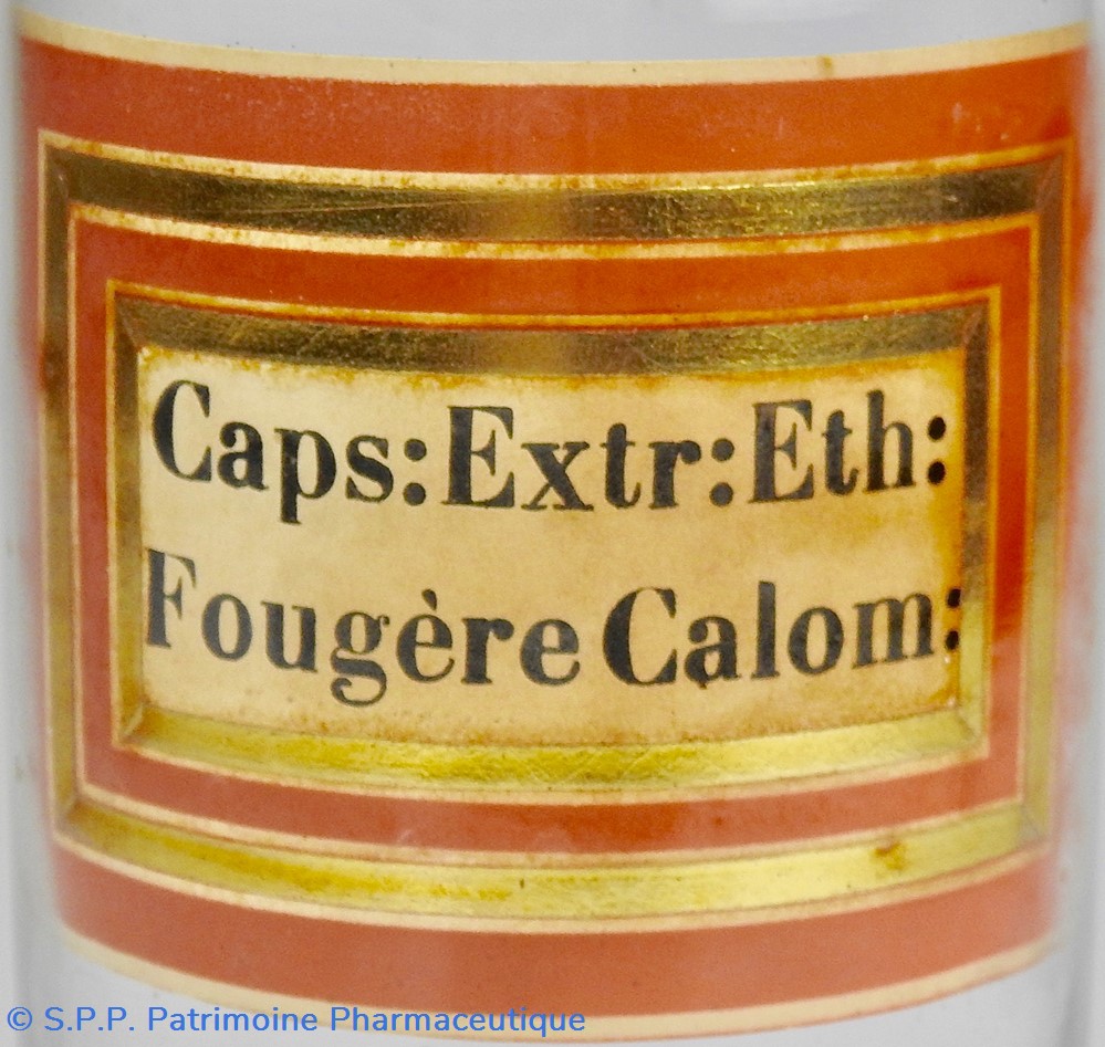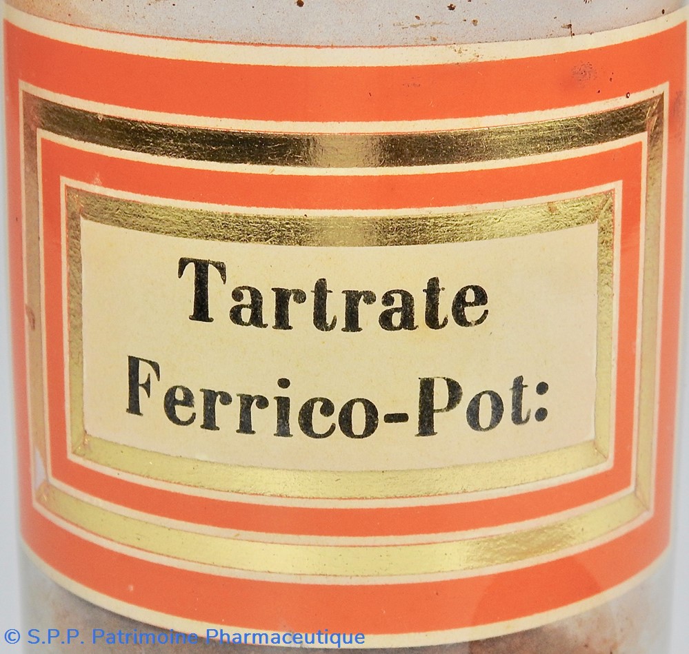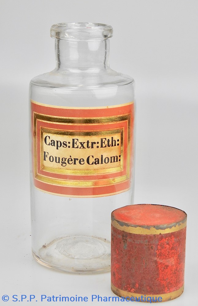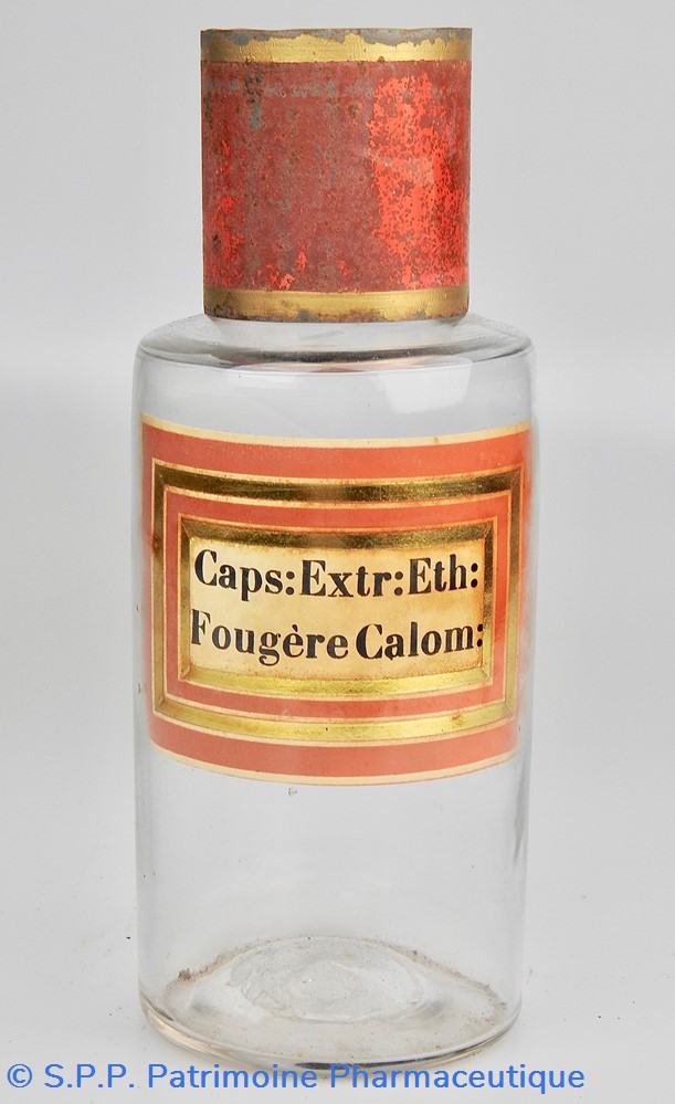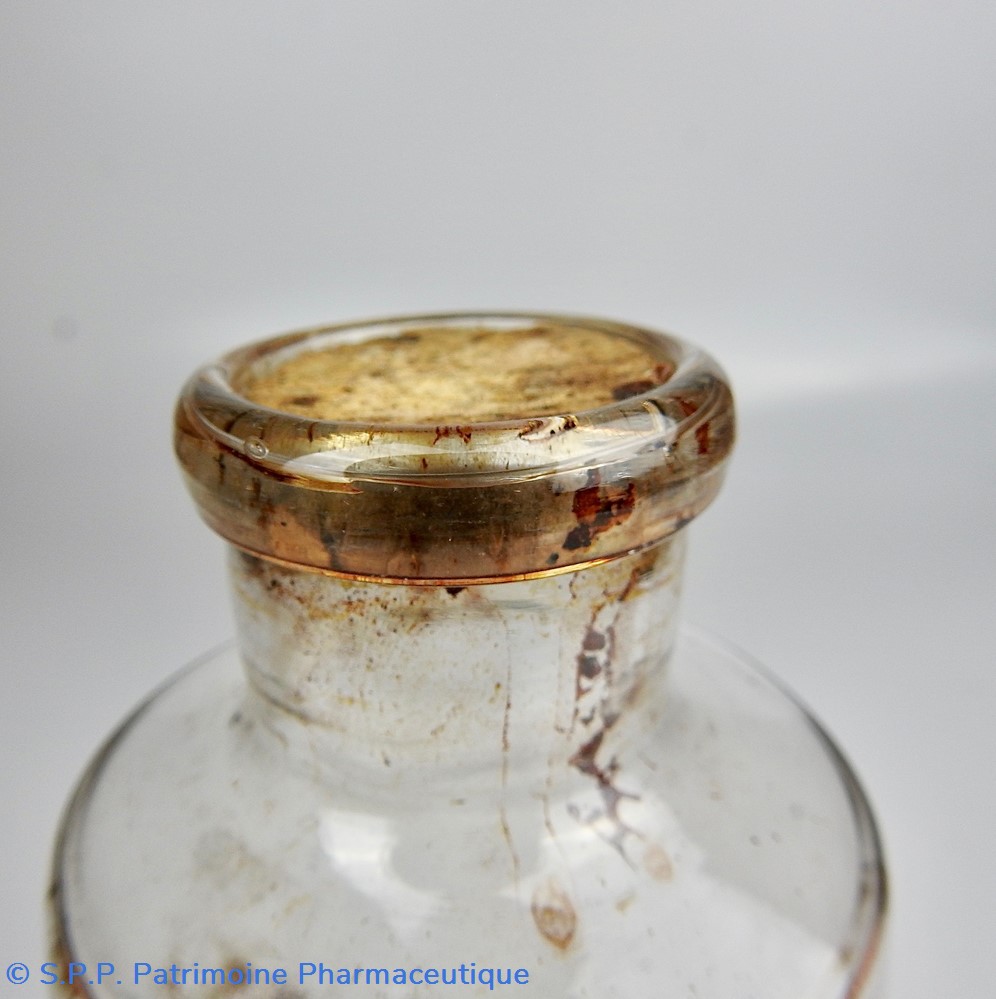 Flacon de pharmacie en verre soufflé avec ouverture en goulot étroit permettant de verser des poudres ou des granulés. Etiquette crème entourée de bandes alternées rouge et or. Le nom est inscrit en noir au milieu d'un rectangle crème au centre de l'étiquette. Un couvercle en tôle peinte mais très rouillé surmonte le flacon sans bouchon intérieur. Ce couvercle est décoré à sa base et dans la partie supérieure d'un filet doré. Le flacon est à moitié plein de la substance d'origine.