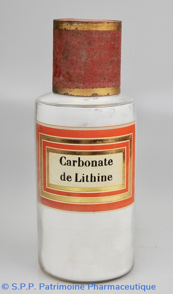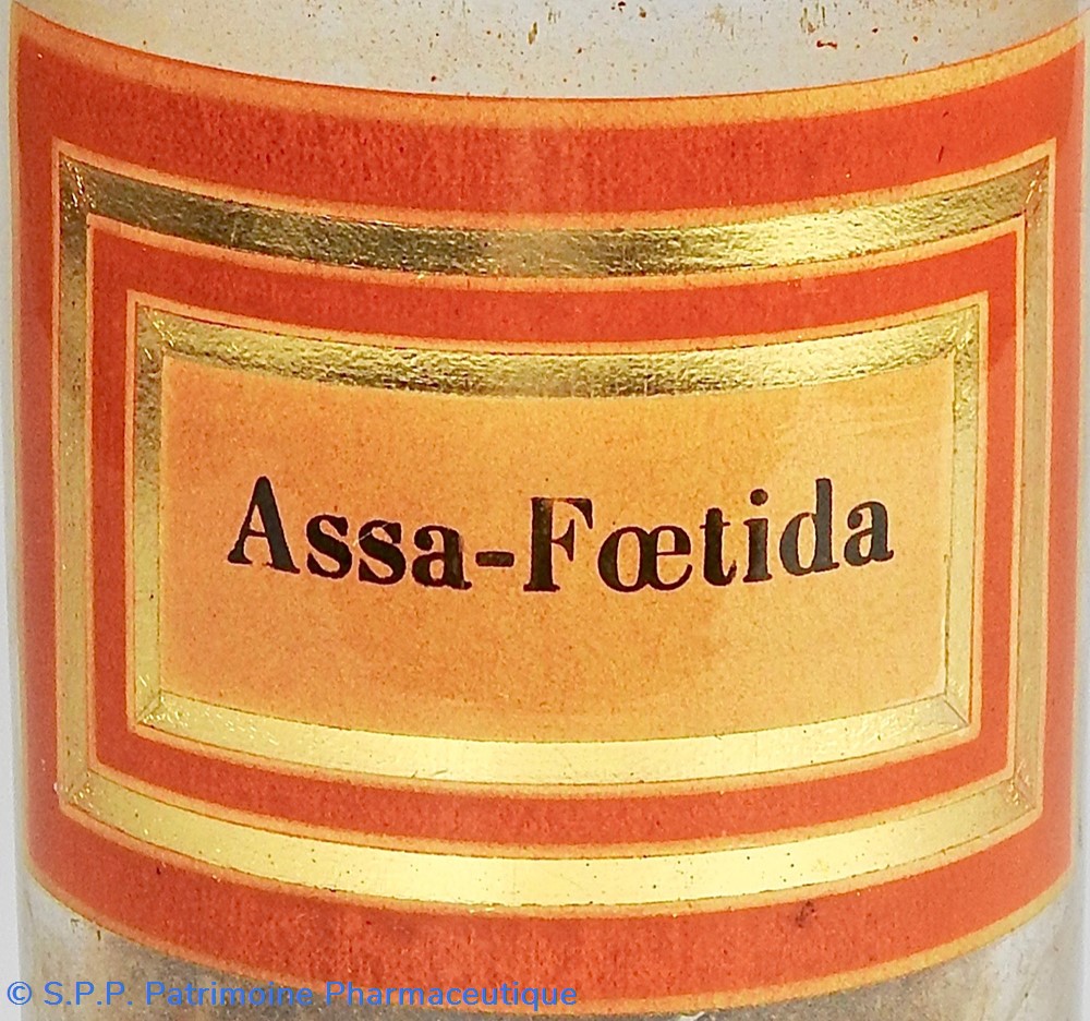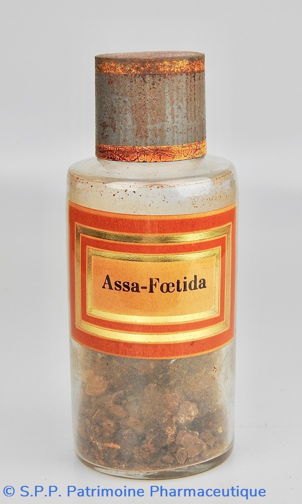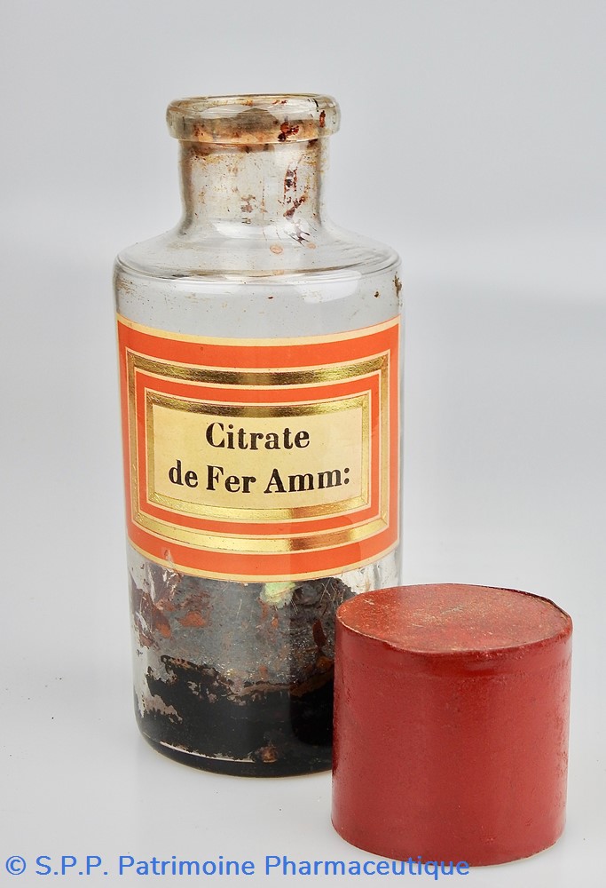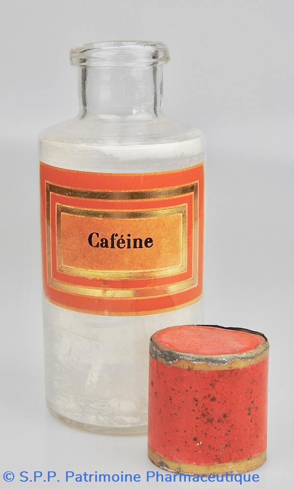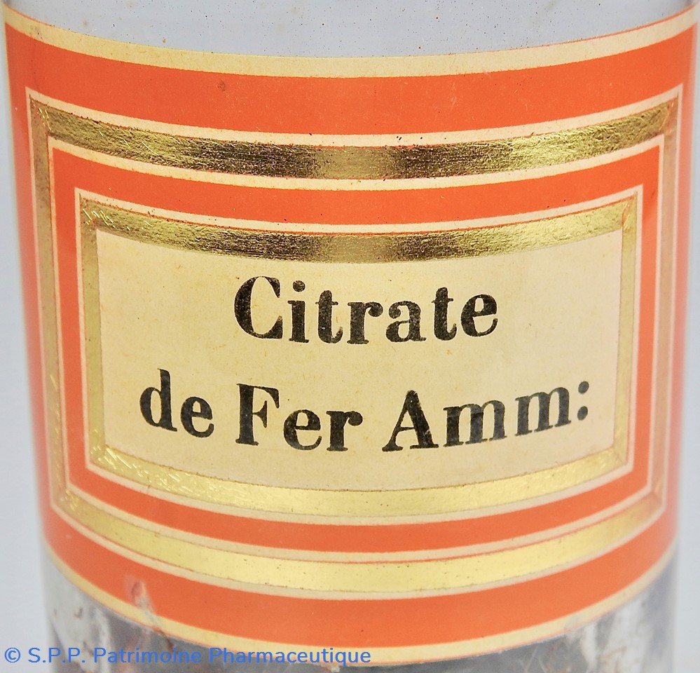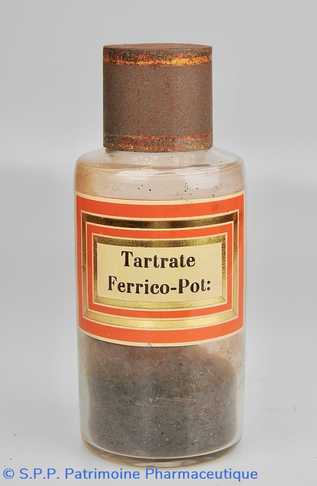 Flacon de pharmacie en verre soufflé avec ouverture en goulot étroit permettant de verser des poudres ou des granulés. Etiquette crème entourée de bandes alternées rouge et or. Le nom est inscrit en noir au milieu d'un rectangle crème au centre de l'étiquette. Un couvercle en tôle peinte mais très rouillé surmonte le flacon sans bouchon intérieur. Ce couvercle est décoré à sa base et dans la partie supérieure d'un filet doré. Le flacon est à moitié plein de la substance d'origine.