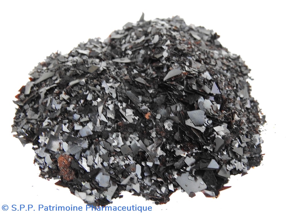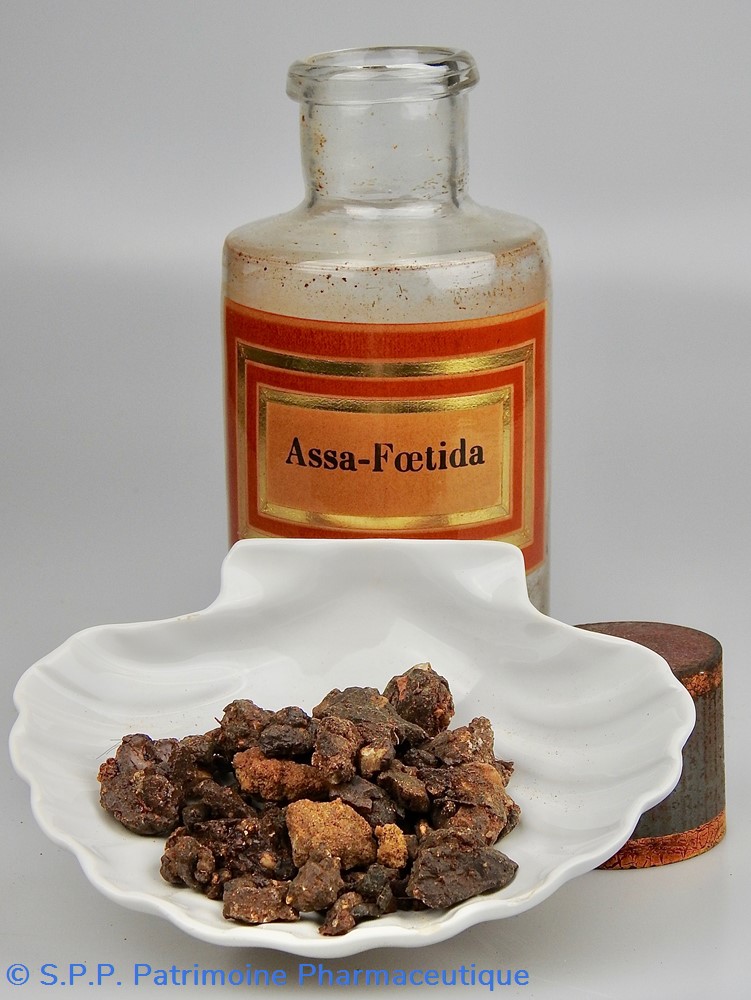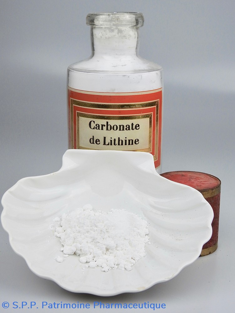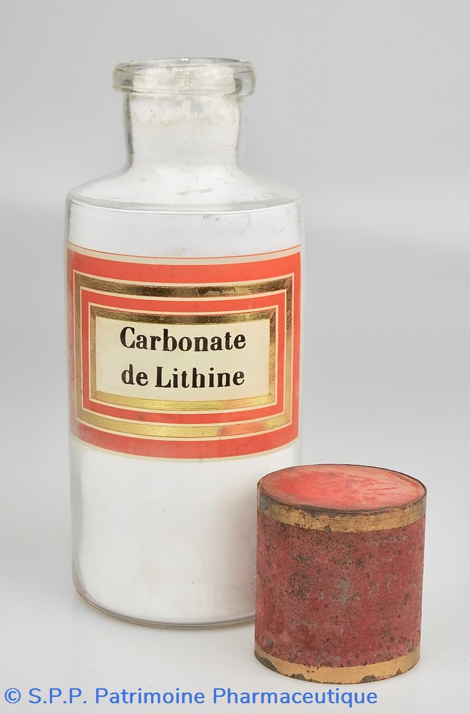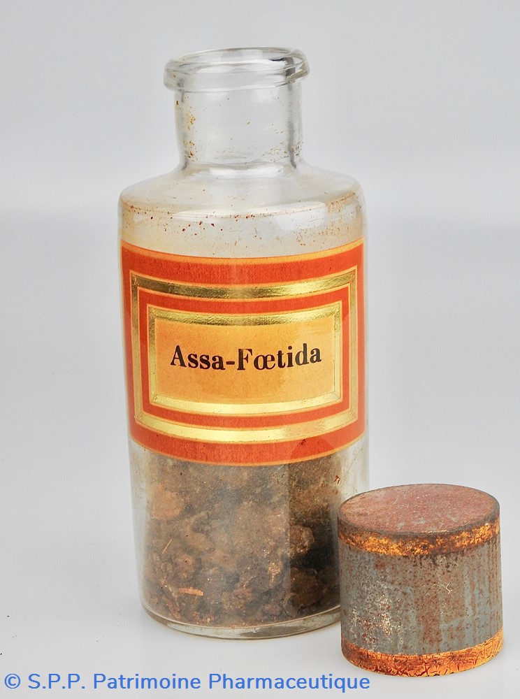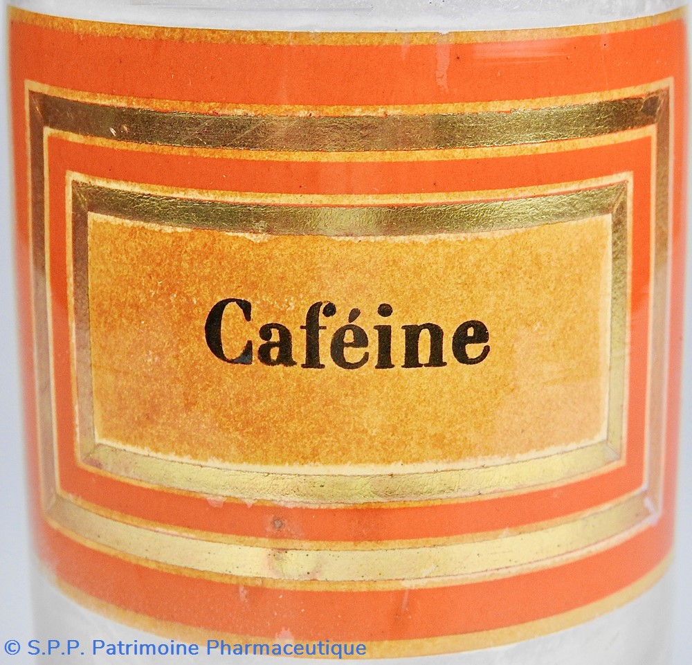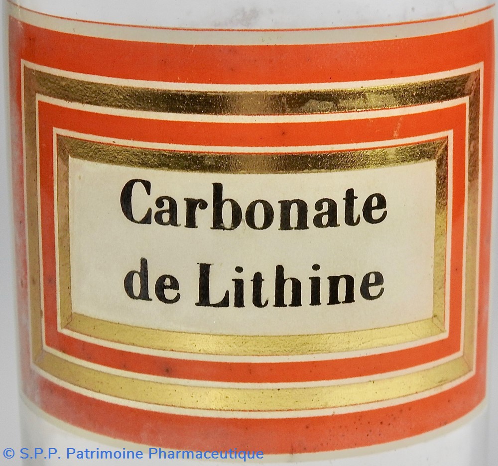 Flacon de pharmacie en verre soufflé avec ouverture en goulot étroit permettant de verser des poudres ou des granulés. Etiquette crème entourée de bandes alternées rouge et or. Le nom est inscrit en noir au milieu d'un rectangle crème au centre de l'étiquette. Un couvercle en tôle peinte mais très rouillé surmonte le flacon sans bouchon intérieur. Ce couvercle est décoré à sa base et dans la partie supérieure d'un filet doré. Le flacon est à moitié plein de la substance d'origine.