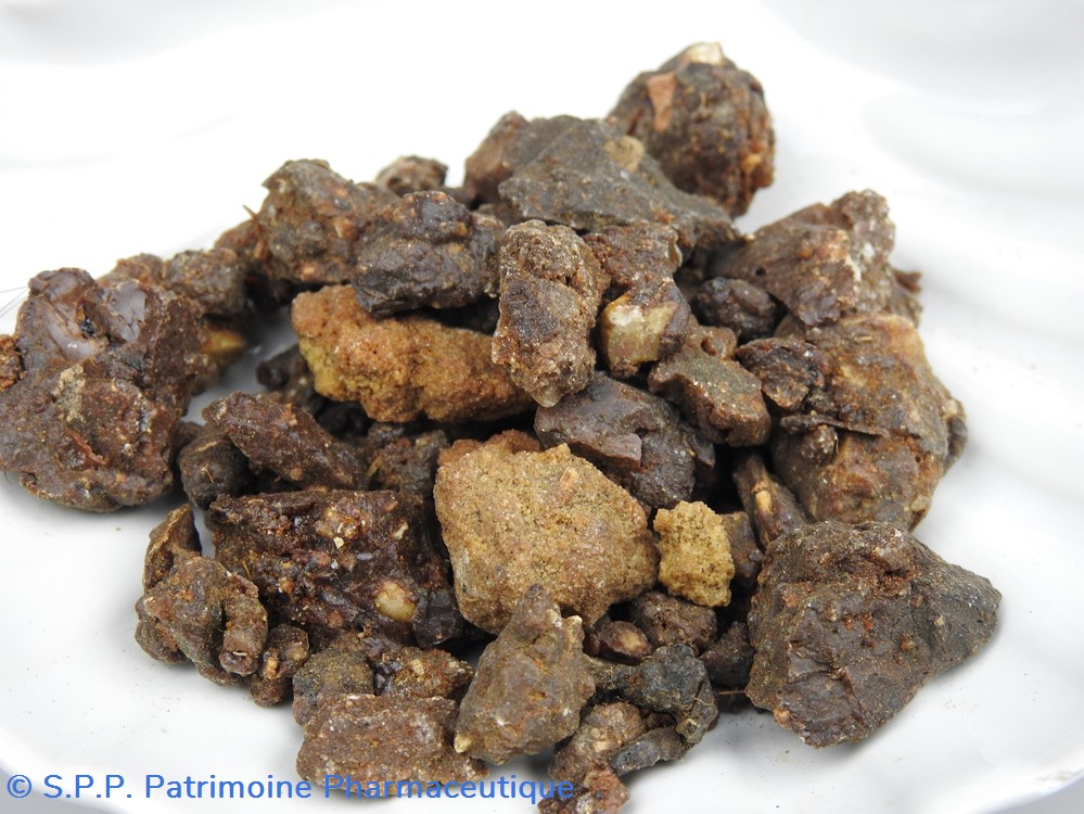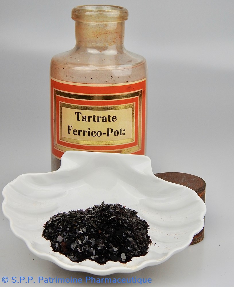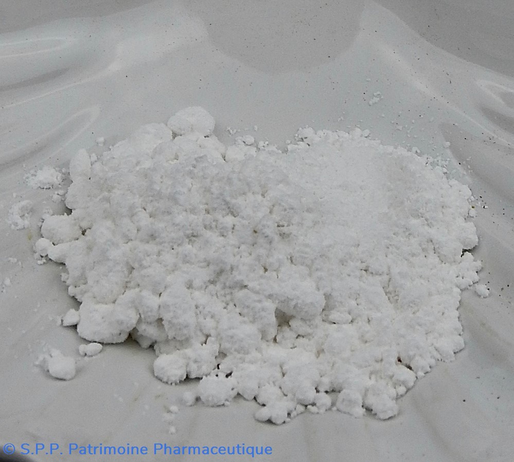 Flacon de pharmacie en verre soufflé avec ouverture en goulot étroit permettant de verser des poudres ou des granulés. Etiquette crème entourée de bandes alternées rouge et or. Le nom est inscrit en noir au milieu d'un rectangle crème au centre de l'étiquette. Un couvercle en tôle peinte en rouge mais ayant des traces de rouille surmonte le flacon sans bouchon intérieur. Ce couvercle rouge est décoré à sa base et dans la partie supérieure d'un filet doré. Le flacon est contient encore un fond de la substance d'origine. Les parois intérieures du flacon sont opacifiées en blanc par le contenu.
