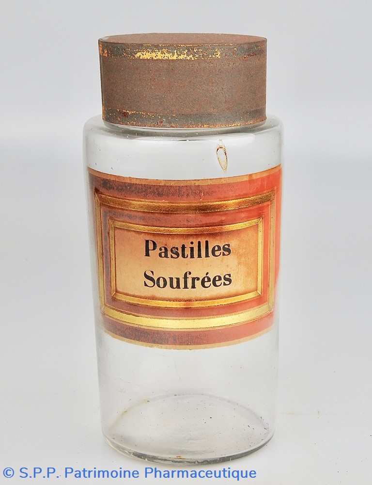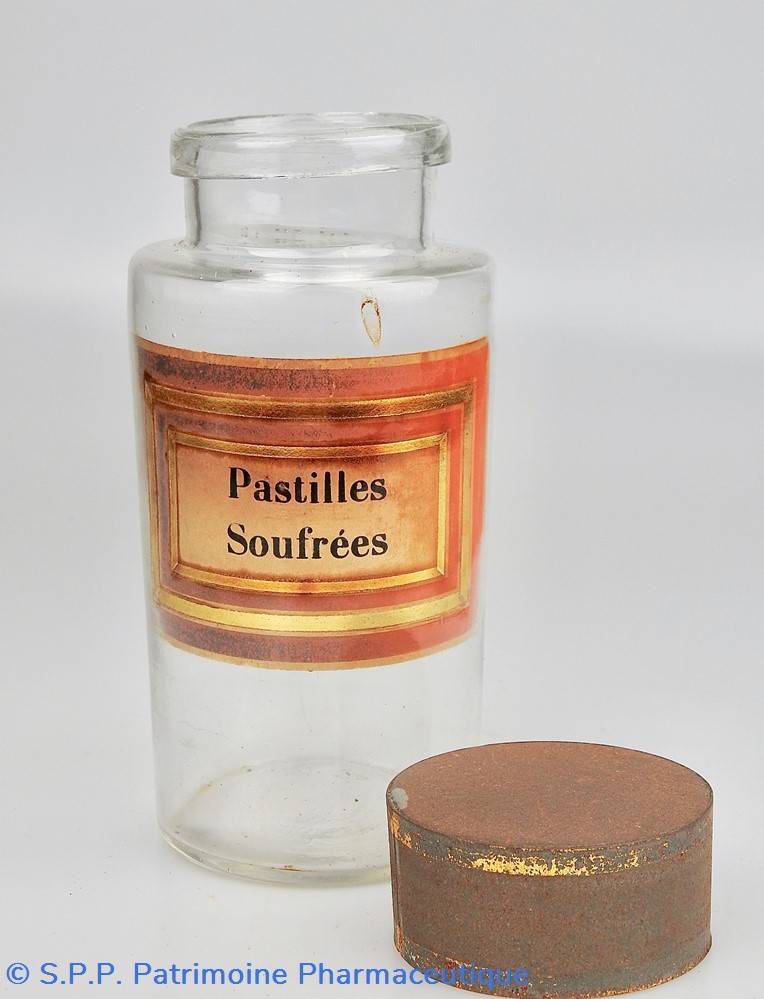 Flacon de pharmacie en verre soufflé à ouverture supérieure à col large permettant l'introduction facile de pastilles. Etiquette collée à l'intérieur très joliment ornée d'encadrements alternés or et rouge. Le nom est inscrit en noir au milieu d'un rectangle beige. les couleurs de l'étiquette sont un peu passées. Une bulle dans le verre est présente au dessus de l'étiquette. Un couvercle en tôle peinte mais fortement rouillé surmonte le flacon sans bouchon intérieur. Ce couvercle était initialement décoré à sa base et dans la partie supérieure de filets dorés. Le flacon est vide de substances.