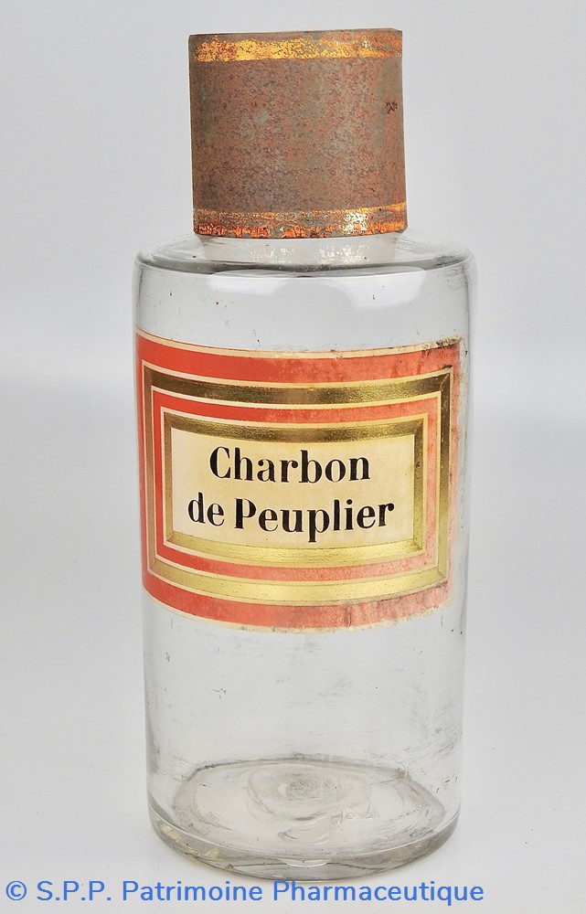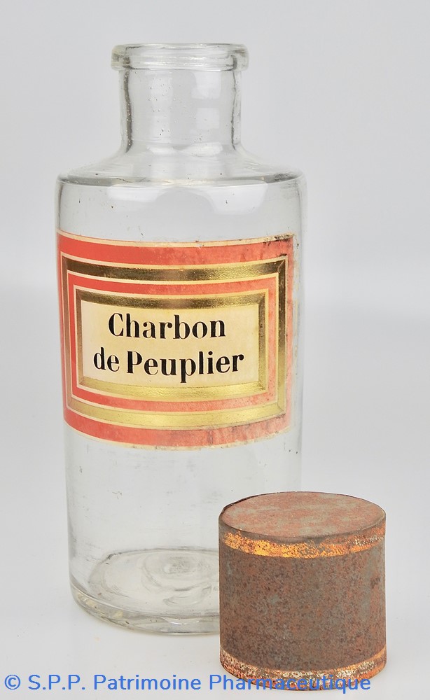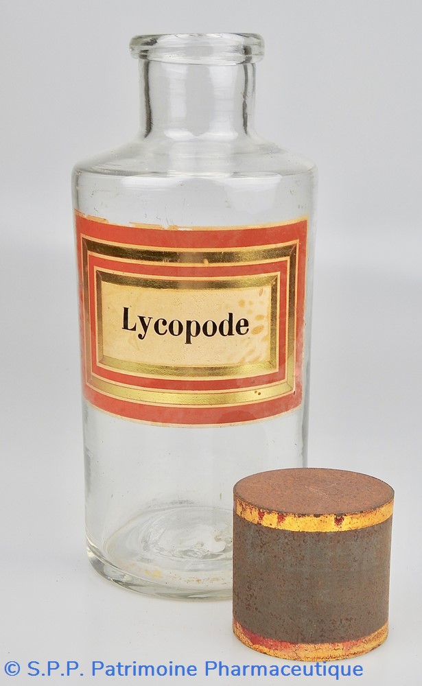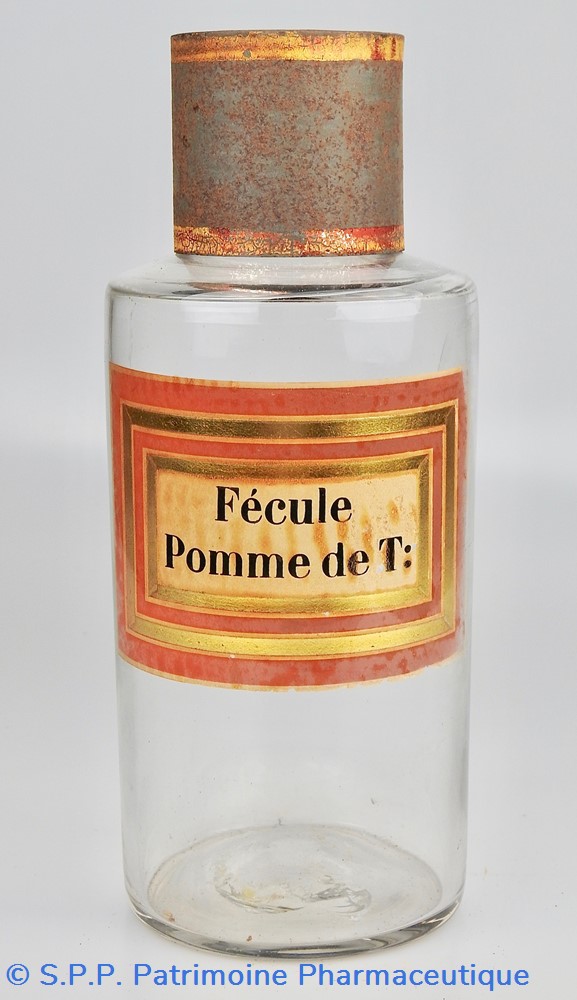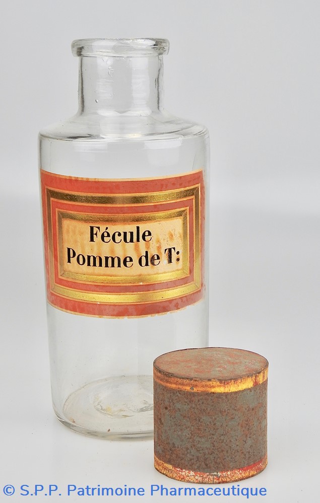 Flacon de pharmacie en verre soufflé à ouverture supérieure à col étroit permettant l'introduction facile de poudre. Etiquette collée à l'intérieur très joliment ornée d'encadrements alternés or et rouge. Le nom est inscrit en noir au milieu d'un rectangle beige. Un couvercle en tôle peinte mais fortement rouillé surmonte le flacon sans bouchon intérieur. Ce couvercle était initialement décoré à sa base et dans la partie supérieure de filets dorés. Le flacon est vide de substances.