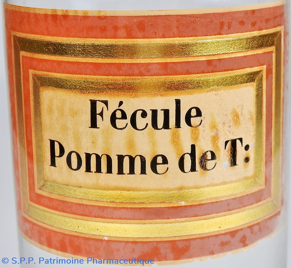 Flacon de pharmacie en verre soufflé à large ouverture supérieure permettant l'introduction facile de plantes. Etiquette collée à l'intérieur très joliment ornée d'encadrements alternés or et rouge. Le nom est inscrit en noir au milieu d'un rectangle beige. Quelques taches sur l'étiquette. Un couvercle en tôle peinte mais fortement rouillé surmonte le flacon sans bouchon intérieur. Ce couvercle était initialement décoré à sa base et dans la partie supérieure de filets dorés. Le flacon est rempli aux 3/4 de plantes.