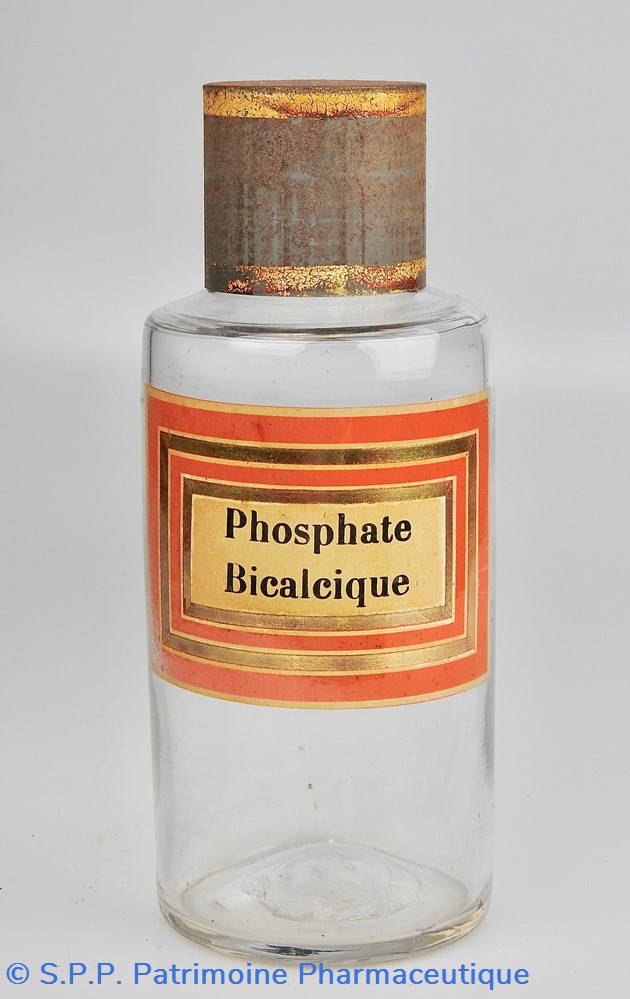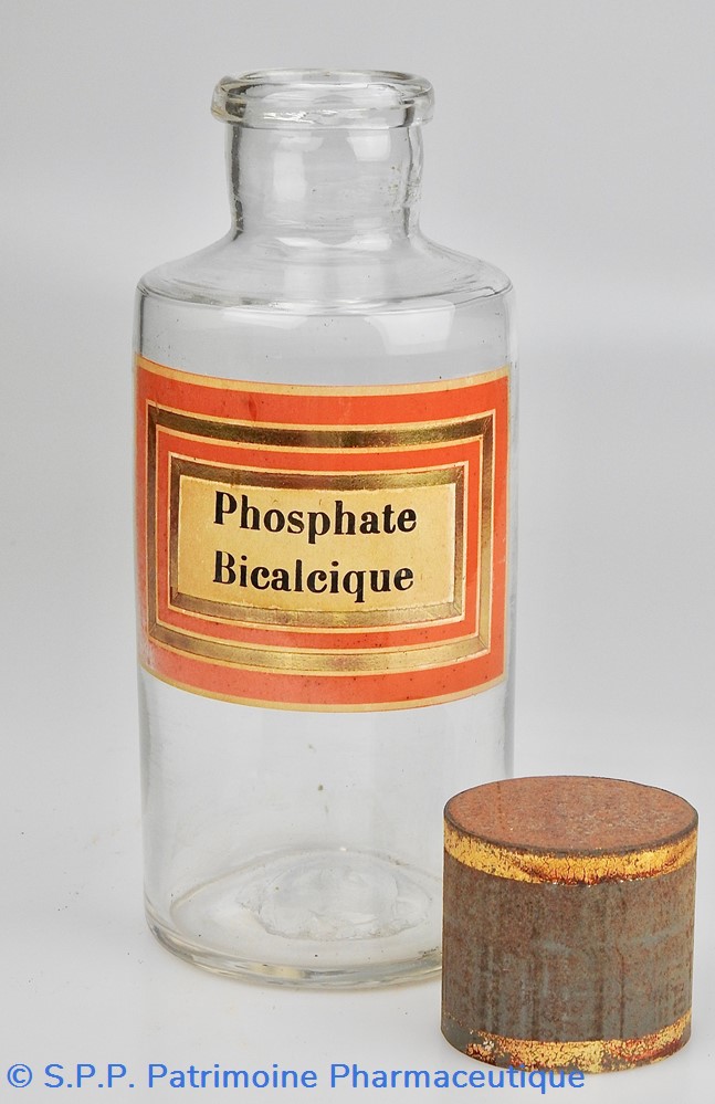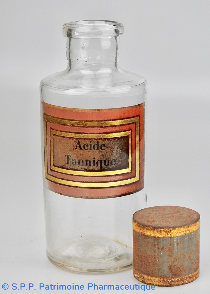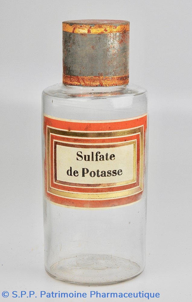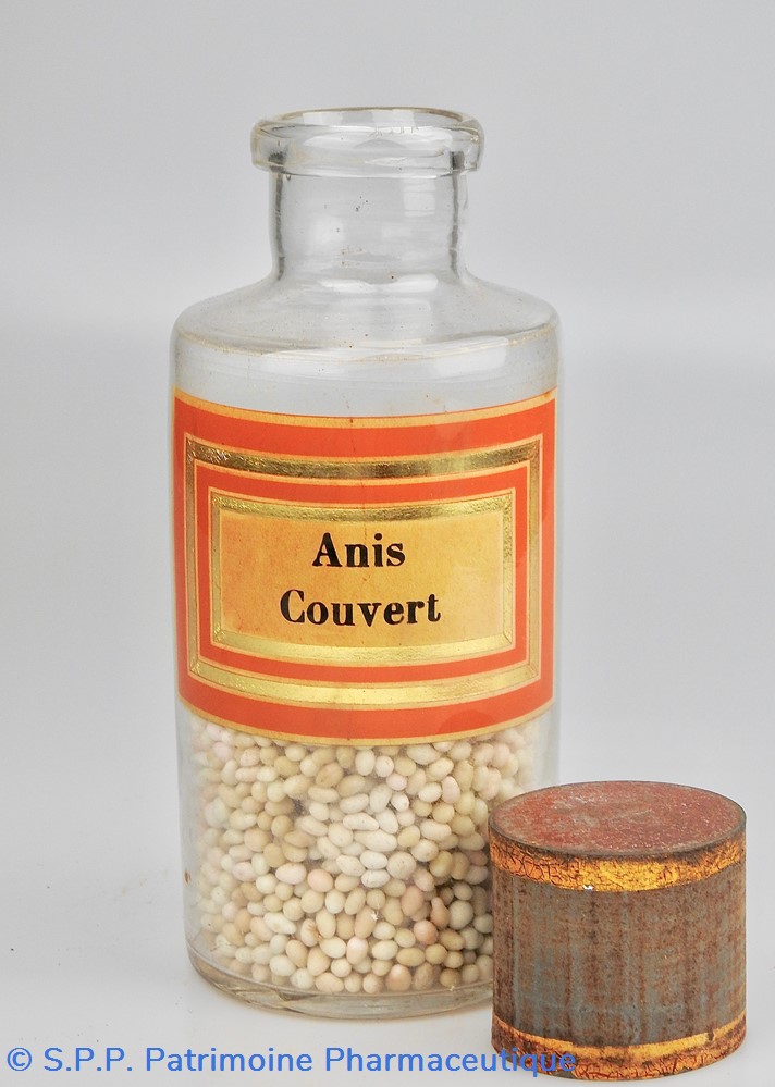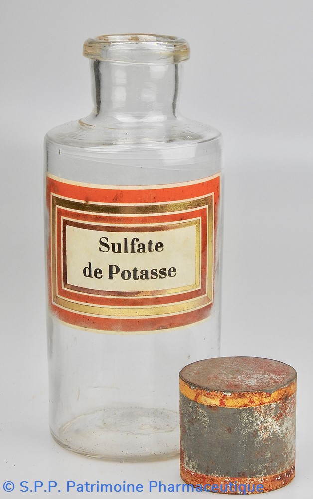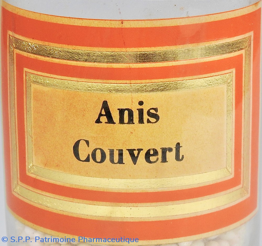 Flacon de pharmacie en verre soufflé avec ouverture en goulot évasé permettant de verser des poudres. Etiquette crème entourée de bandes alternées rouge et or. Le nom est inscrit en noir au milieu d'un rectangle crème au centre de l'étiquette. Nombreuses taches sur l'étiquette.Un couvercle en tôle peinte mais un peu rouillé surmonte le flacon avec un bouchon intérieur en liège. Ce couvercle est décoré à sa base et dans la partie supérieure d'un filet doré. Le flacon est plein au 1/4 de la substance d'origine en très mauvais état.