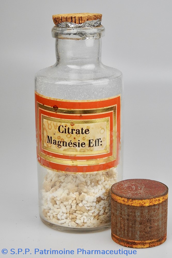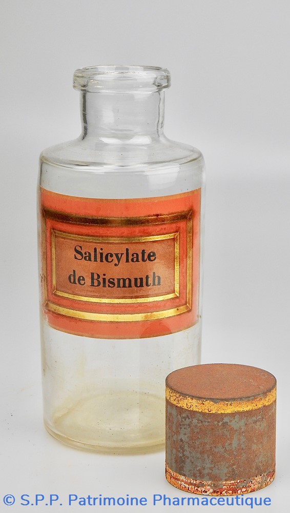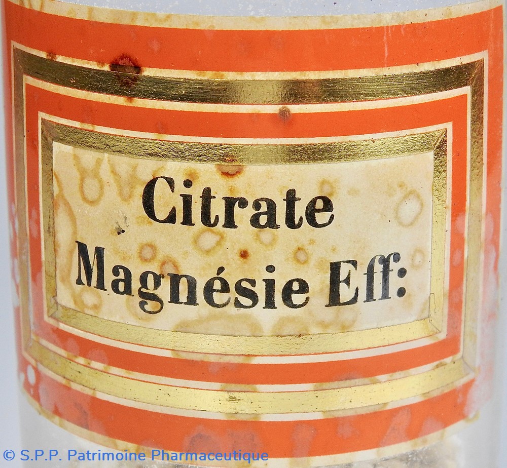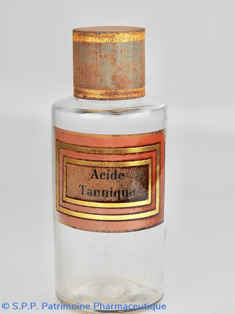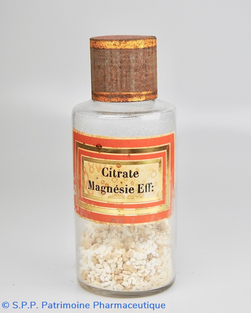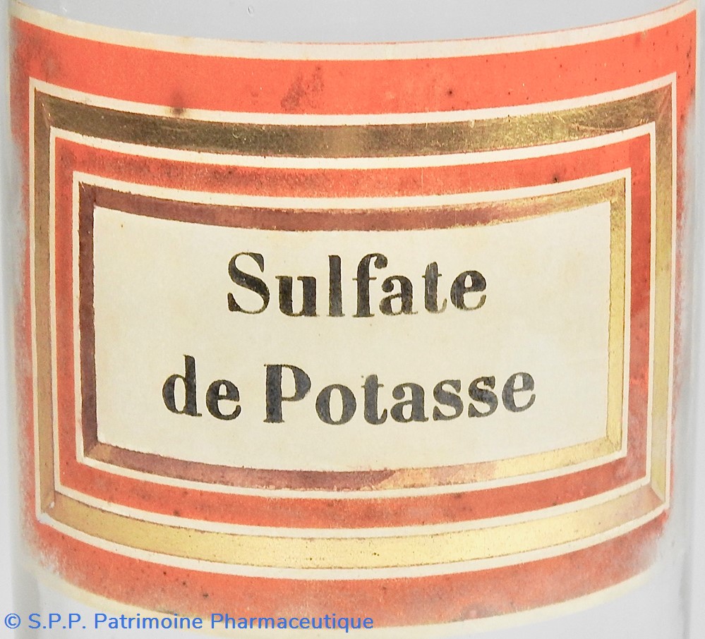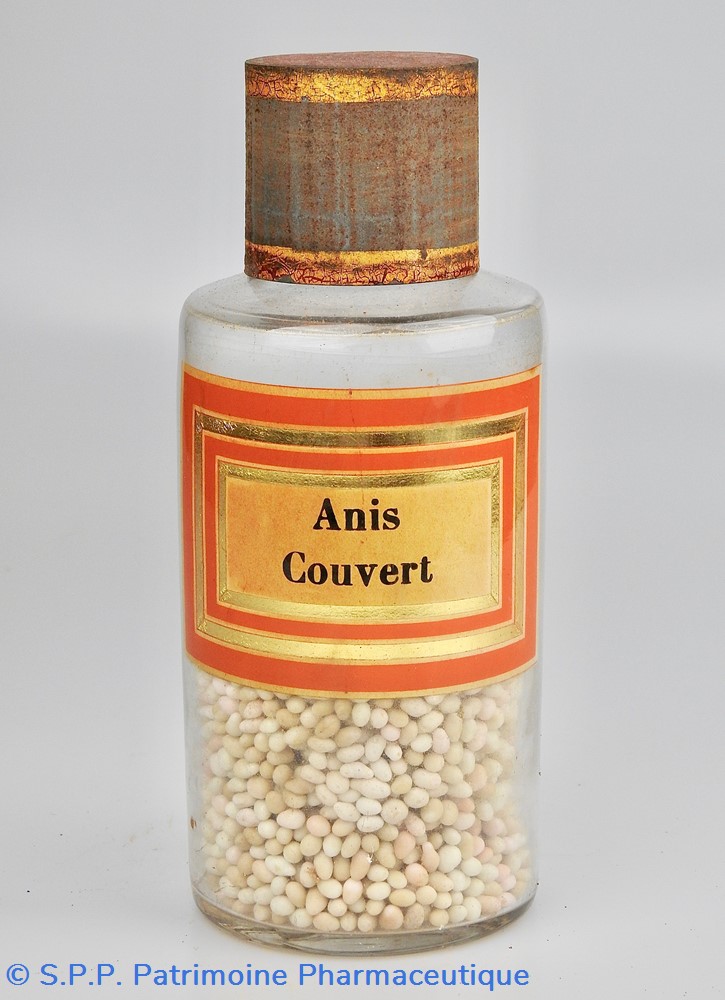 Flacon de pharmacie en verre soufflé avec ouverture en goulot évasé permettant de verser des poudres. Etiquette crème entourée de bandes alternées rouge et or. Le nom est inscrit en noir au milieu d'un rectangle crème au centre de l'étiquette. Nombreuses taches sur l'étiquette.Un couvercle en tôle peinte mais un peu rouillé surmonte le flacon avec un bouchon intérieur en liège. Ce couvercle est décoré à sa base et dans la partie supérieure d'un filet doré. Le flacon est plein au 1/4 de la substance d'origine en très mauvais état.