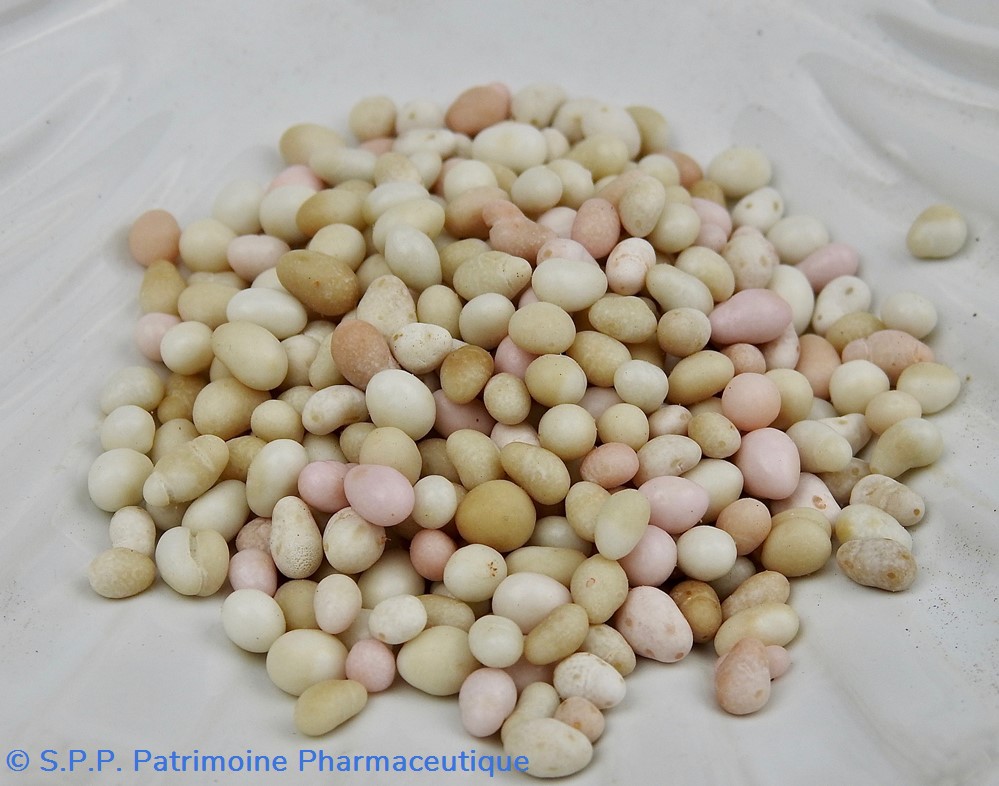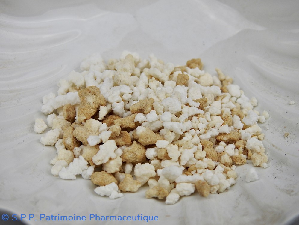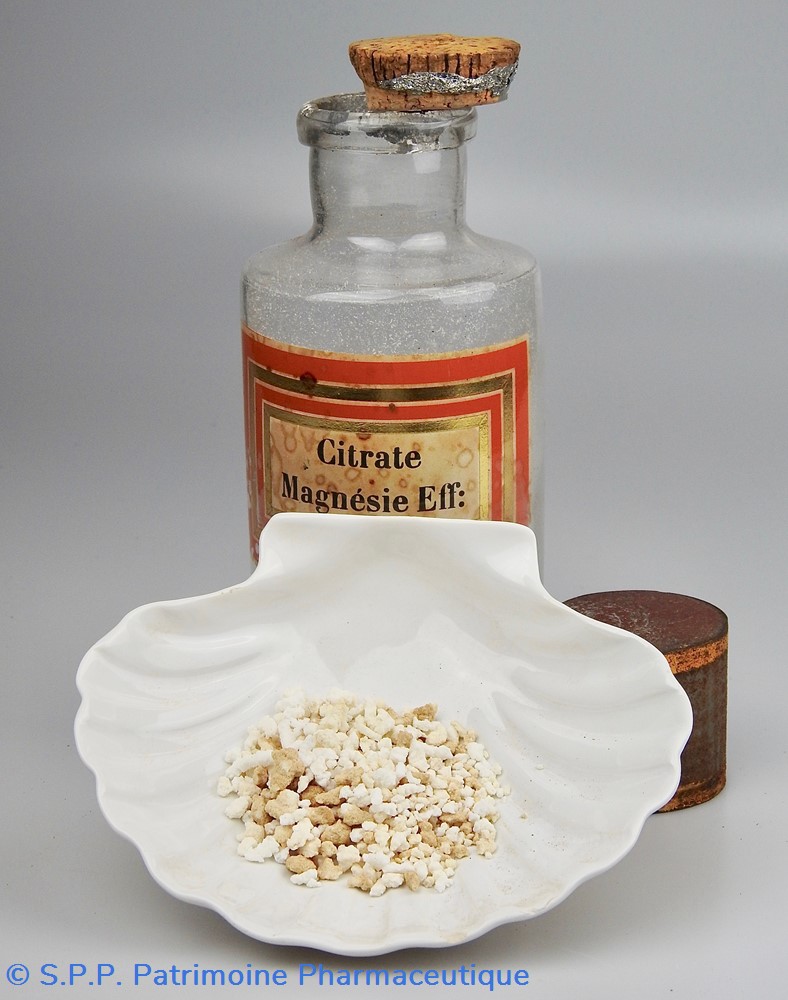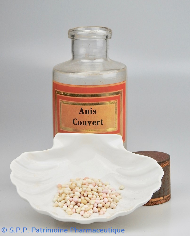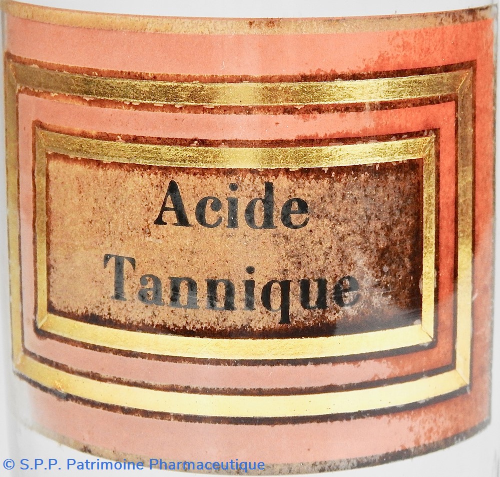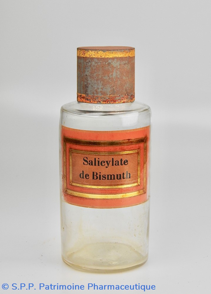 Flacon de pharmacie en verre soufflé avec ouverture en goulot évasé permettant de verser des poudres. Etiquette crème entourée de bandes alternées rouge et or. Le nom est inscrit en noir au milieu d'un rectangle crème au centre de l'étiquette. Nombreuses taches sur l'étiquette.Un couvercle en tôle peinte mais un peu rouillé surmonte le flacon avec un bouchon intérieur en liège. Ce couvercle est décoré à sa base et dans la partie supérieure d'un filet doré. Le flacon est plein au 1/4 de la substance d'origine en très mauvais état.
