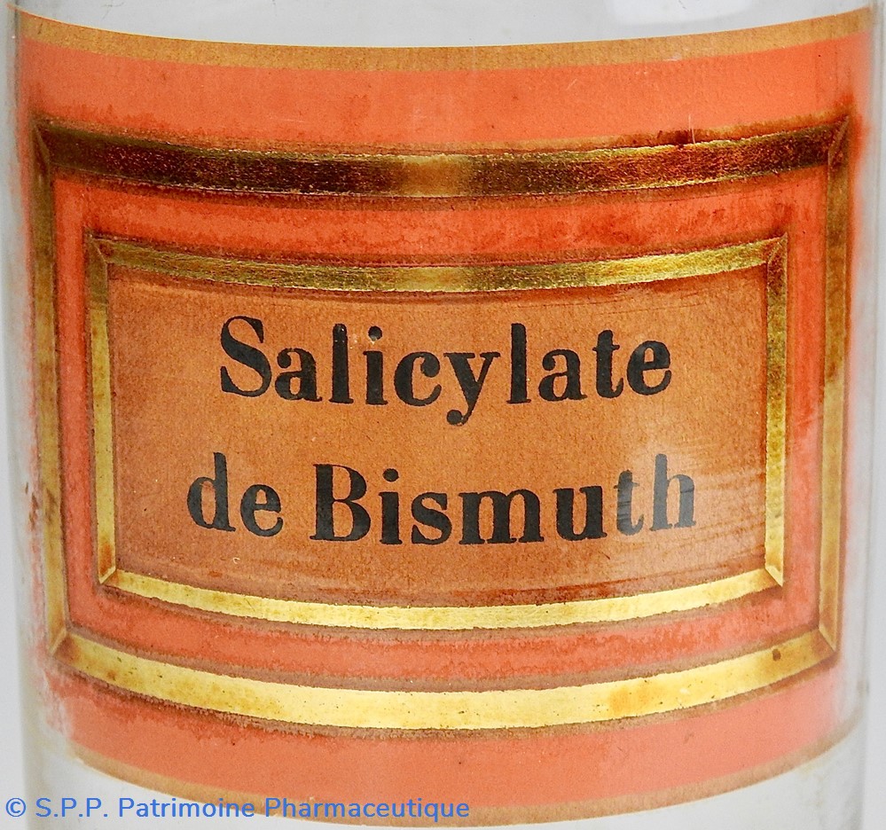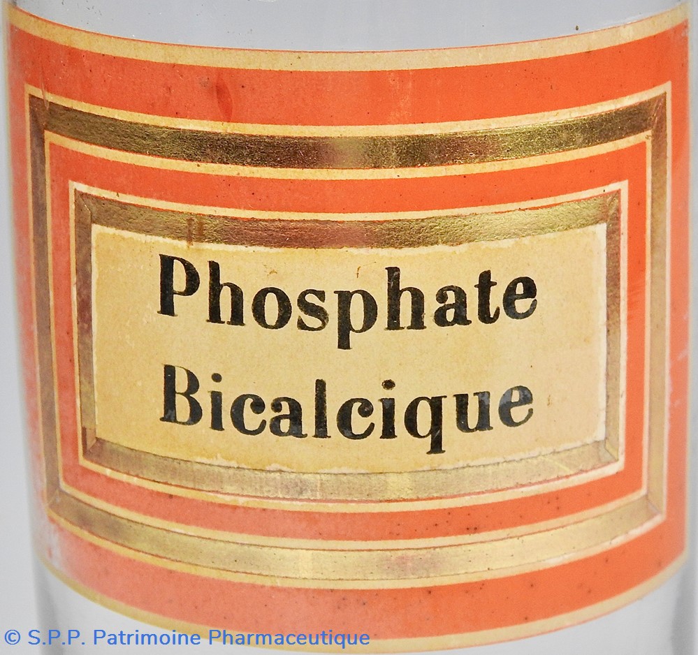 Flacon de pharmacie en verre soufflé avec ouverture en goulot évasé permettant de verser des poudres. Etiquette crème entourée de bandes alternées rouge et or. Le nom est inscrit en noir au milieu d'un rectangle crème au centre de l'étiquette. Un couvercle en tôle peinte mais un peu rouillé surmonte le flacon sans bouchon intérieur. Ce couvercle est décoré à sa base et dans la partie supérieure d'un filet doré. Le flacon est à moitié plein de la substance d'origine.