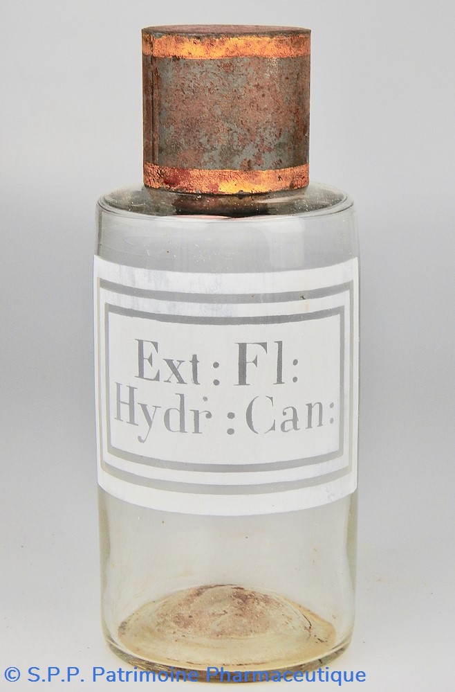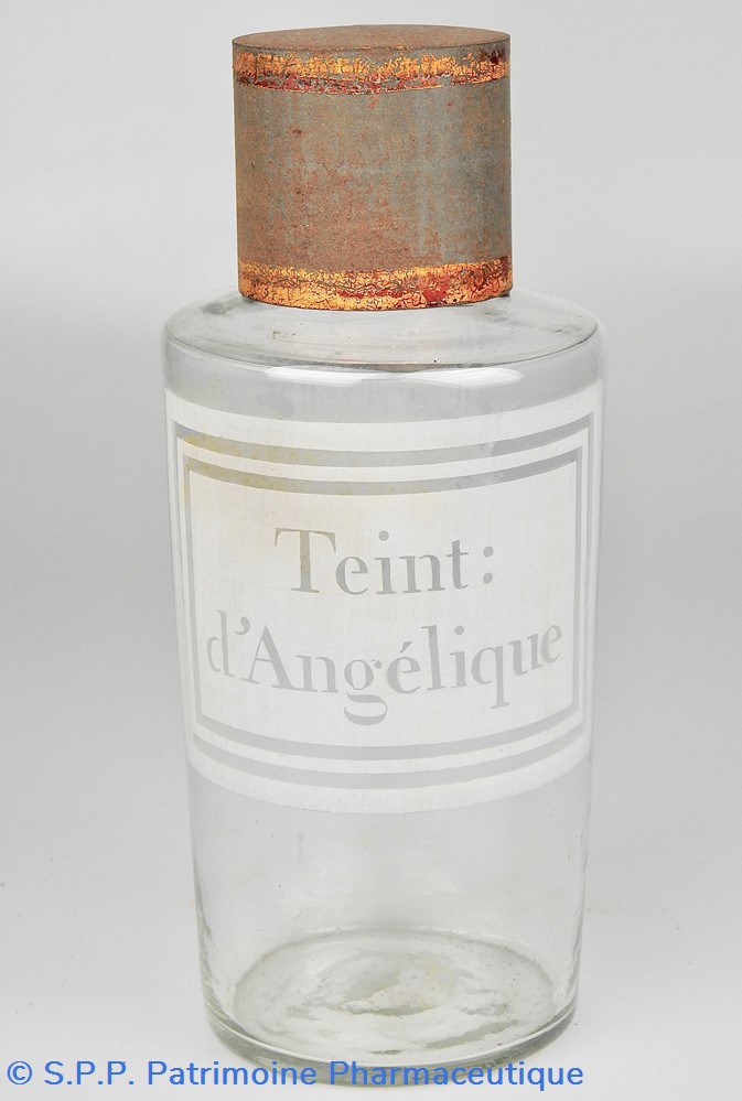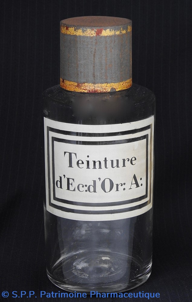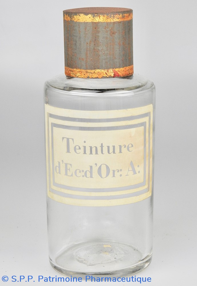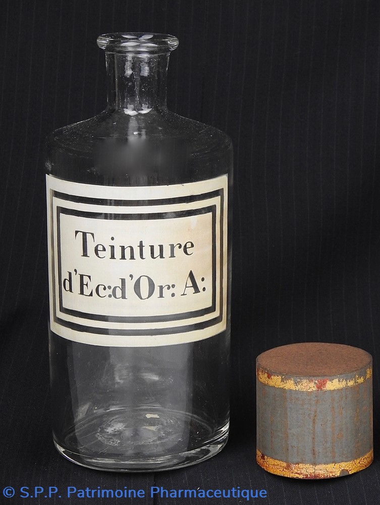 Flacon de pharmacie en verre soufflé avec ouverture en goulot étroit permettant de verser du liquide. Etiquette blanche et transparente sérigraphiée et ornée d'encadrements alternés blancs et transparents. Le nom est inscrit de façon transparente au milieu d'un rectangle blanc. Un couvercle en tôle peinte mais fortement rouillé surmonte le flacon sans bouchon intérieur. Ce couvercle était initialement décoré à sa base et dans la partie supérieure d'un filet doré. Le flacon est vide de substance.