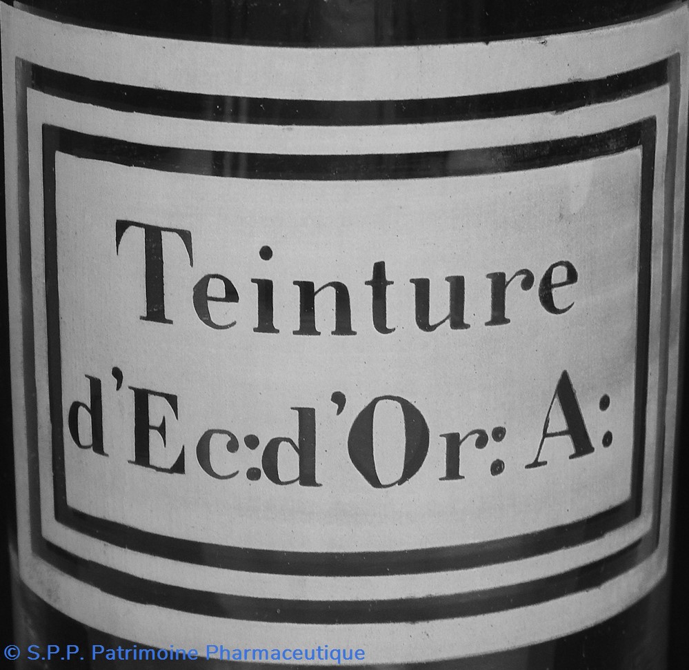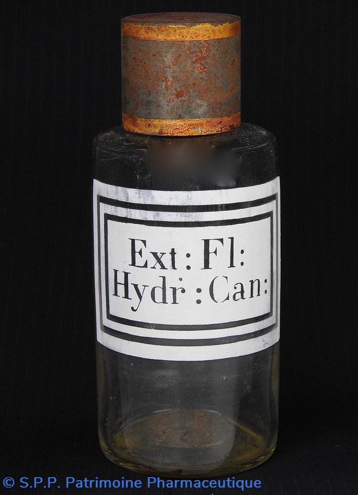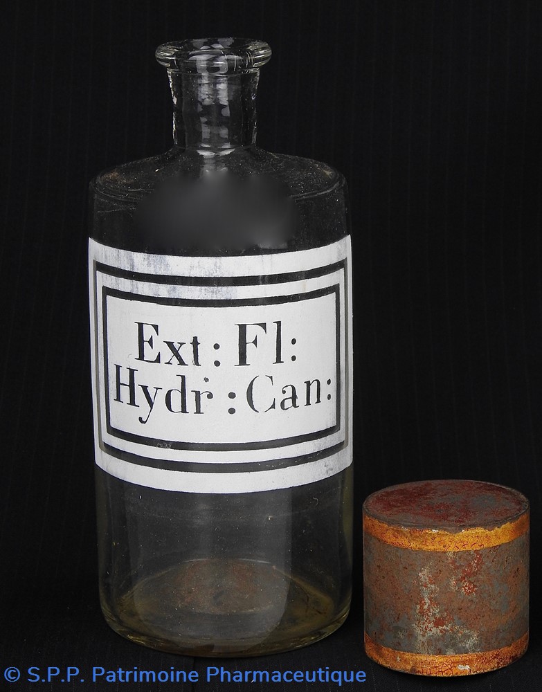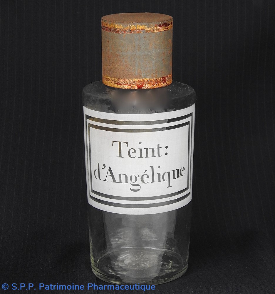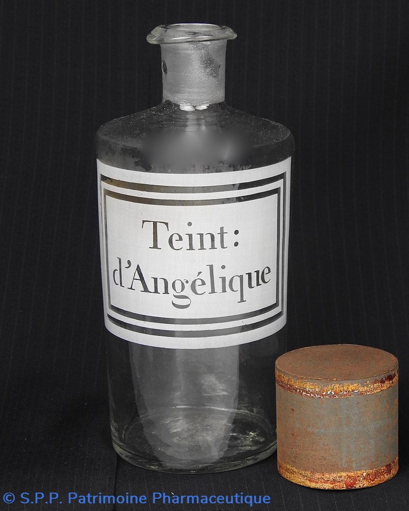 Flacon de pharmacie en verre soufflé avec ouverture en goulot étroit permettant de verser du liquide. Etiquette blanche et transparente sérigraphiée et ornée d'encadrements alternés blancs et transparents. Le nom est inscrit de façon transparente au milieu d'un rectangle blanc. Un couvercle en tôle peinte mais fortement rouillé surmonte le flacon sans bouchon intérieur. Ce couvercle était initialement décoré à sa base et dans la partie supérieure d'un filet doré. Le flacon est vide de substance.