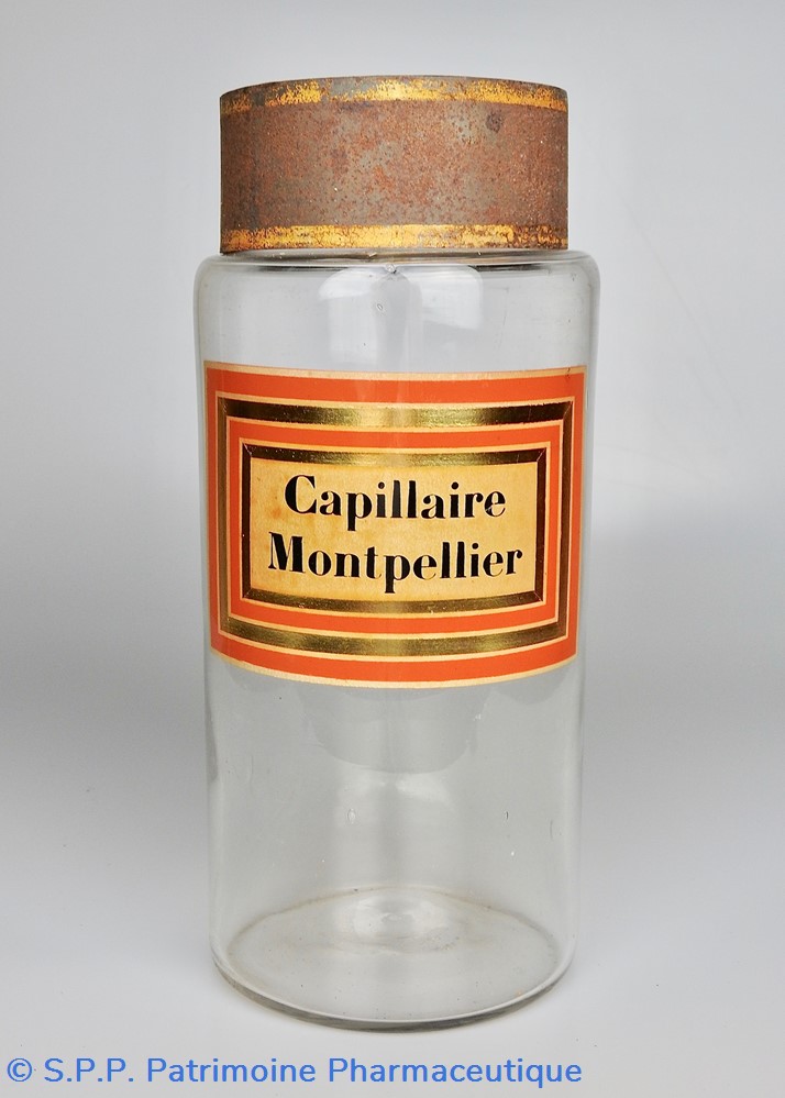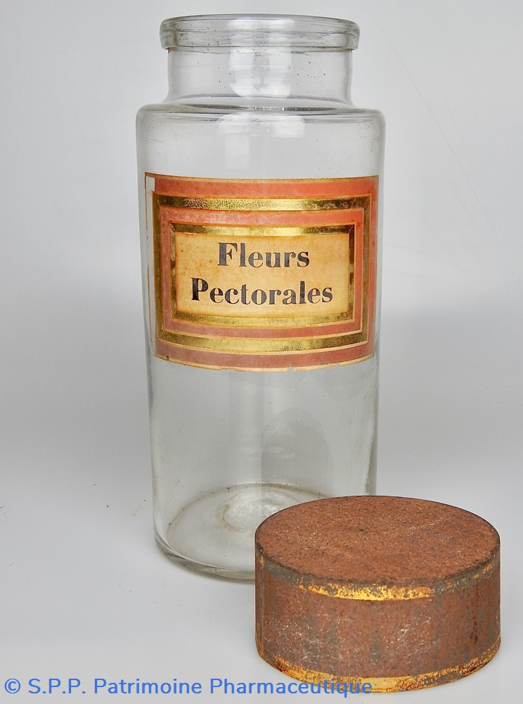 Flacon de pharmacie en verre soufflé à large ouverture supérieure permettant l'introduction facile de plantes. Etiquette collée à l'intérieur très joliment ornée d'encadrements alternés or et rouge. Le nom est inscrit en noir au milieu d'un rectangle beige. Une décoloration est apparente sur le centre de l'étiquette.Un couvercle en tôle peinte mais fortement rouillé surmonte le flacon sans bouchon intérieur. Ce couvercle était initialement décoré à sa base et dans la partie supérieure de filets dorés. Le flacon est vide de plantes.