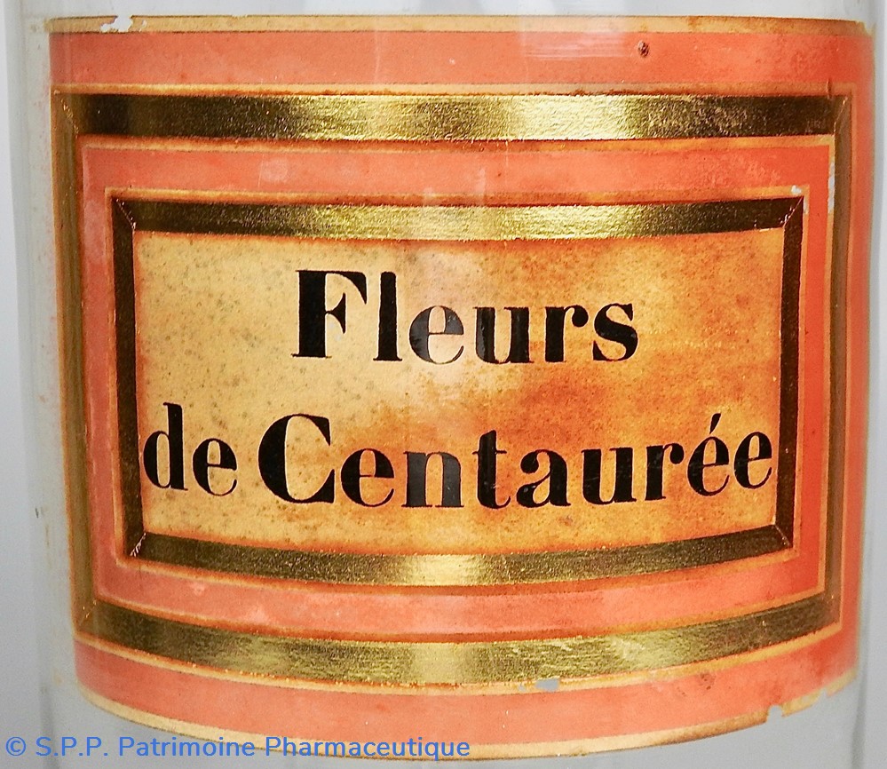 Flacon de pharmacie en verre soufflé à large ouverture supérieure permettant l'introduction facile de plantes. Etiquette collée à l'intérieur très joliment ornée d'encadrements alternés or et rouge. Le nom est inscrit en noir au milieu d'un rectangle beige. L'étiquette comporte des taches rougeâtres au centre.Un couvercle en tôle peinte mais fortement rouillé surmonte le flacon sans bouchon intérieur. Ce couvercle était initialement décoré à sa base et dans la partie supérieure de filets dorés. Le flacon est à moitié rempli de racines.