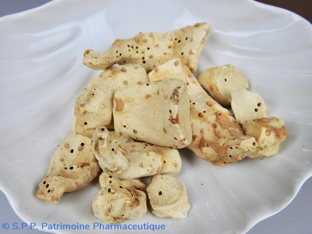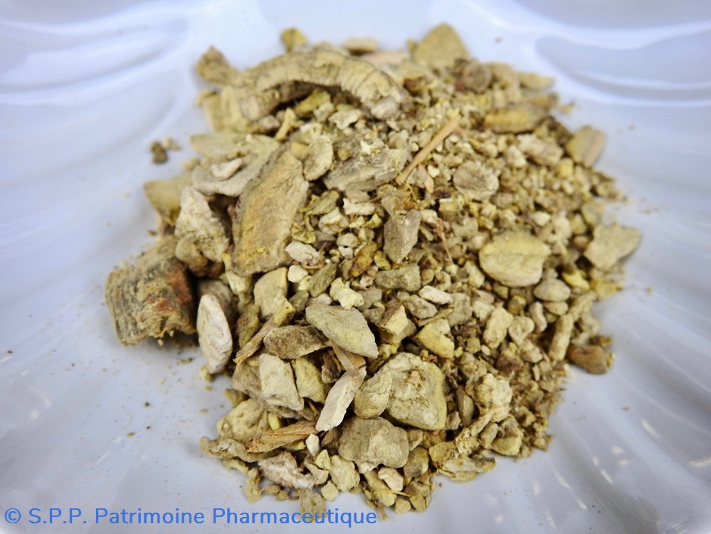 Flacon de pharmacie en verre soufflé à large ouverture supérieure permettant l'introduction facile de plantes. Etiquette collée à l'intérieur très joliment ornée d'encadrements alternés or et rouge. Le nom est inscrit en noir au milieu d'un rectangle beige. Un couvercle en tôle peinte mais fortement rouillé surmonte le flacon sans bouchon intérieur. Ce couvercle était initialement décoré à sa base et dans la partie supérieure de filets dorés. Le flacon est entièrement rempli de racines.Celles-ci sont percées de trous de vers