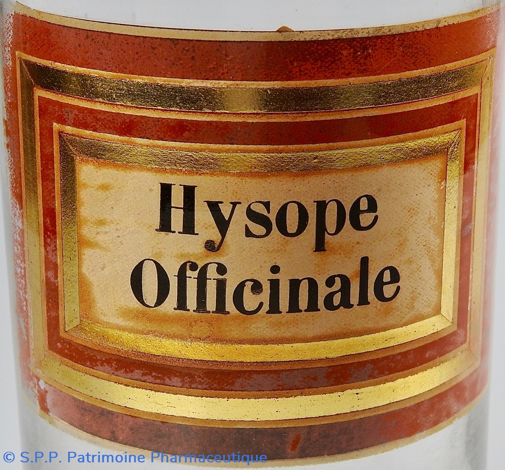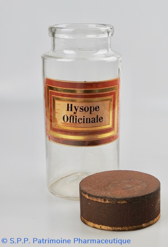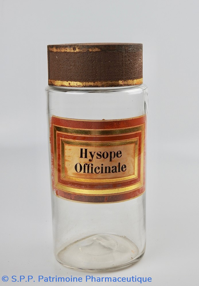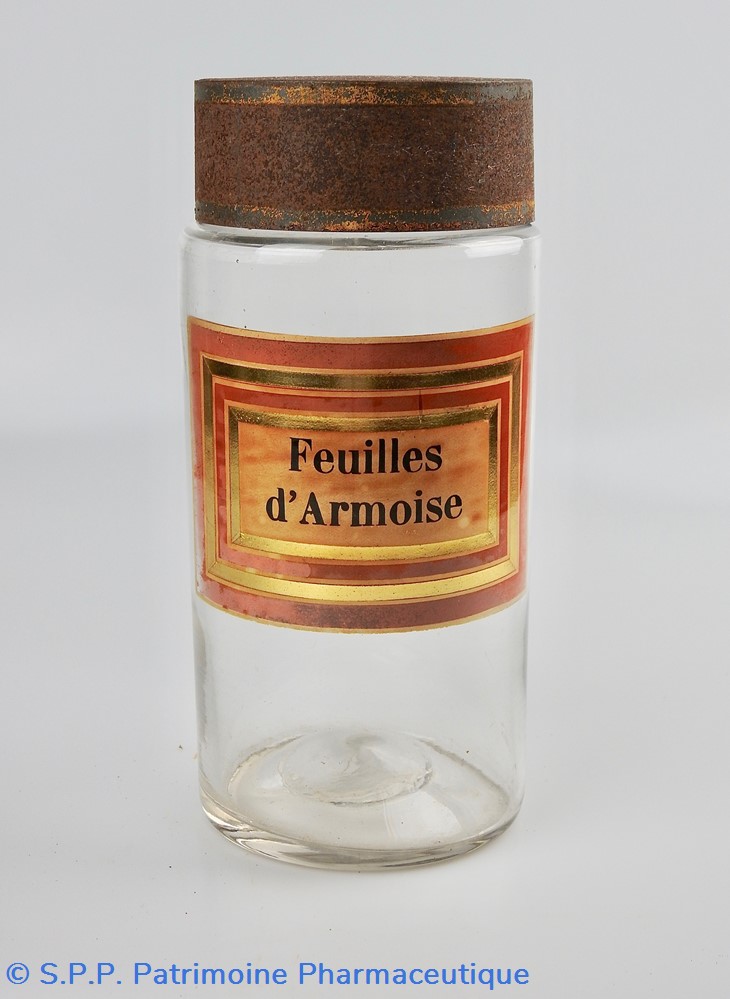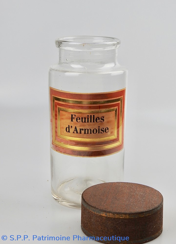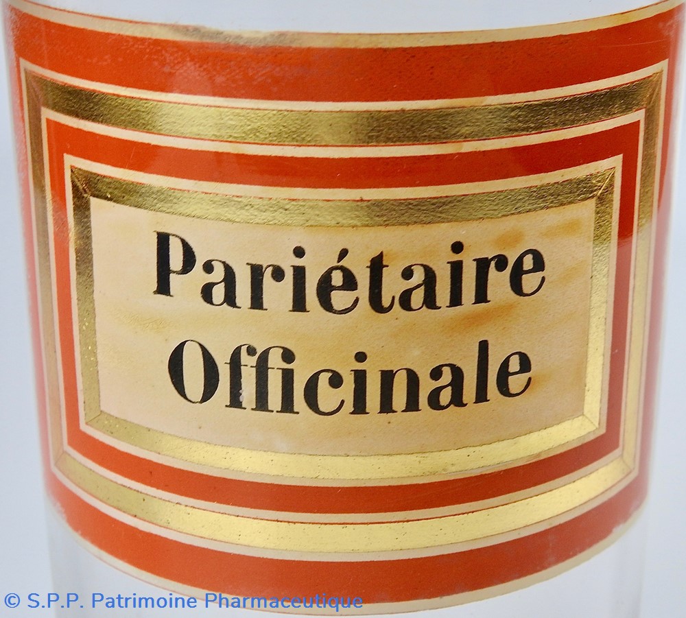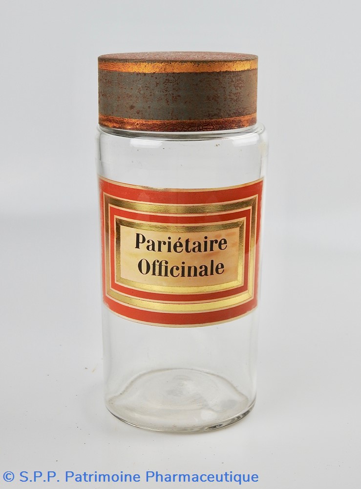 Flacon de pharmacie en verre soufflé à large ouverture supérieure permettant l'introduction facile de plantes. Etiquette collée à l'intérieur très joliment ornée d'encadrements alternés or et rouge. Le nom est inscrit en noir au milieu d'un rectangle beige. Un couvercle en tôle peinte mais fortement rouillé surmonte le flacon sans bouchon intérieur. Ce couvercle était initialement décoré à sa base et dans la partie supérieure de filets dorés. Le flacon est vide de plantes.