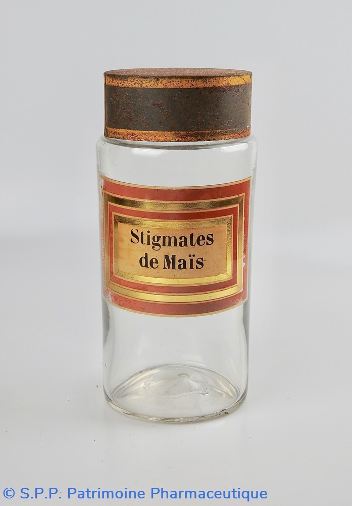 Flacon de pharmacie en verre soufflé à large ouverture supérieure permettant l'introduction facile de plantes. Etiquette collée à l'intérieur très joliment ornée d'encadrements alternés or et rouge. Le nom est inscrit en noir au milieu d'un rectangle beige. L'étiquette est un peu abimée sur le côté gauche en regardant le flacon. Un couvercle en tôle peinte mais fortement rouillé surmonte le flacon sans bouchon intérieur. Ce couvercle était initialement décoré à sa base et dans la partie supérieure de filets dorés. Le flacon est vide de plantes.