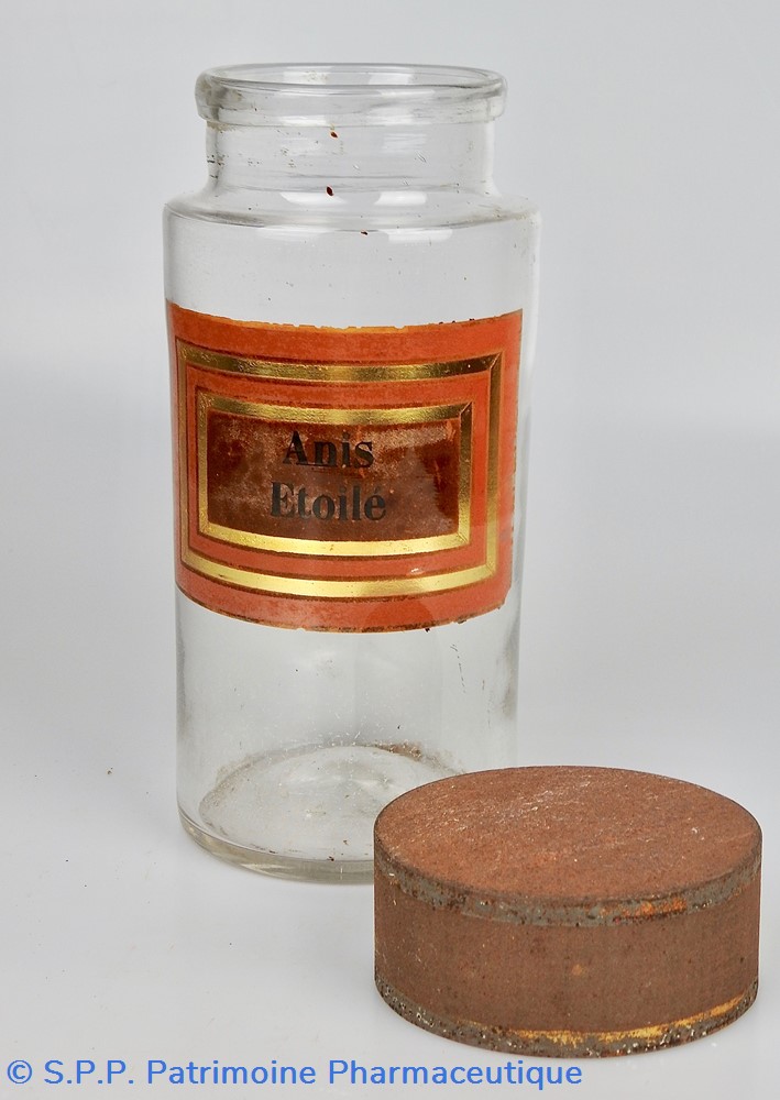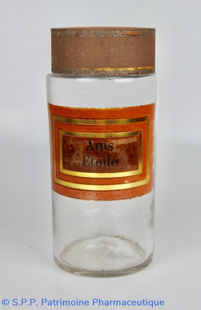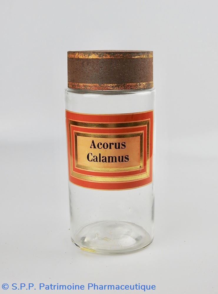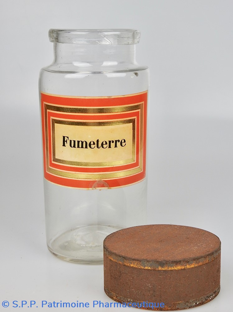 Flacon de pharmacie en verre soufflé à large ouverture supérieure permettant l'introduction facile de plantes. Etiquette collée à l'intérieur très joliment ornée d'encadrements alternés or et rouge. Le nom est inscrit en noir au milieu d'un rectangle beige. Un couvercle en tôle peinte mais fortement rouillé surmonte le flacon sans bouchon intérieur. Ce couvercle était initialement décoré à sa base et dans la partie supérieure de filets dorés. Le flacon est vide de plantes.