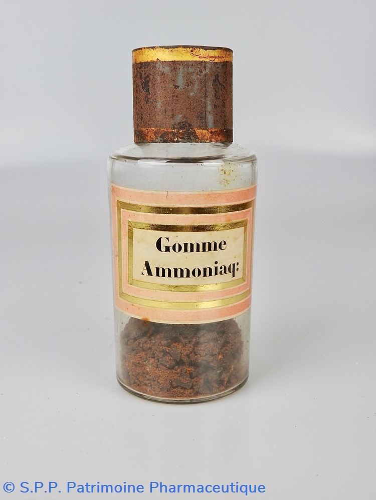 Flacon de pharmacie en verre soufflé avec ouverture en goulot évasé permettant de verser des poudres. Etiquette crème entourée de bandes alternées rouge et or. Le nom est inscrit en noir au milieu d'un rectangle crème au centre de l'étiquette. L'étiquette est un peu assombrie par son contenu. Un couvercle en tôle peinte mais un peu rouillé surmonte le flacon sans bouchon intérieur. Ce couvercle est décoré à sa base et dans la partie supérieure d'un filet doré. Le flacon est à moitié plein de la substance d'origine.
