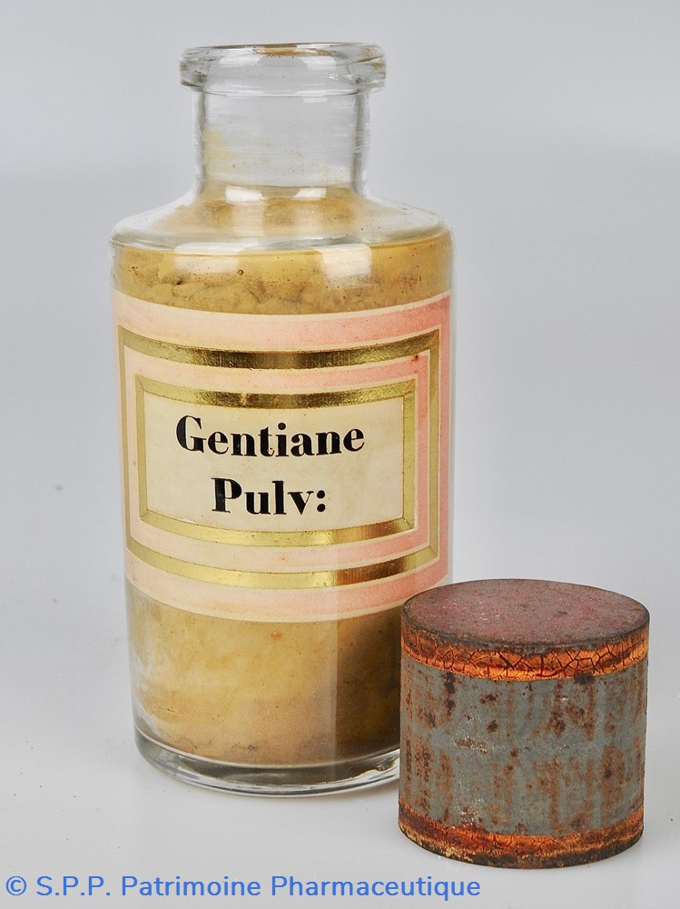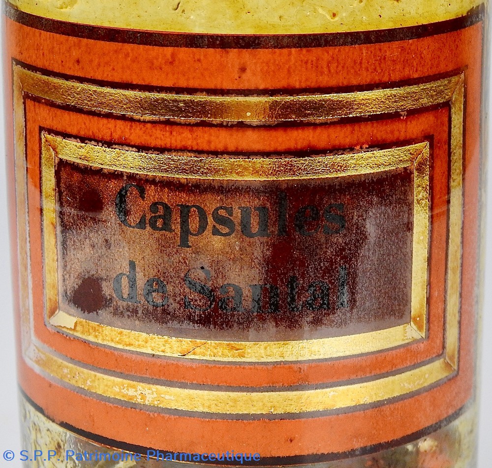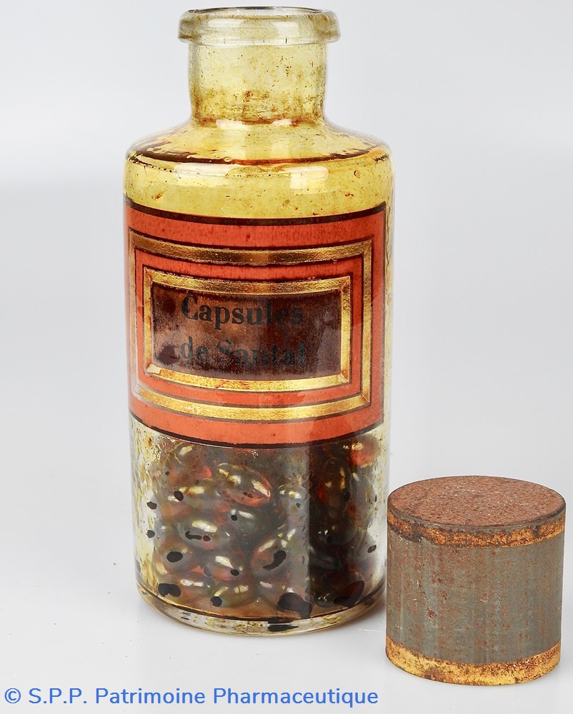 Flacon de pharmacie en verre soufflé avec ouverture en goulot évasé permettant de verser des poudres. Etiquette crème entourée de bandes alternées rouge et or. Le nom est inscrit en noir au milieu d'un rectangle crème au centre de l'étiquette. L'étiquette est pratiquement illisible. Un couvercle en tôle peinte mais un peu rouillé surmonte le flacon sans bouchon intérieur. Ce couvercle est décoré à sa base et dans la partie supérieure d'un filet doré. Le flacon est à moitié plein de la substance d'origine.