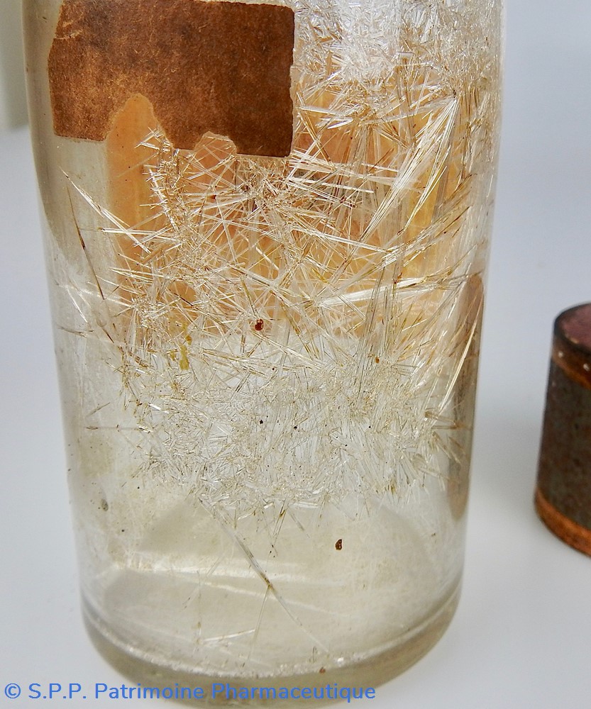 Flacon de pharmacie en verre soufflé avec ouverture en goulot évasé permettant de verser des poudres. Etiquette crème entourée de bandes alternées rouge et or. Le nom est inscrit en noir au milieu d'un rectangle crème au centre de l'étiquette. Les couleurs de l'étiquette sont délavées. Un couvercle en tôle peinte mais un peu rouillé surmonte le flacon sans bouchon intérieur. Ce couvercle est décoré à sa base et dans la partie supérieure d'un filet doré. Le flacon contient encore aux 1/4 la substance d'origine.