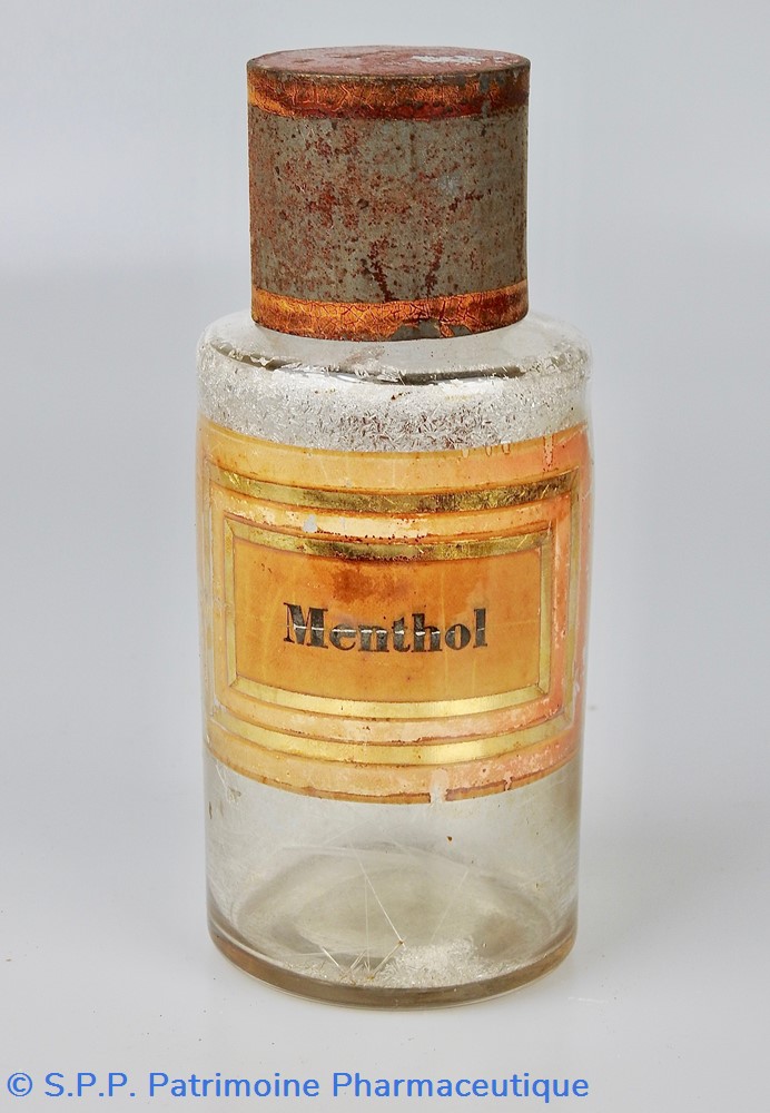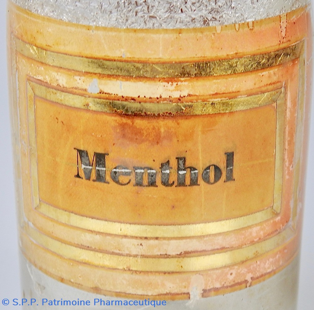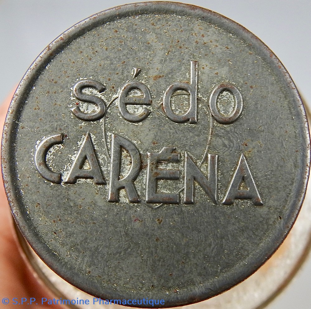 Flacon de pharmacie en verre soufflé avec ouverture en goulot évasé permettant de verser des poudres. Etiquette crème entourée de bandes alternées rouge et or. Le nom est inscrit en noir au milieu d'un rectangle crème au centre de l'étiquette. Les couleurs de l'étiquette sont délavées. Un couvercle en tôle peinte mais un peu rouillé surmonte le flacon sans bouchon intérieur. Ce couvercle est décoré à sa base et dans la partie supérieure d'un filet doré. Le goulot est obturé par le couvercle d'une boite de médicament intitulée "Sedo Carena" Le flacon ne contient plus la substance d'origine, mais de nombreuses arborescences de cristaux de menthol sont encore présentes sur la paroi interne du flacon.
