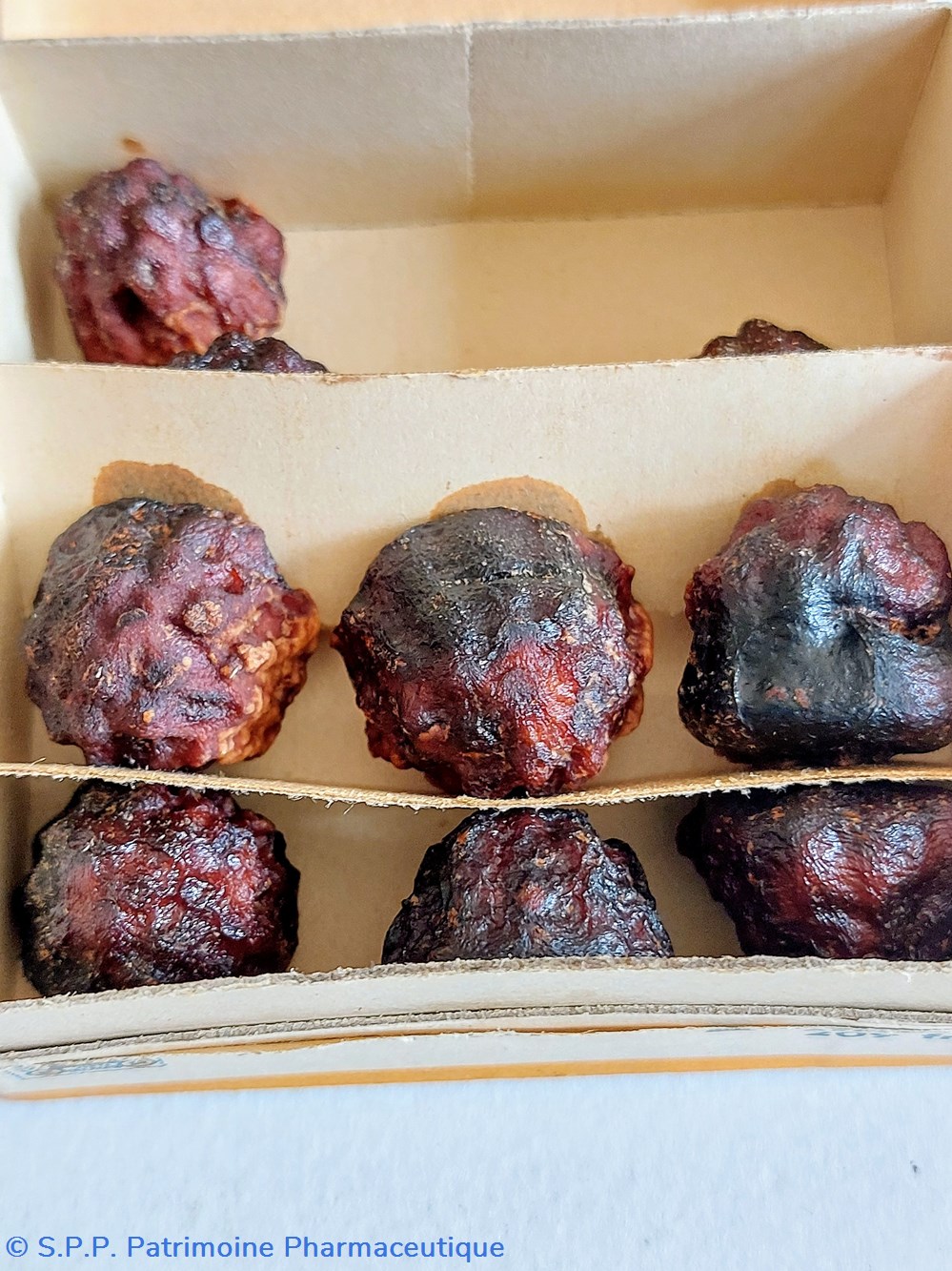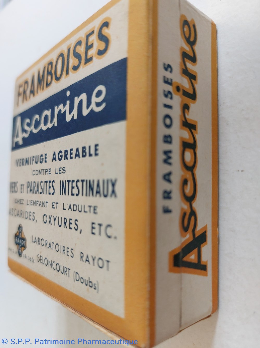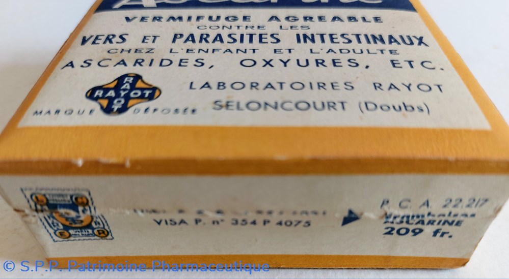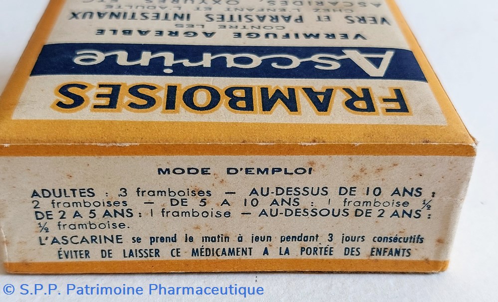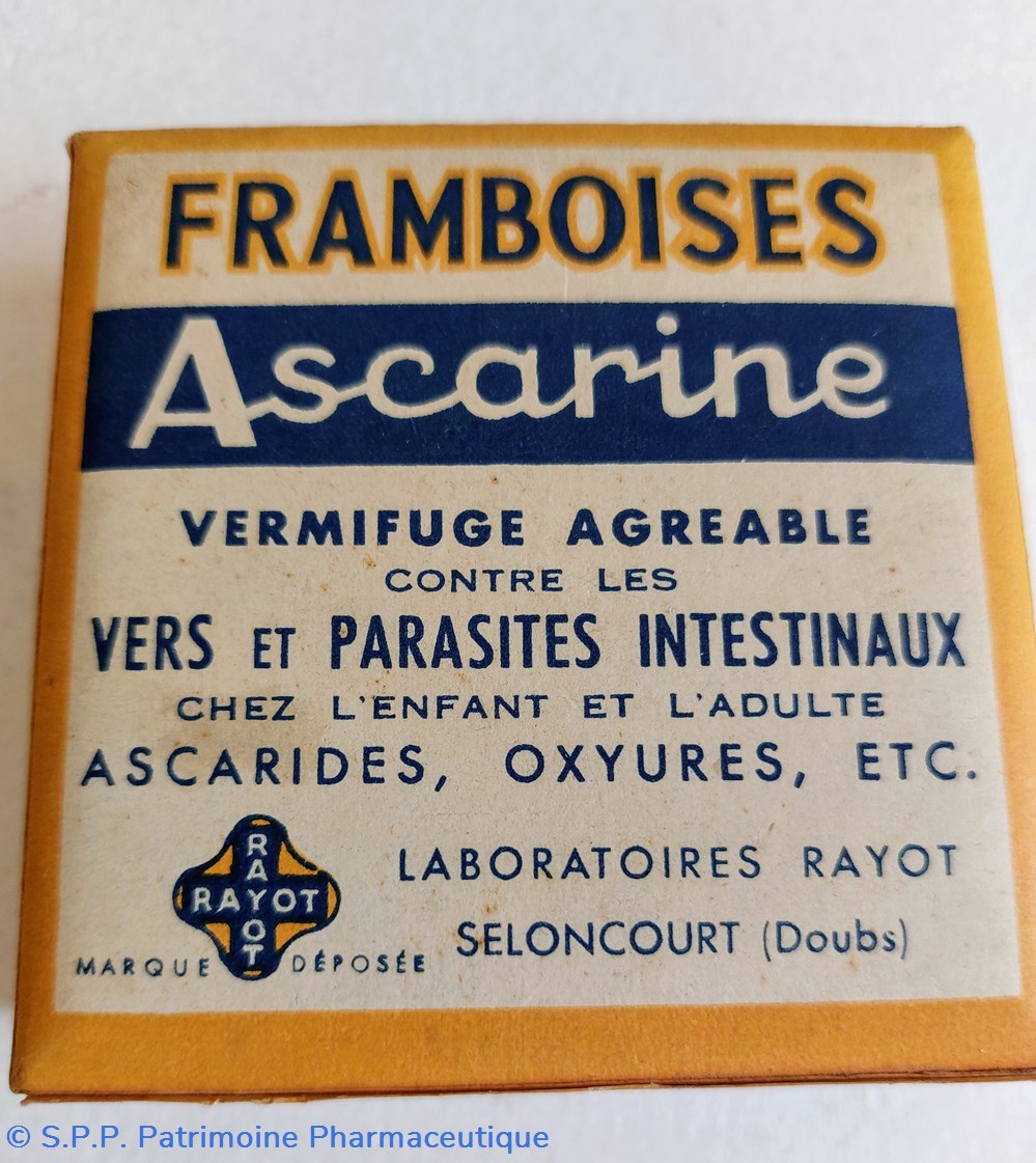 Coffret en carton 8*8 *3 cm contenant des framboises traitées pour en faire " Un Vermifuge agréable ASCARINE contre les vers et les parasites intestinaux " , Ascarides, Oxyures ... Existe sous d'autres formes Granulés, Paquets, Framboises, Comprimés et Chocolat ASCARINE .