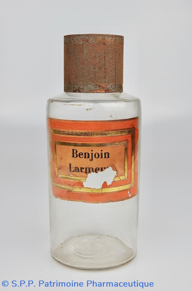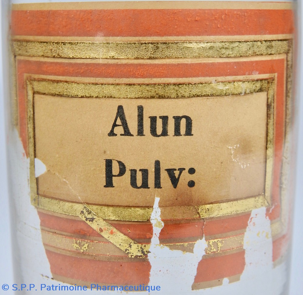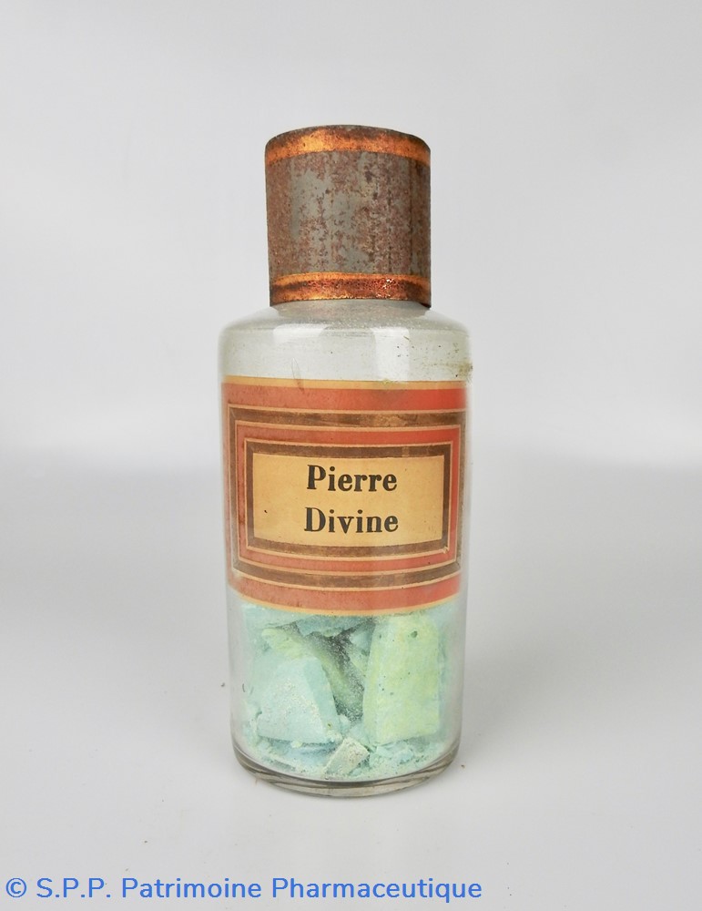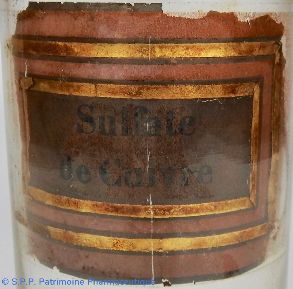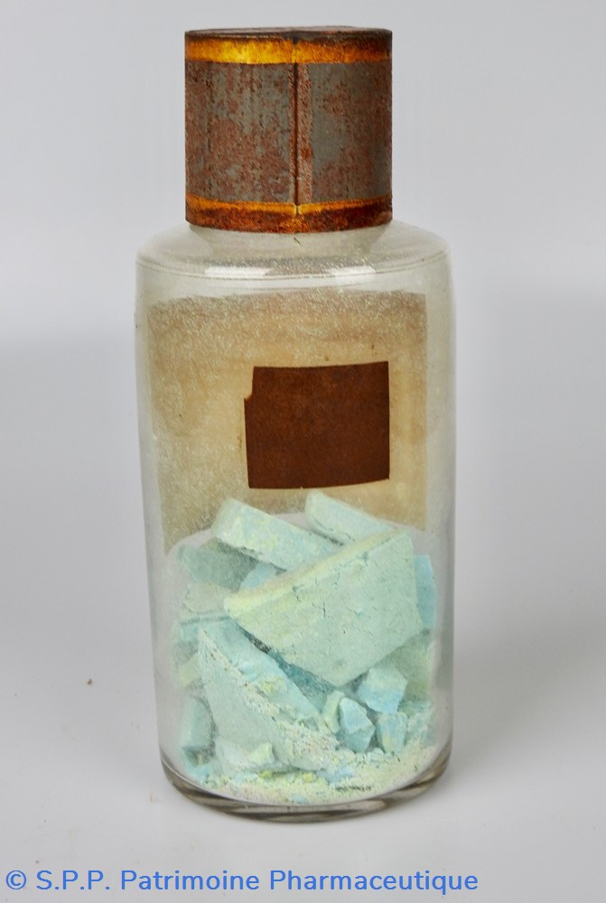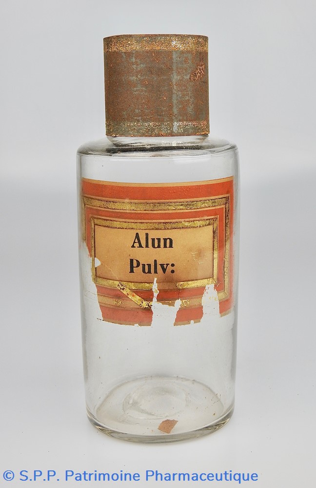 Flacon de pharmacie en verre soufflé avec ouverture en goulot évasé permettant de verser des poudres. Etiquette crème entourée de bandes alternées rouge et or. Le nom est inscrit en noir au milieu d'un rectangle crème au centre de l'étiquette. L'étiquette est fortement endommagée aussi bien du point de vue des coloris que dans sa texture. Le nom inscrit est pratiquement illisibleUn couvercle en tôle peinte mais rouillé surmonte le flacon sans bouchon intérieur. Ce couvercle était initialement décoré à sa base et dans la partie supérieure d'un filet doré. Le flacon est vide de substance.