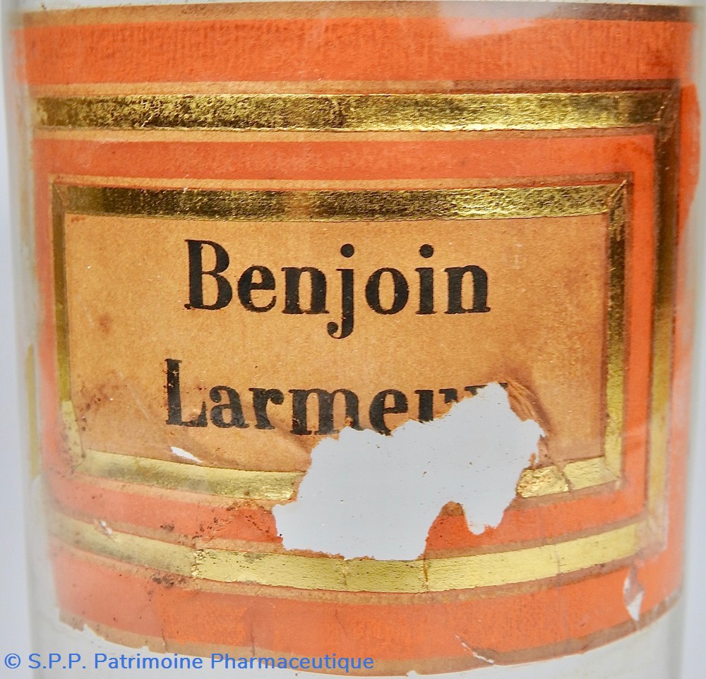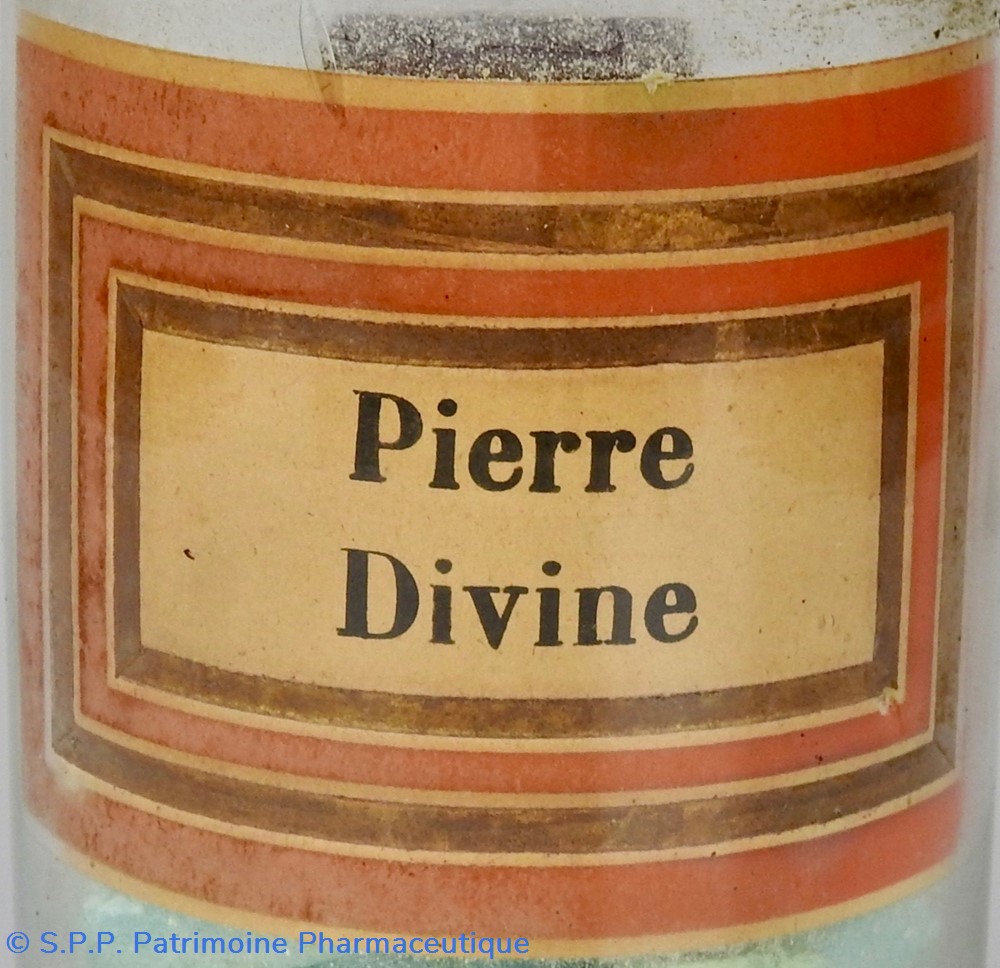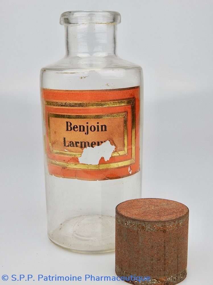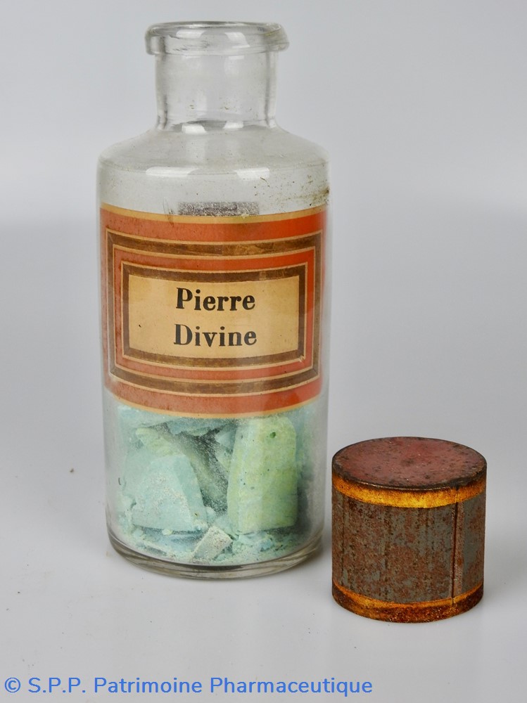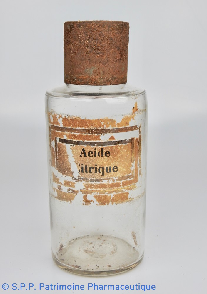 Flacon de pharmacie en verre soufflé avec ouverture en goulot évasé permettant de verser des poudres. Etiquette crème entourée de bandes alternées rouge et or. Le nom est inscrit en noir au milieu d'un rectangle crème au centre de l'étiquette. L'étiquette est fortement endommagée aussi bien du point de vue des coloris que dans sa texture. Le nom inscrit est pratiquement illisibleUn couvercle en tôle peinte mais rouillé surmonte le flacon sans bouchon intérieur. Ce couvercle était initialement décoré à sa base et dans la partie supérieure d'un filet doré. Le flacon est vide de substance.