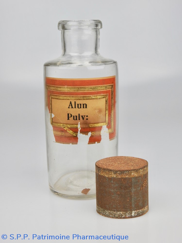 Flacon de pharmacie en verre soufflé avec ouverture en goulot évasé permettant de verser des poudres. Etiquette crème entourée de bandes alternées rouge et or. Le nom est inscrit en noir au milieu d'un rectangle crème au centre de l'étiquette. Le bas de l'étiquette est fortement endommagé. Un couvercle en tôle peinte mais fortement rouillé surmonte le flacon sans bouchon intérieur. Ce couvercle était initialement décoré à sa base et dans la partie supérieure d'un filet doré. Le flacon est vide de substance.