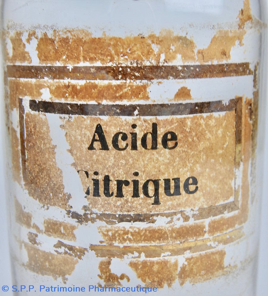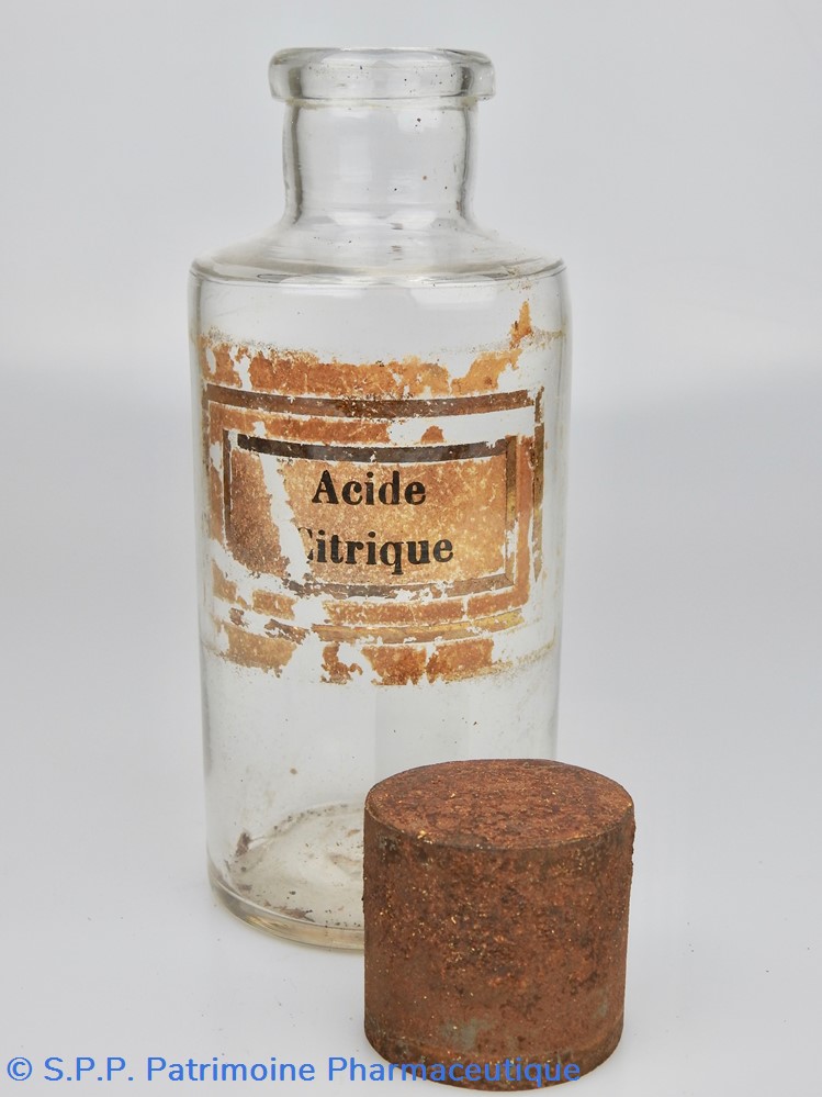 Flacon de pharmacie en verre soufflé avec ouverture en goulot évasé permettant de verser des poudres. Etiquette crème entourée de bandes alternées rouge et or. Le nom est inscrit en noir au milieu d'un rectangle crème au centre de l'étiquette . L'étiquette est très endommagée aussi bien du point de vue des couleurs que de sa texture. Un couvercle en tôle peinte mais fortement rouillé surmonte le flacon sans bouchon intérieur. Ce couvercle était initialement décoré à sa base et dans la partie supérieure d'un filet doré. Le flacon est vide de substance.