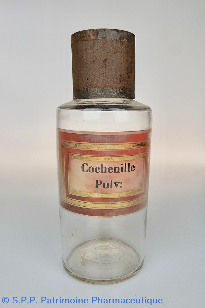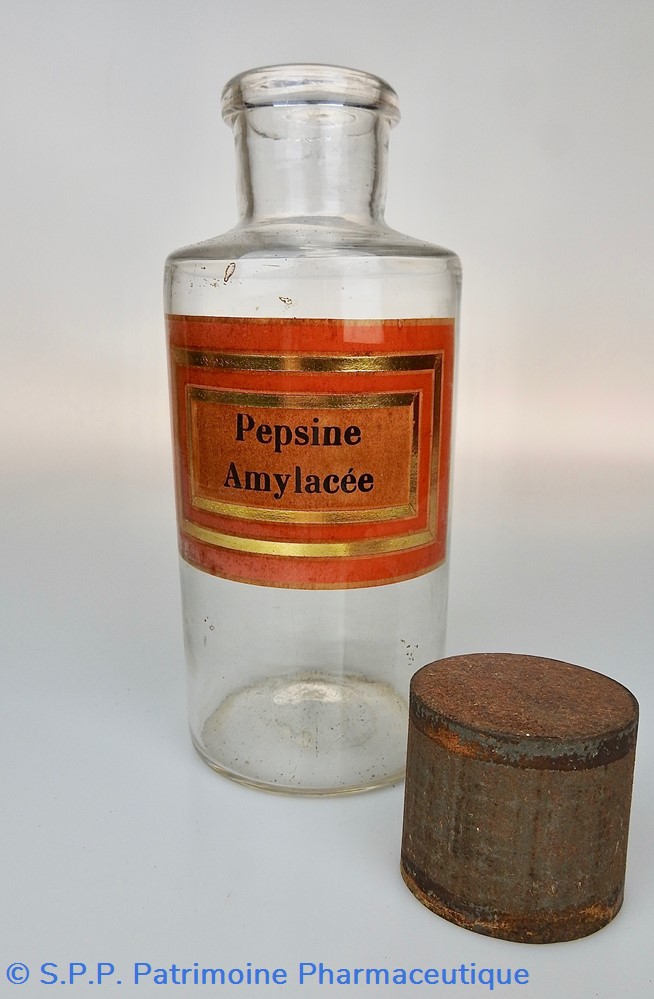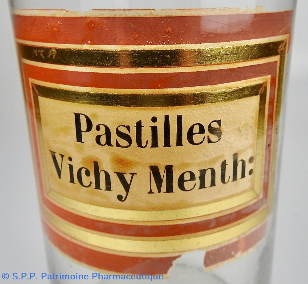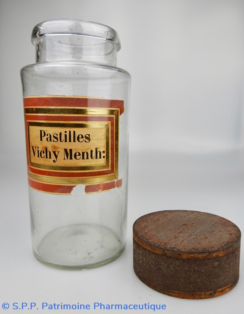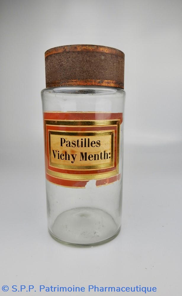 Flacon de pharmacie en verre soufflé à large ouverture supérieure permettant l'introduction facile de pastilles. Etiquette assez abimée, collée à l'intérieur très joliment ornée d'encadrements alternés or et rouge. Le nom est inscrit en noir au milieu d'un rectangle beige. L'étiquette est endommagée dans la partie inférieure au milieuet sur le bord droit.Un couvercle en tôle peinte mais fortement rouillé surmonte le flacon sans bouchon intérieur. Ce couvercle était initialement décoré à sa base et dans la partie supérieure d'un filet doré. Le flacon est vide de toute substance.