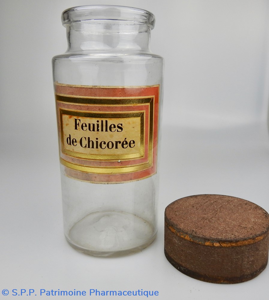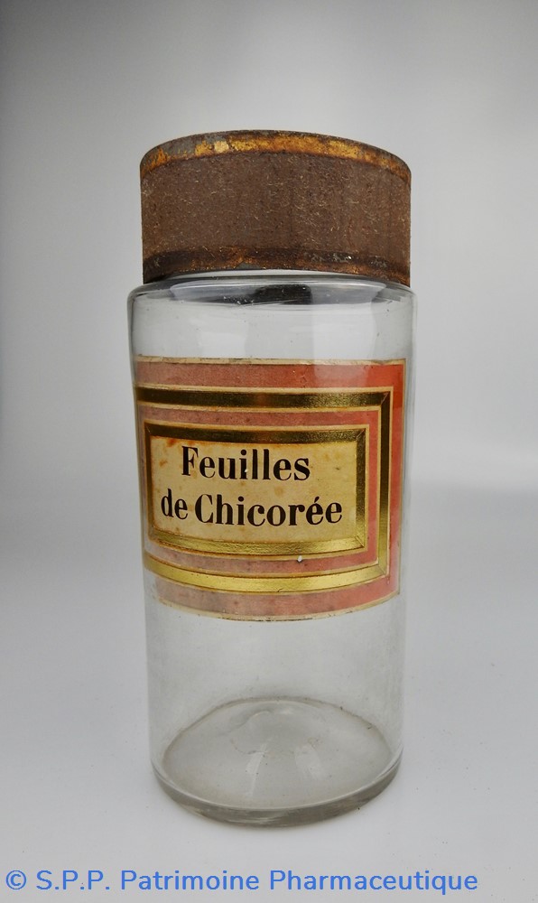 Flacon de pharmacie en verre soufflé à large ouverture supérieure permettant l'introduction facile de plantes. Etiquette collée à l'intérieur très joliment ornée d'encadrements alternés or et rouge. Le nom est inscrit en noir au milieu d'un rectangle beige. L'étiquette est un peu décolorée. Un couvercle en tôle peinte mais fortement rouillé surmonte le flacon sans bouchon intérieur. Ce couvercle était initialement décoré à sa base et dans la partie supérieure d'un filet doré. Le flacon est vide de toute substance.