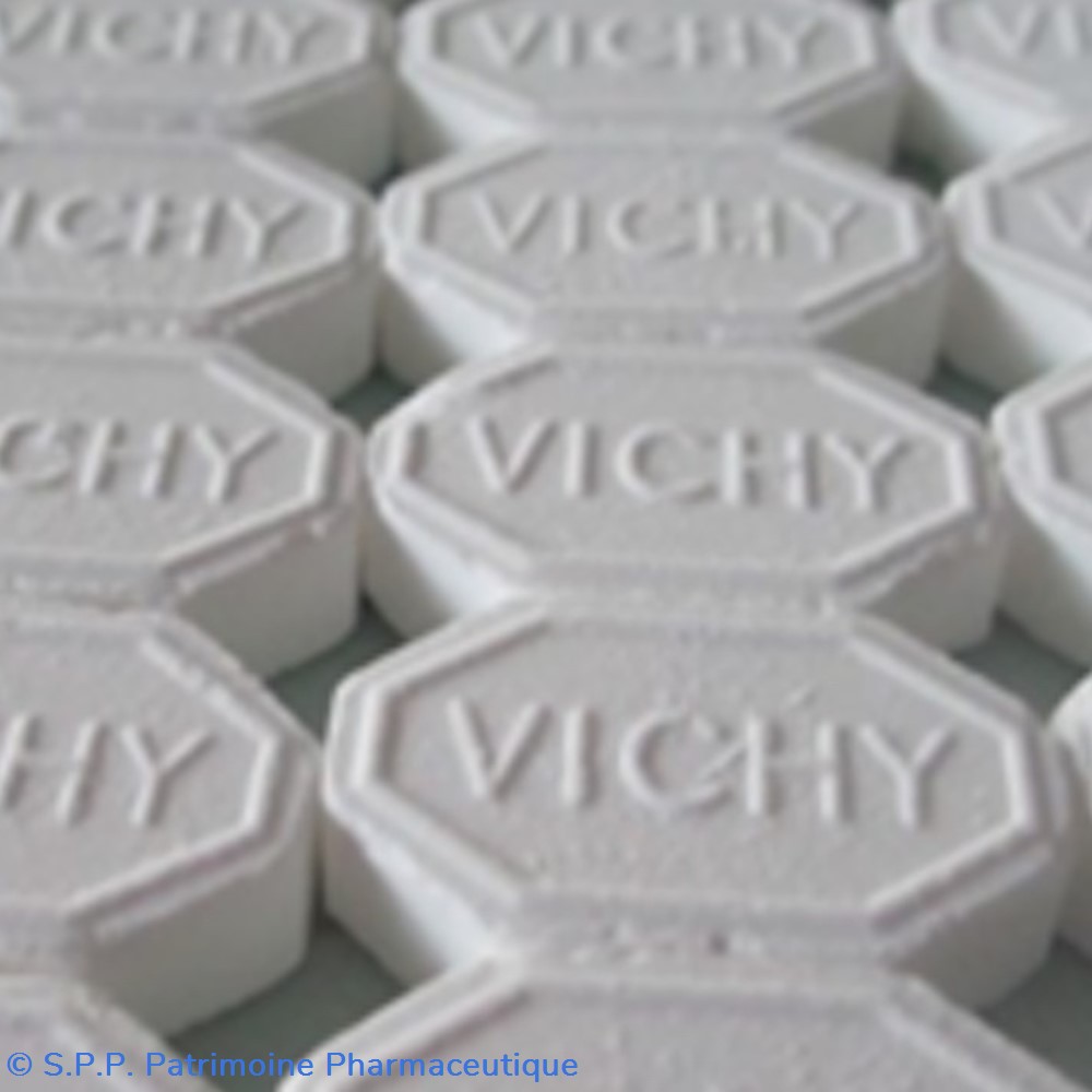 C'est en 1825 que le chimiste Jean-Pierre Joseph d'Arcet ( 1777-1844) crée les pastilles de Vichy à partir des sels minéraux contenus dans les eaux thermales de la ville. Il est aidé dans ses recherches par le pharmacien de l'Etablissement Thermal Pierre Barilliat (1788-1851)Les sources de Vichy renferment une quantité importante de Bicarbonate de soude, des sels de calcium et de magnésium ainsi que des oligo-éléments aux effets synergiques. Depuis 1853, ces sels minéraux sont exploités par la Compagnie de Vichy. Les Pastilles de Vichy sont reconnues par décret impérial par Napoléon III pour leur capacité à soigner les troubles digestifs. Elles étaient du reste très appréciées par l'Impératrice Eugénie. .Elles sont inscrites au Codex de 1837 et vendues comme médicament jusqu'en 1914.